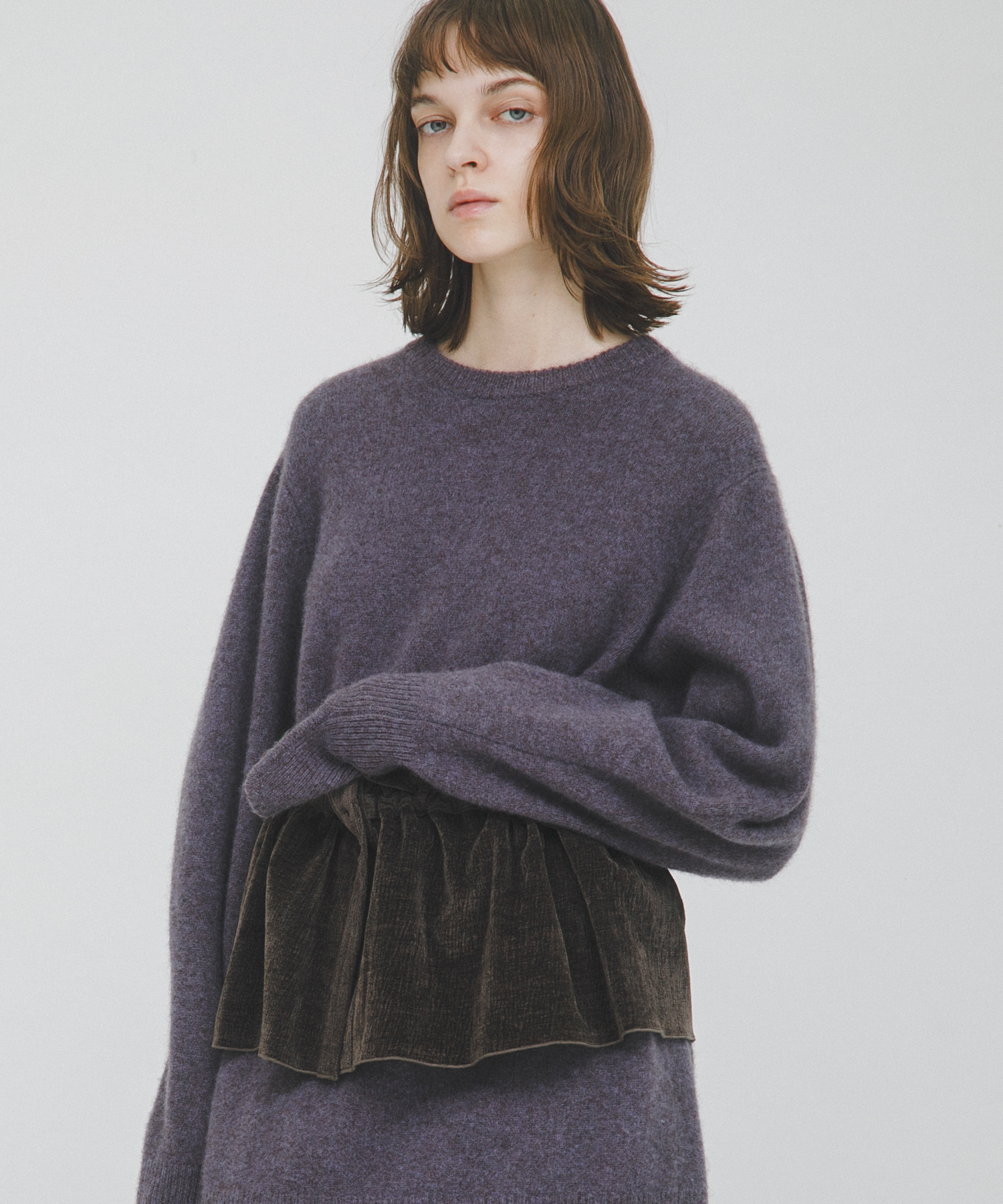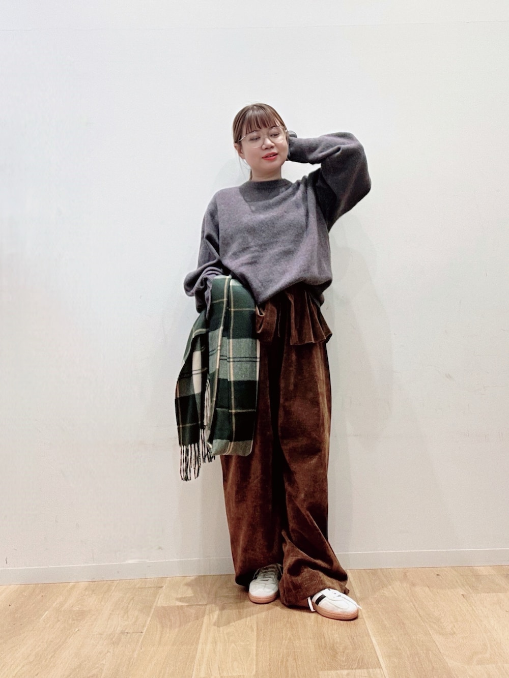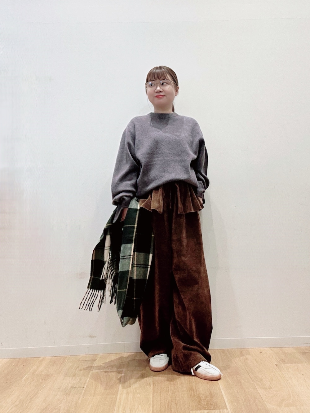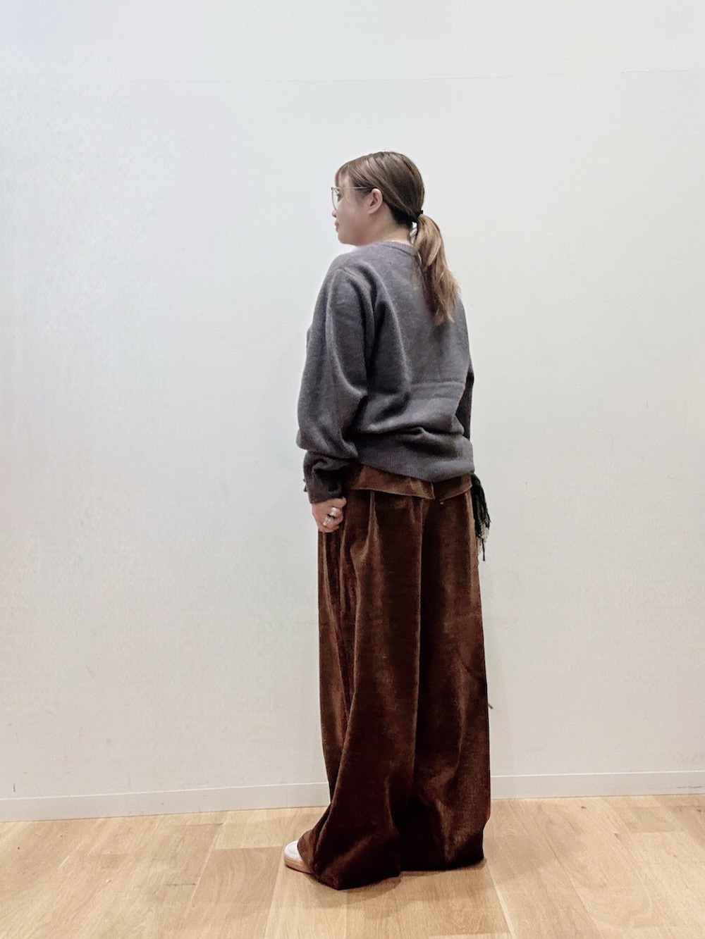 今回はパープルカラーが鮮やかなニットとベロアワイドパンツで。