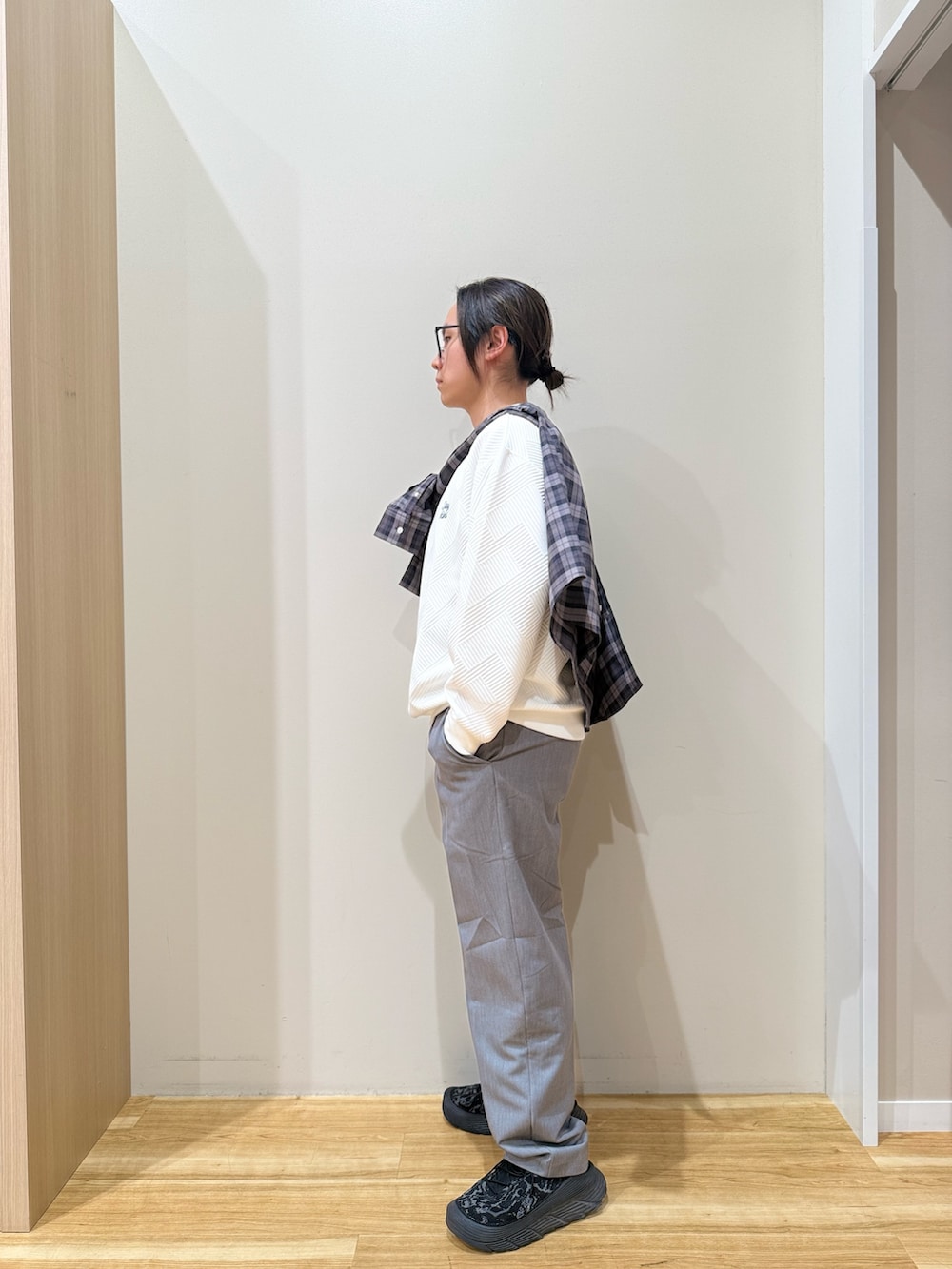 グレーのスラックスを合わせることで、
