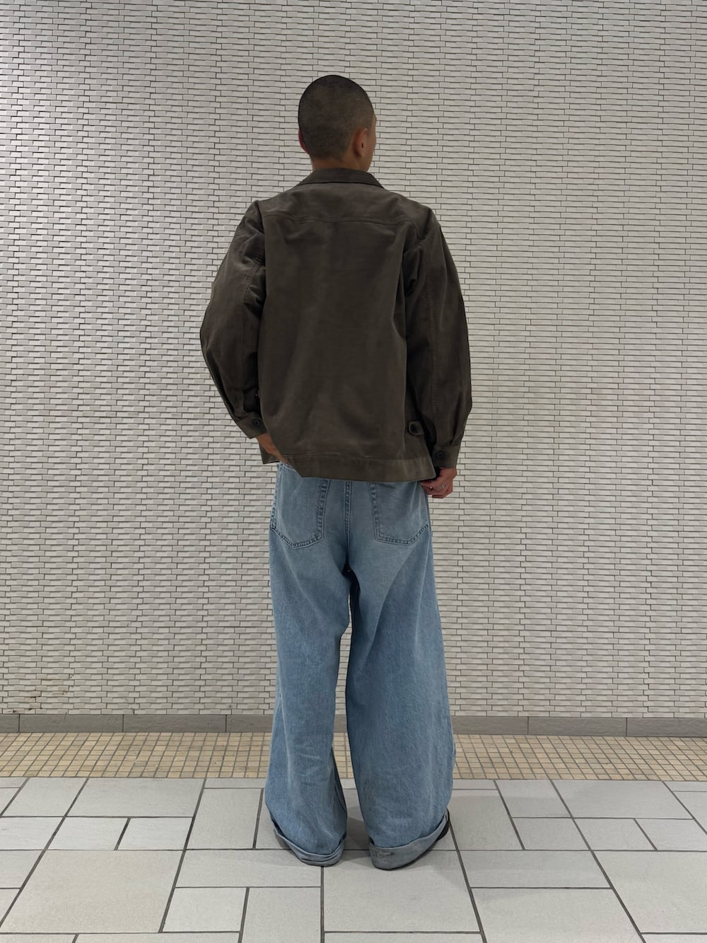 レギュラーな形のジャケットでも素材を今っぽいものにするだけで簡単におしゃれ見えします!
