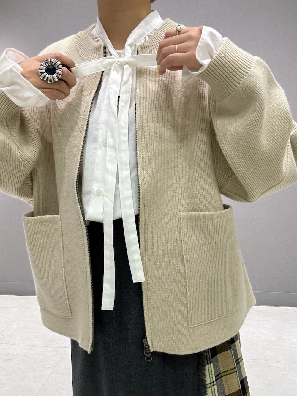 ニットのブルゾンとリボンブラウスで