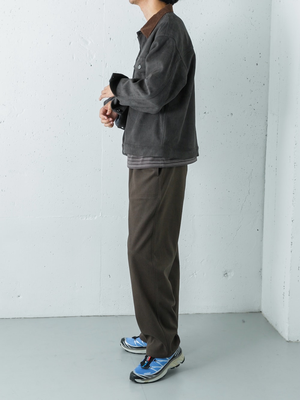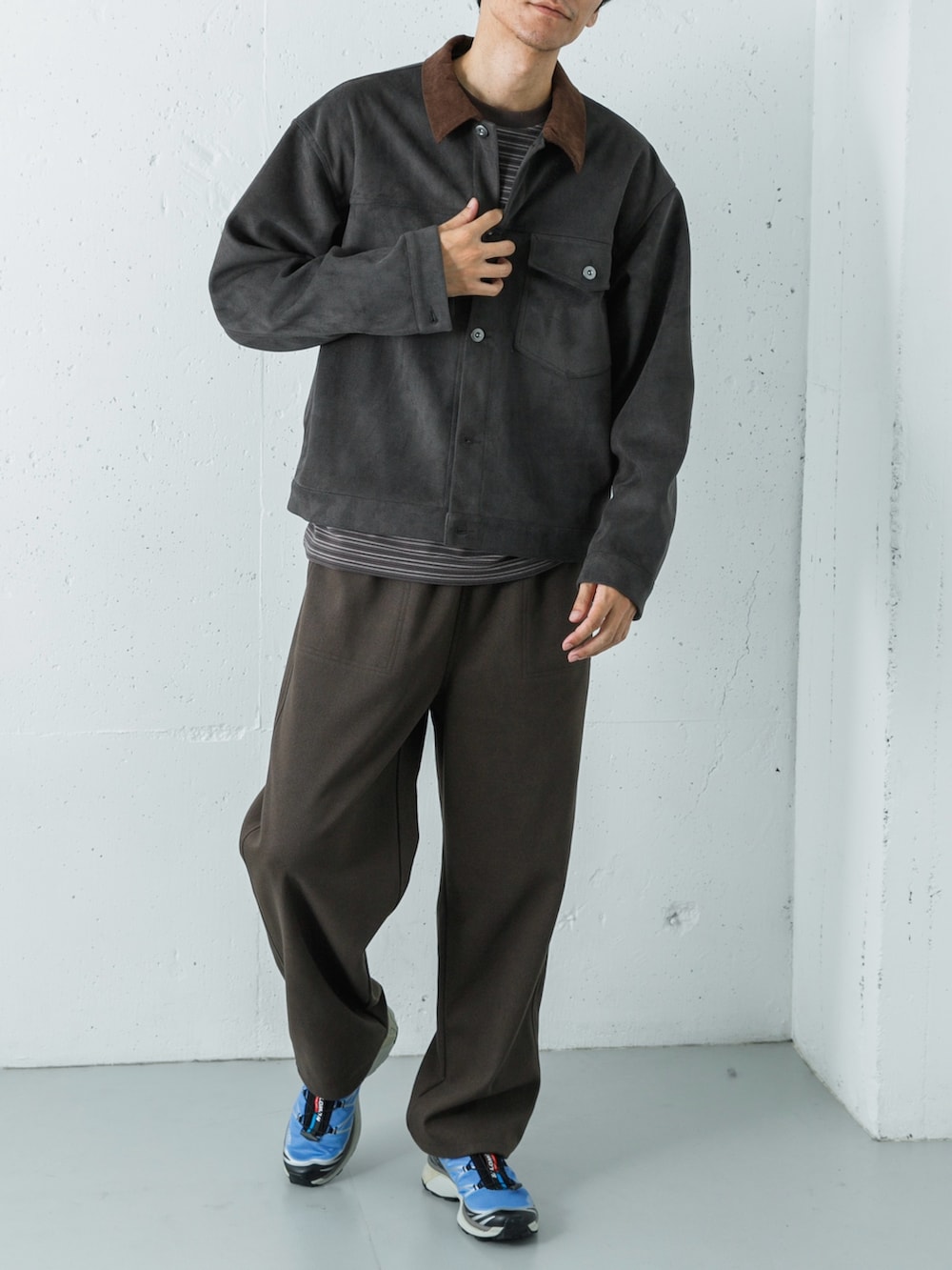 起毛素材のパンツと存在感あるスニーカーで、都会的なリラックスムードに仕上げています。