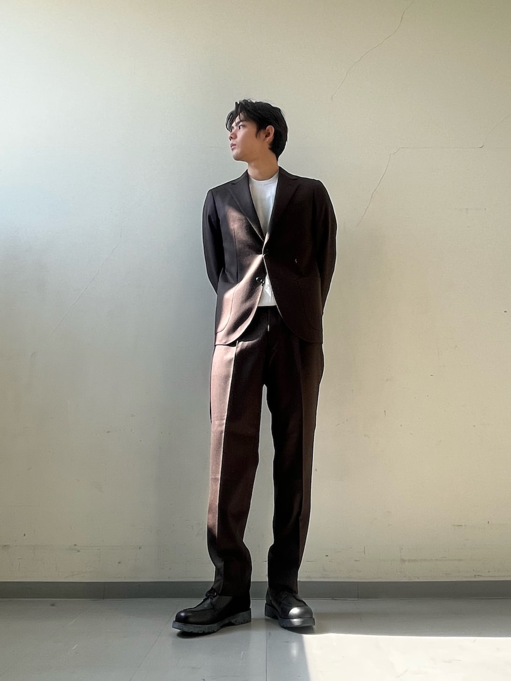セットアップは尾州で作られた上質なメリノウール生地を使用した温かみを感じる一着。
