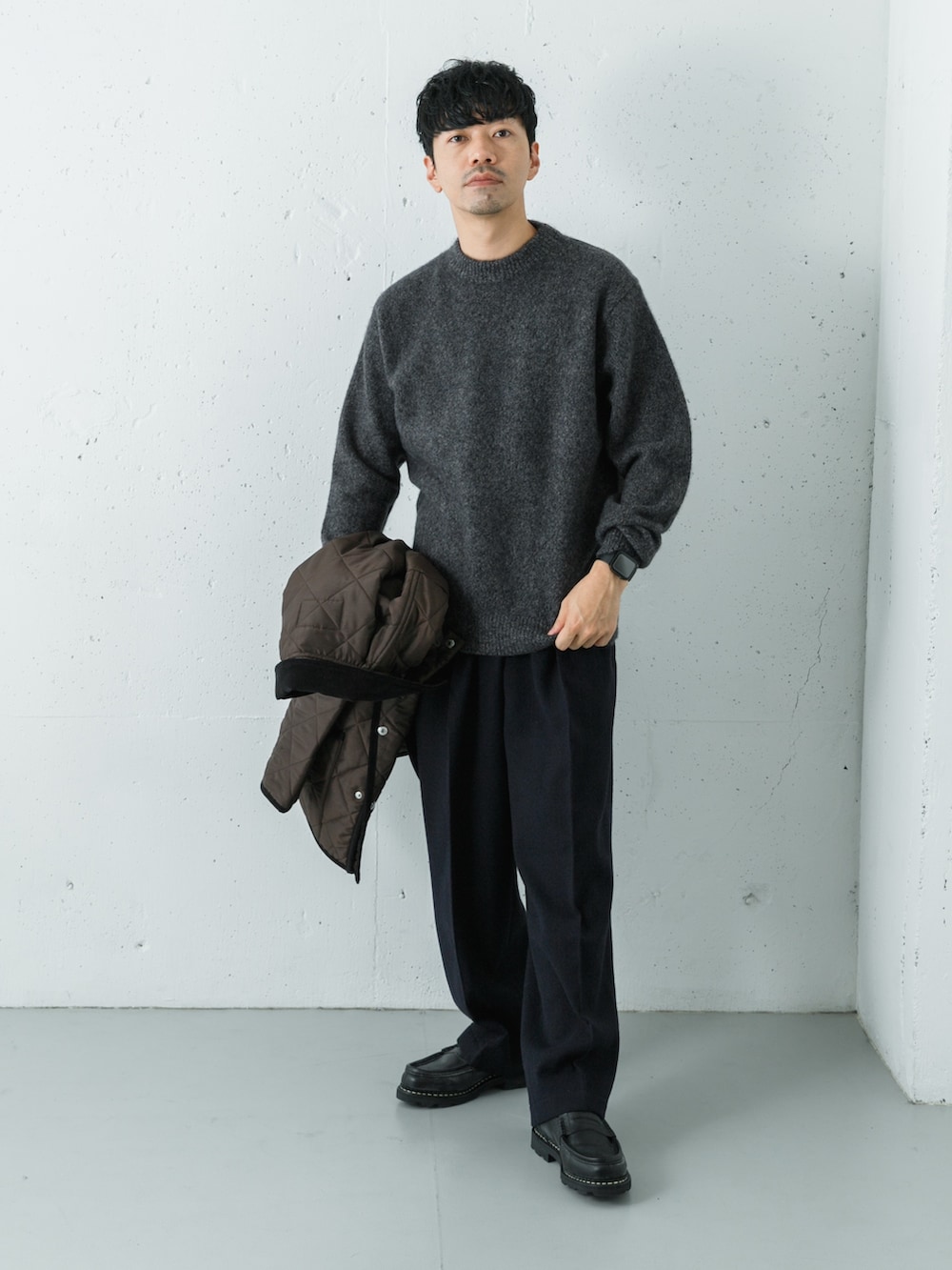 ニットとパンツは前回着用した色違いです。今回はブラックでアウターのブラウンが引き立つ色合わせにしました。