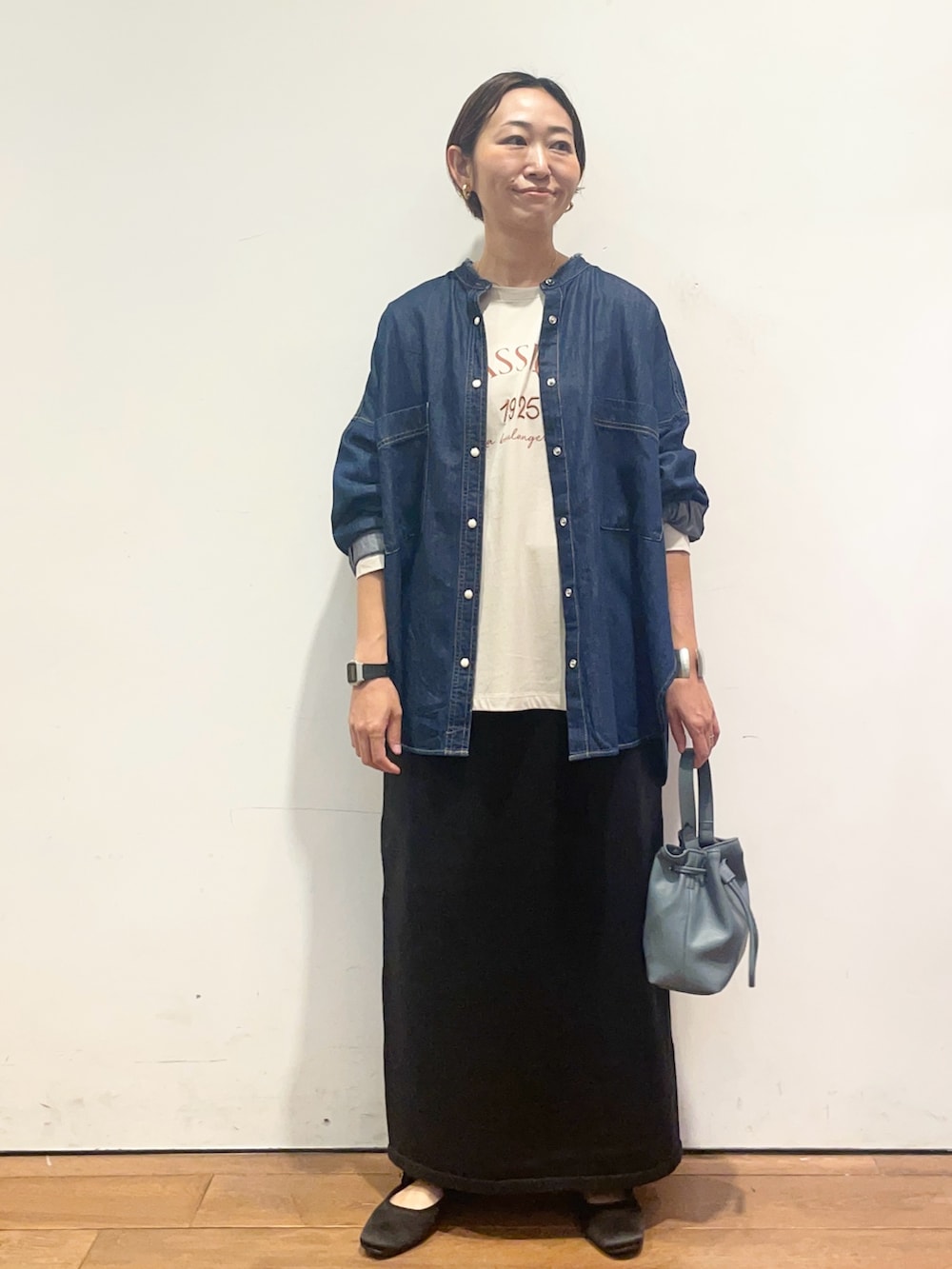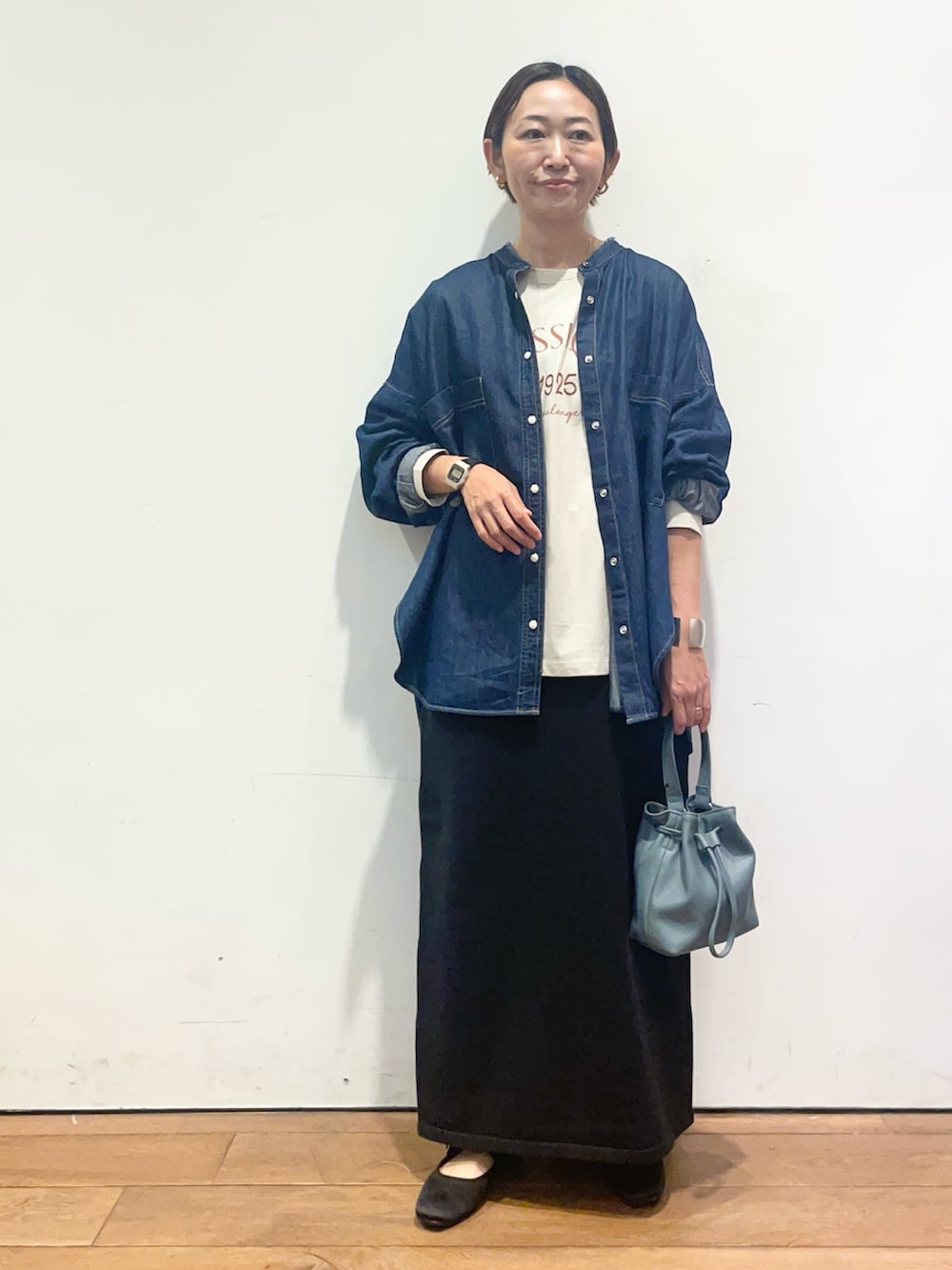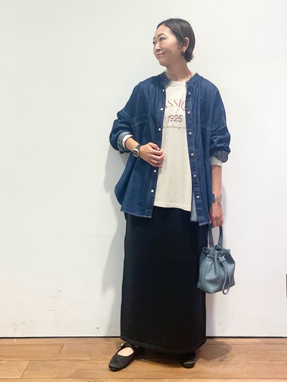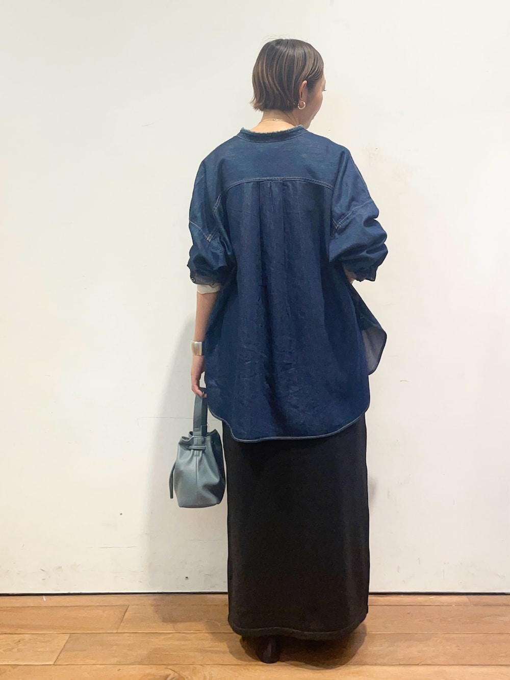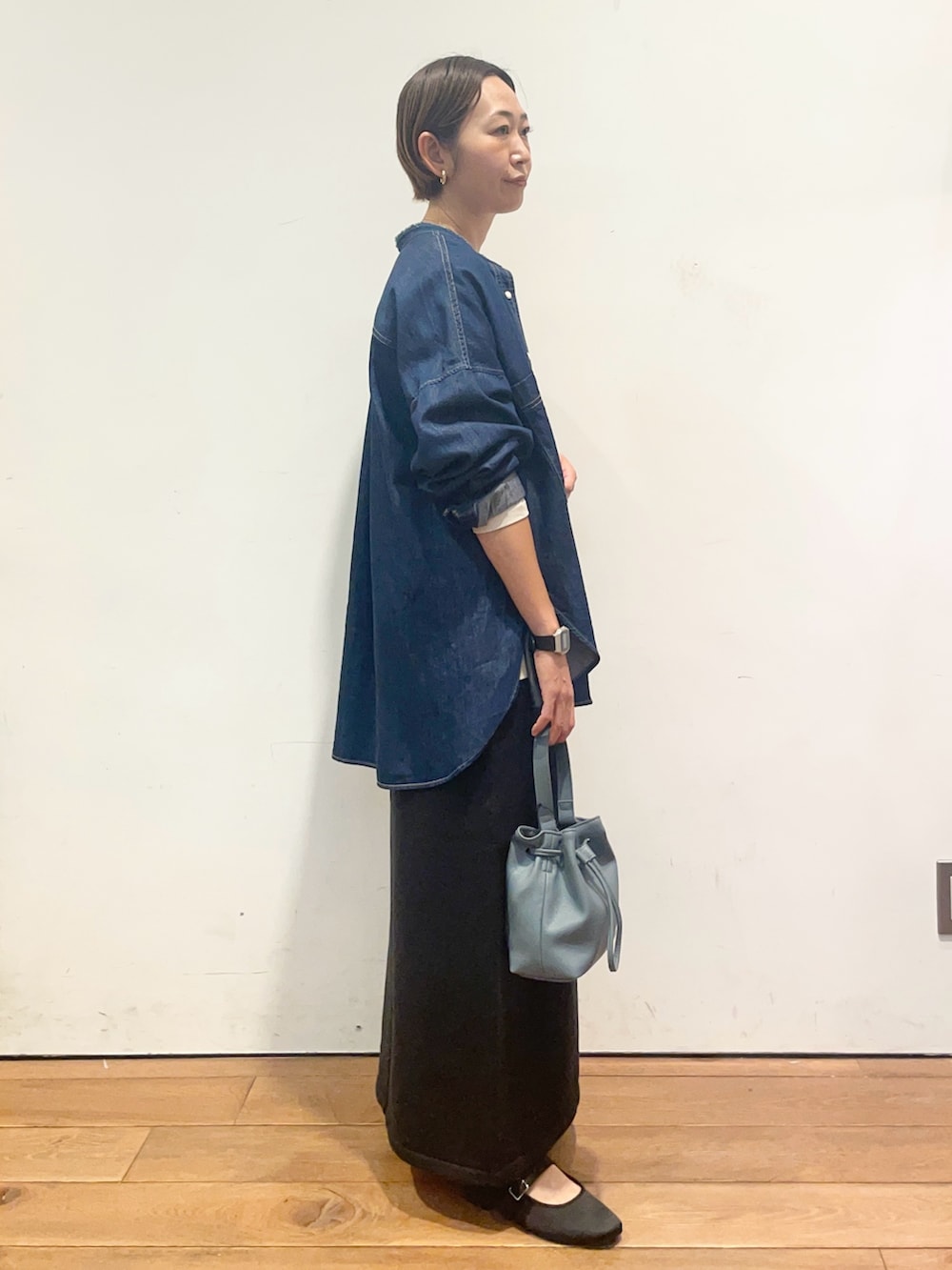 デニムバンドカラーシャツはゆったりとしたシルエットですが、