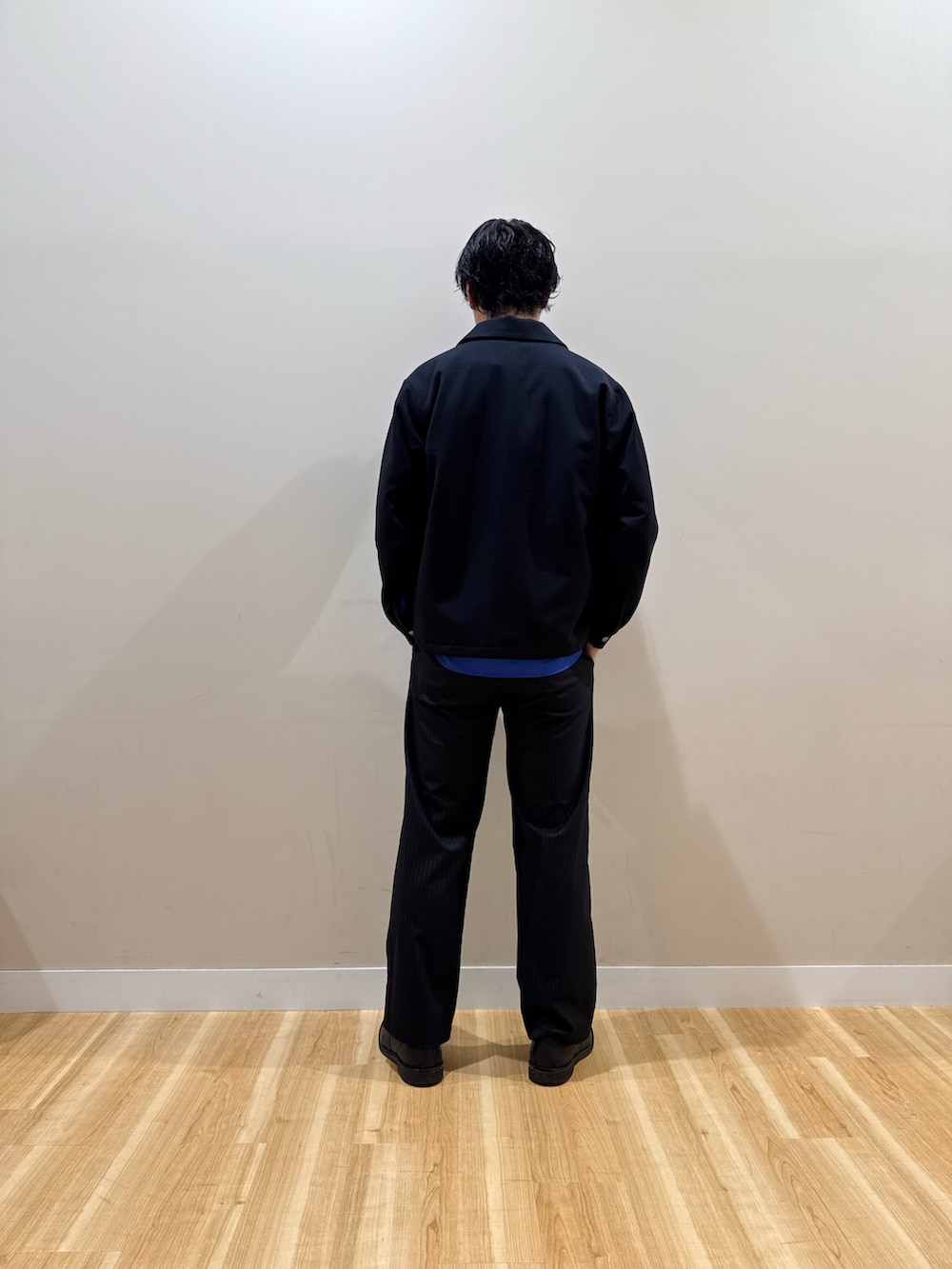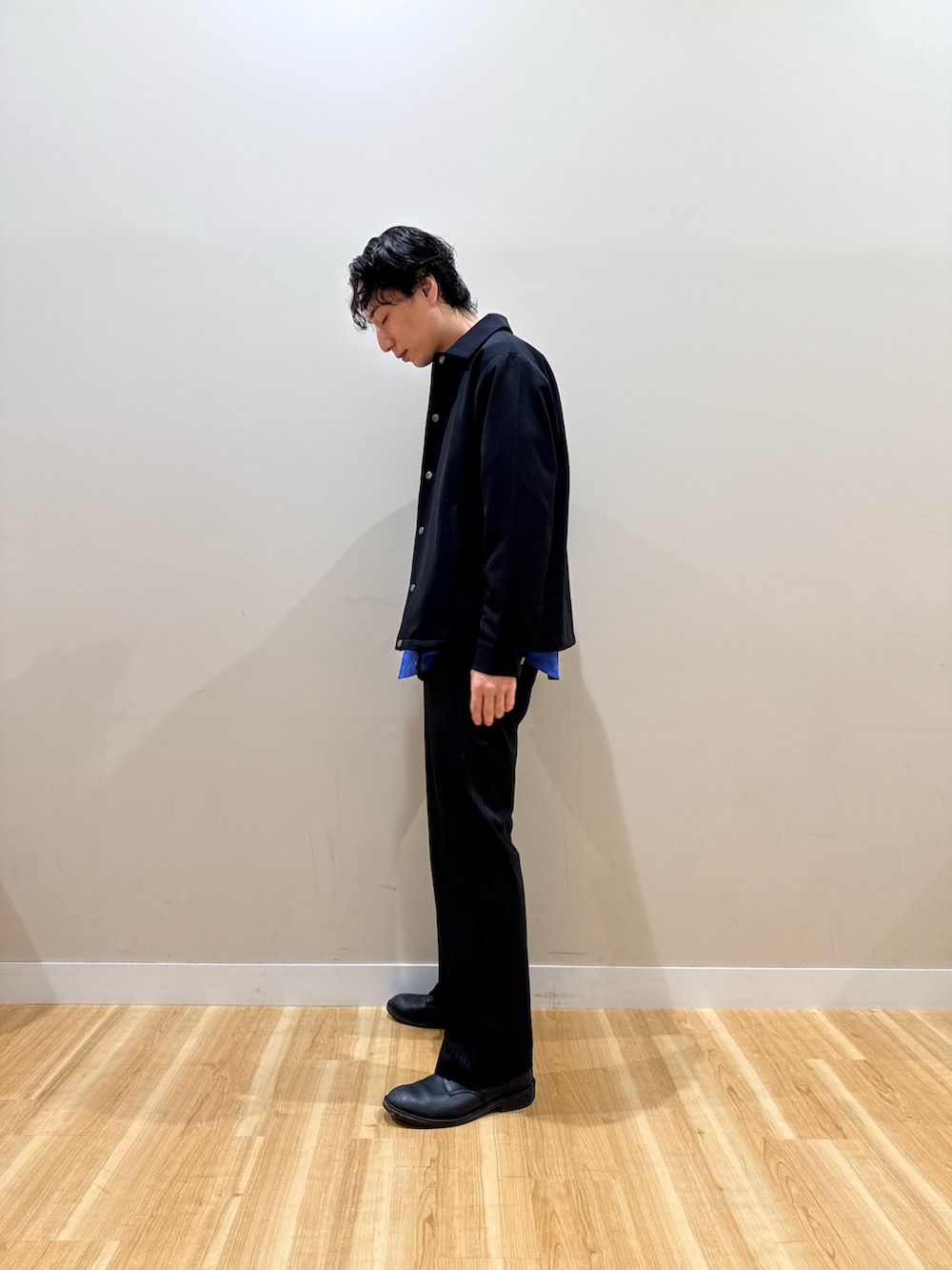 シャツは綺麗なブルーで、インナーとして使うと良い差し色になります。