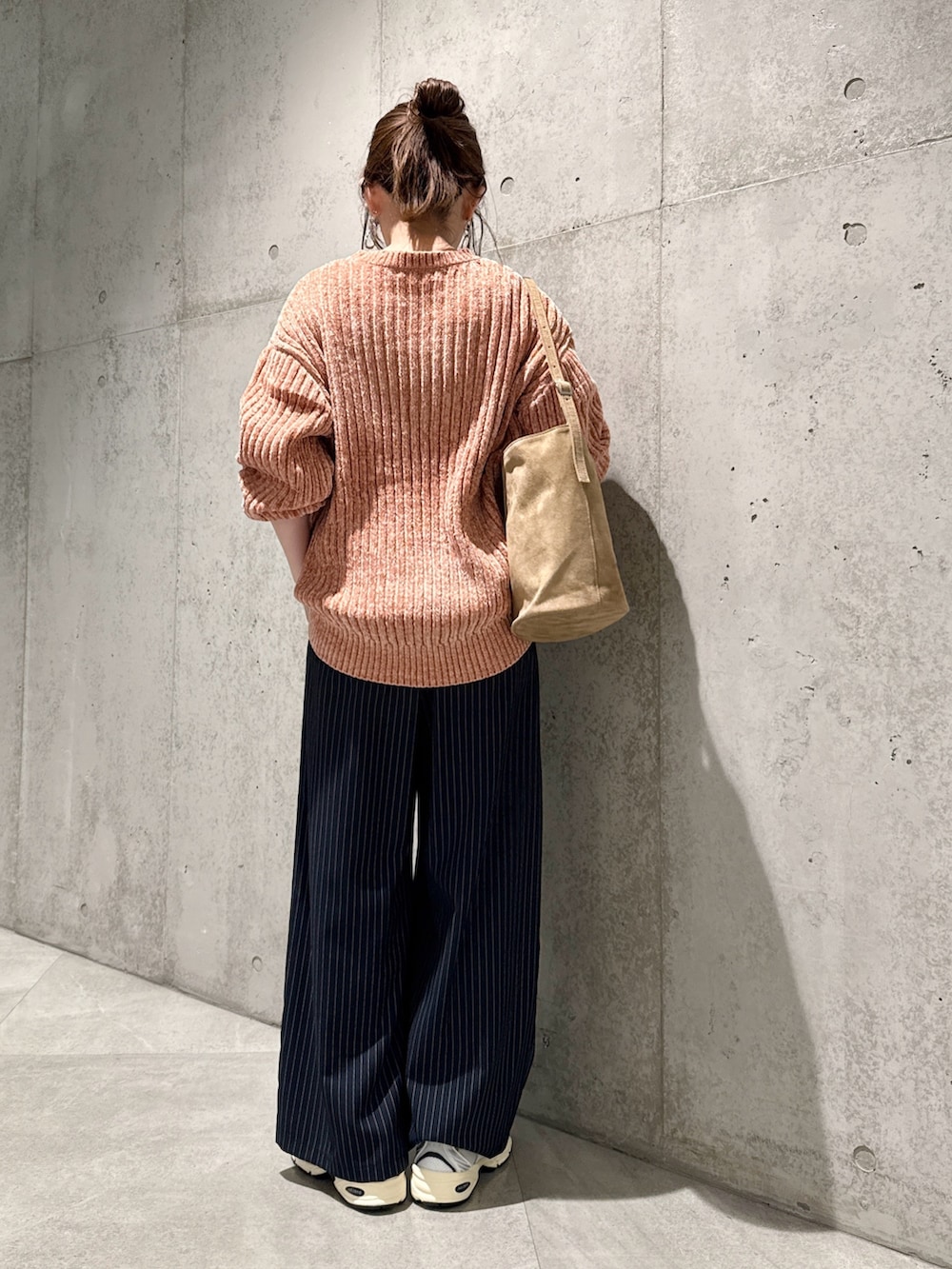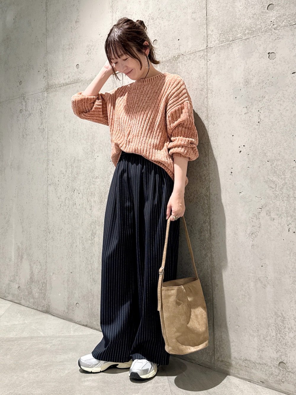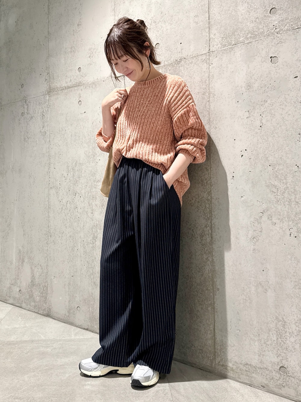 今回は、ストライプ柄のワイドパンツと合わせた、キレイめカジュアルコーディネートです。