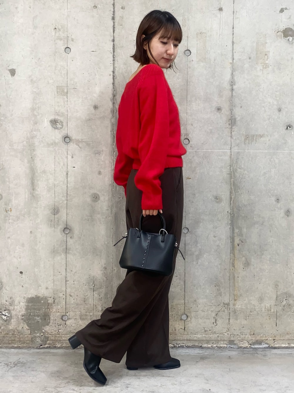 赤のニットはオフショルにもなって女性らしさプラスできます!