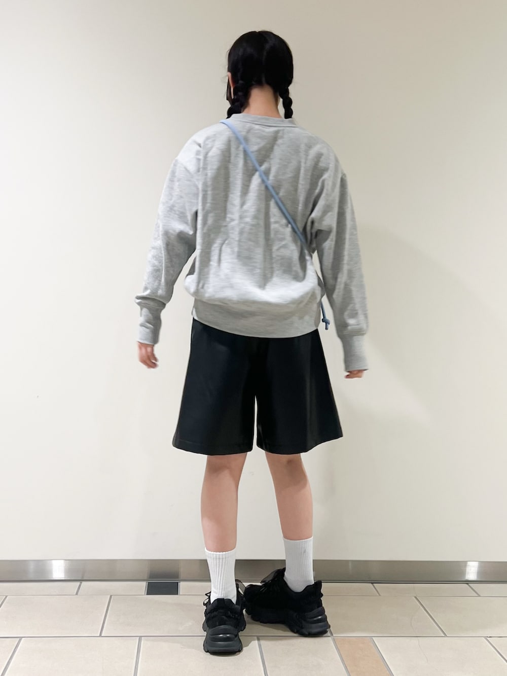 レザーのパンツは膝より少し上ぐらいの丈感で、きれいめ感もあるシルエットです!