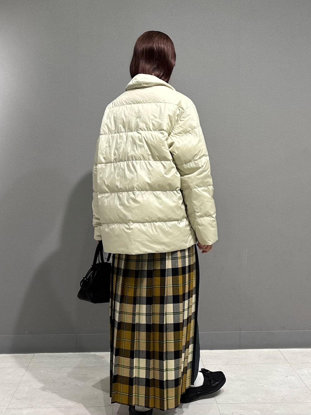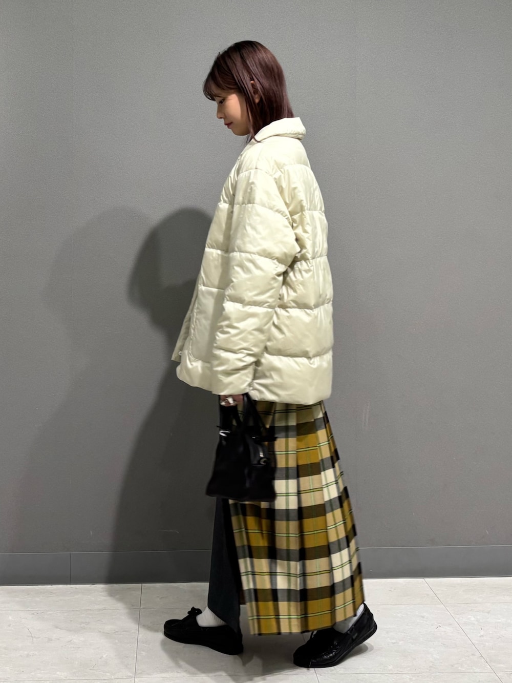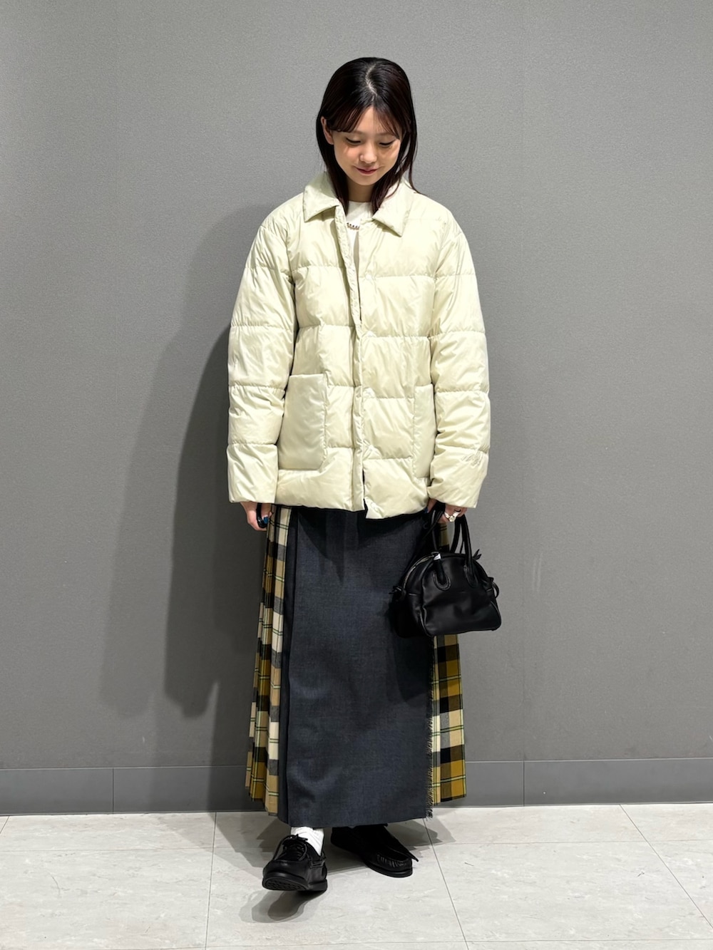 トップスもダウンの白に合わせて、スカートのyellowチェックが引き立つコーデにしてみました📚