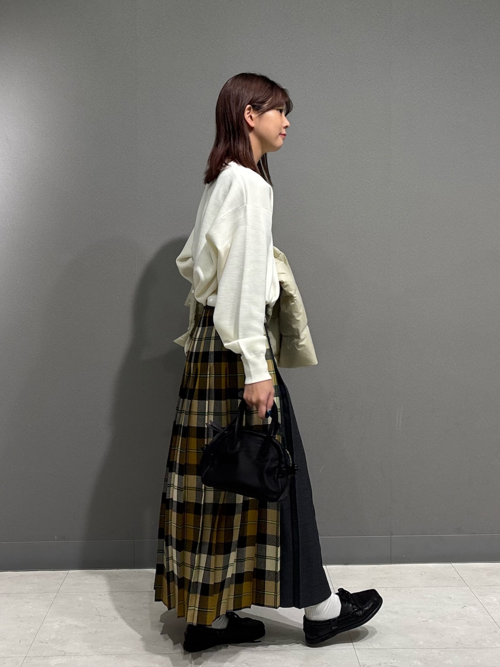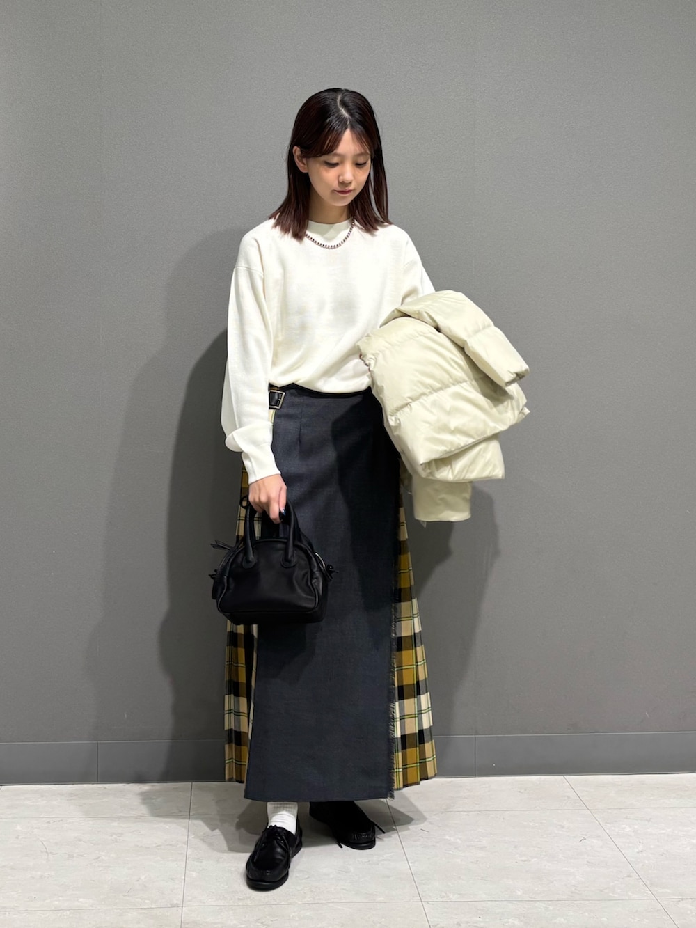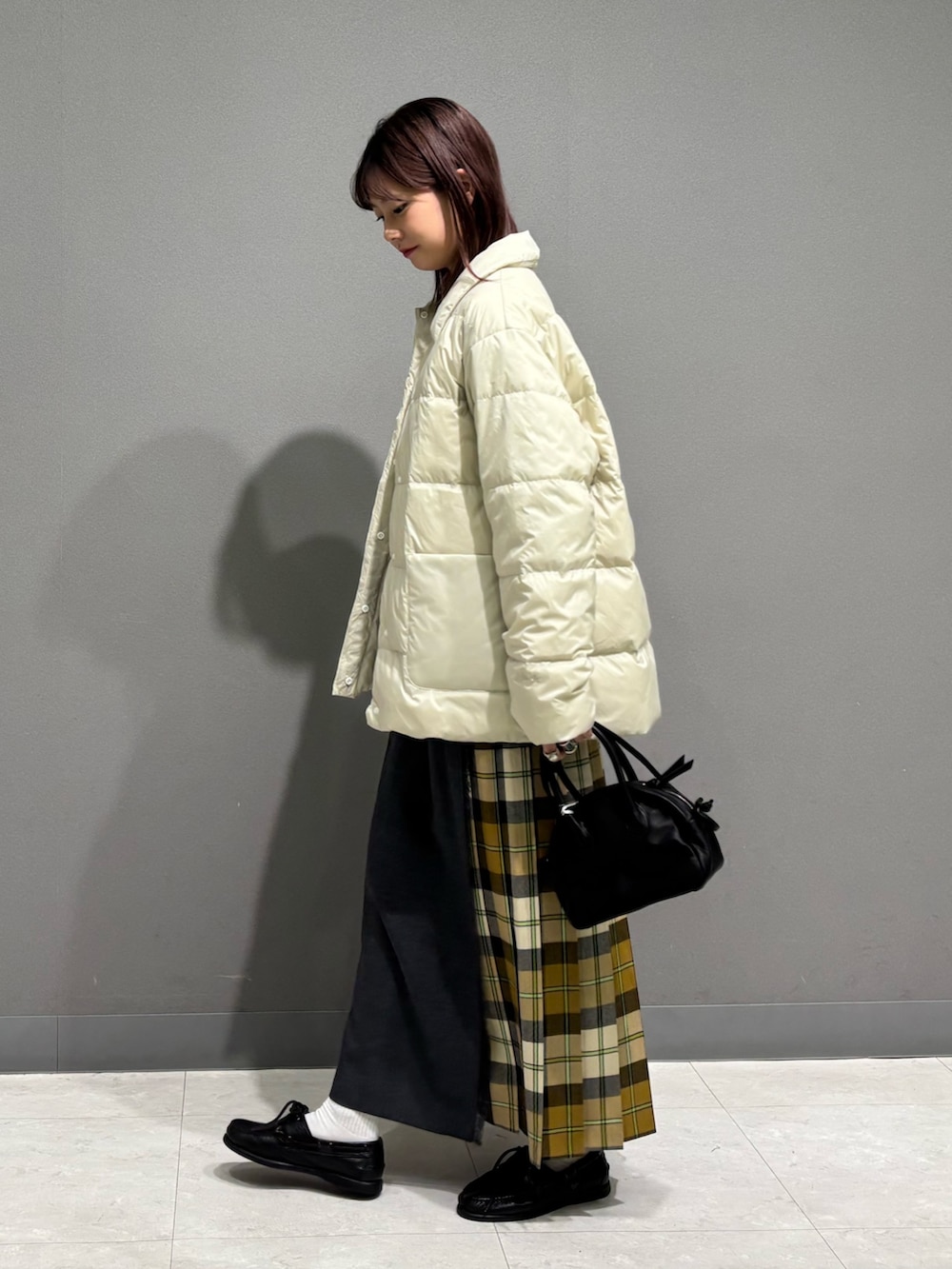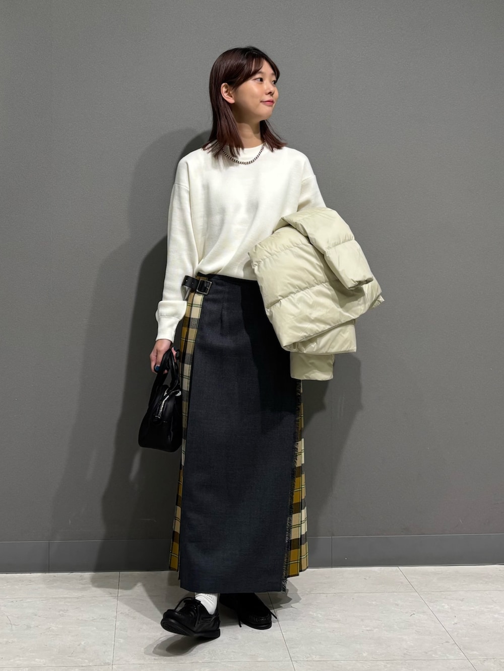 トップスもダウンの白に合わせて、スカートのyellowチェックが引き立つコーデにしてみました📚