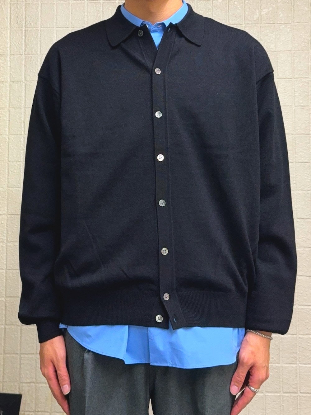 シャツのサイズを一つ落とすことでニットとのレイヤードのサイズ感を調整しました。