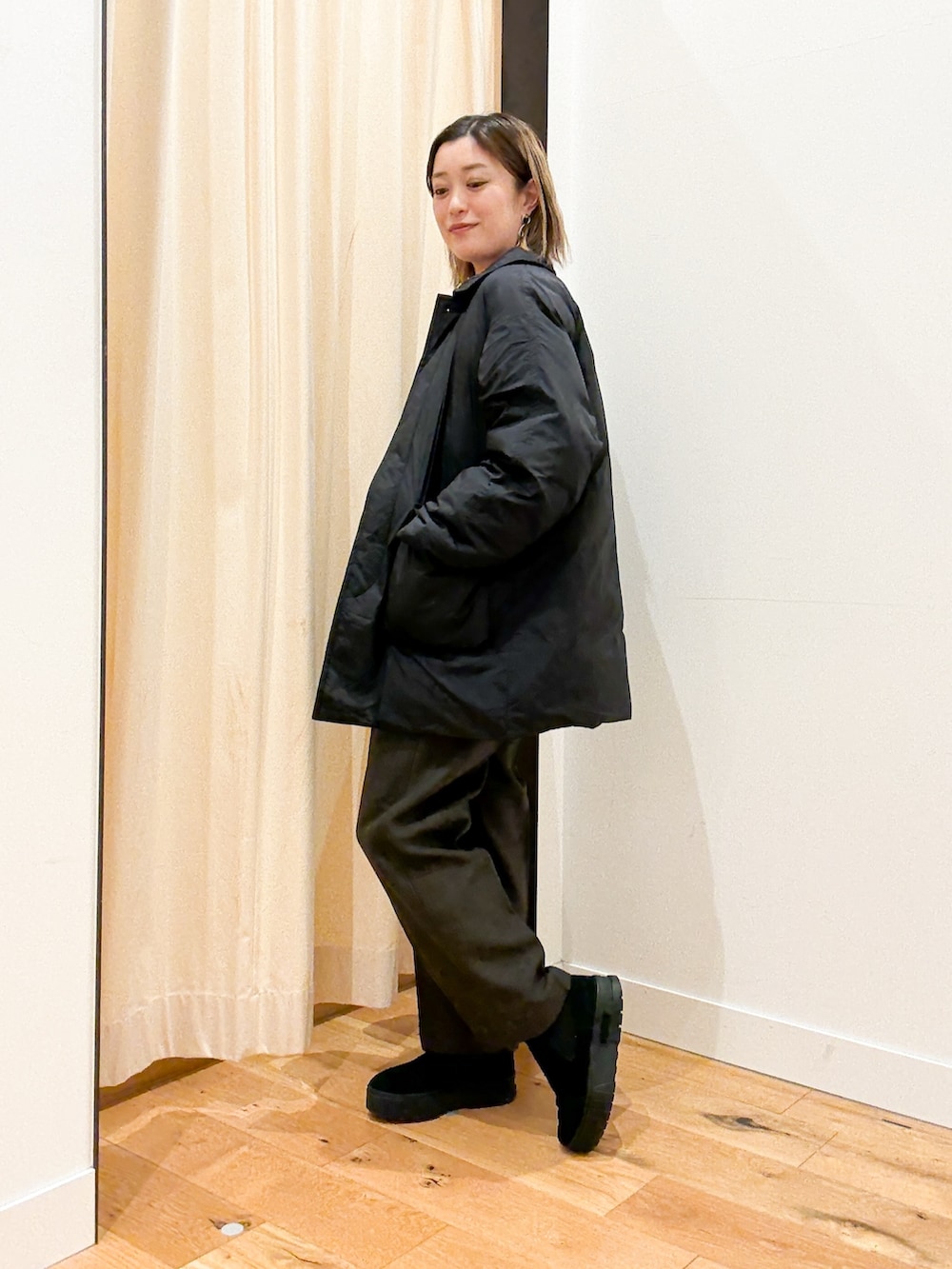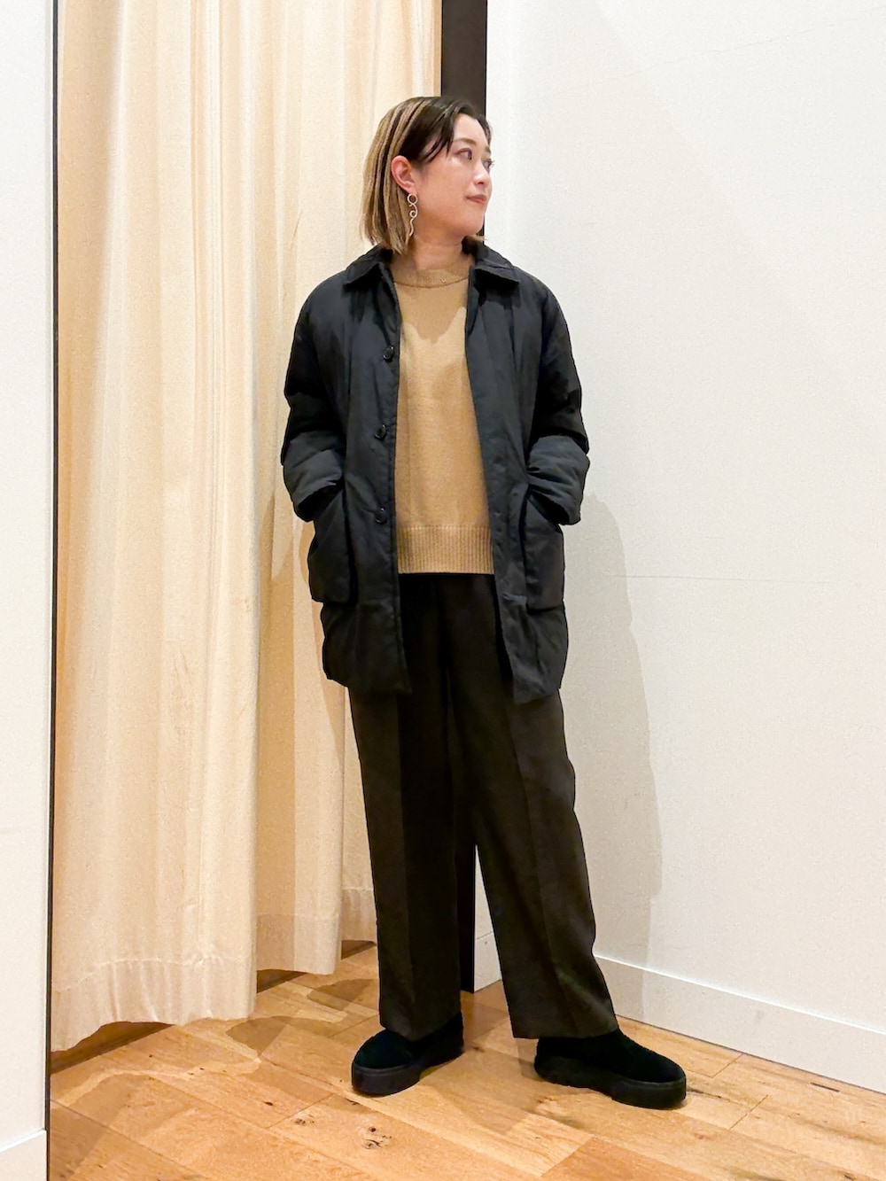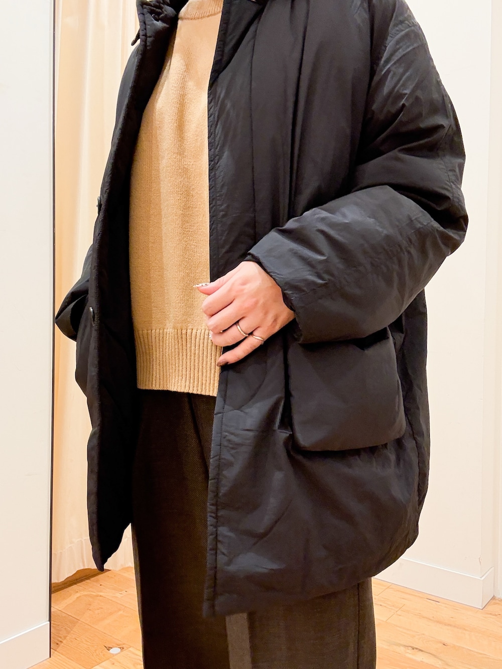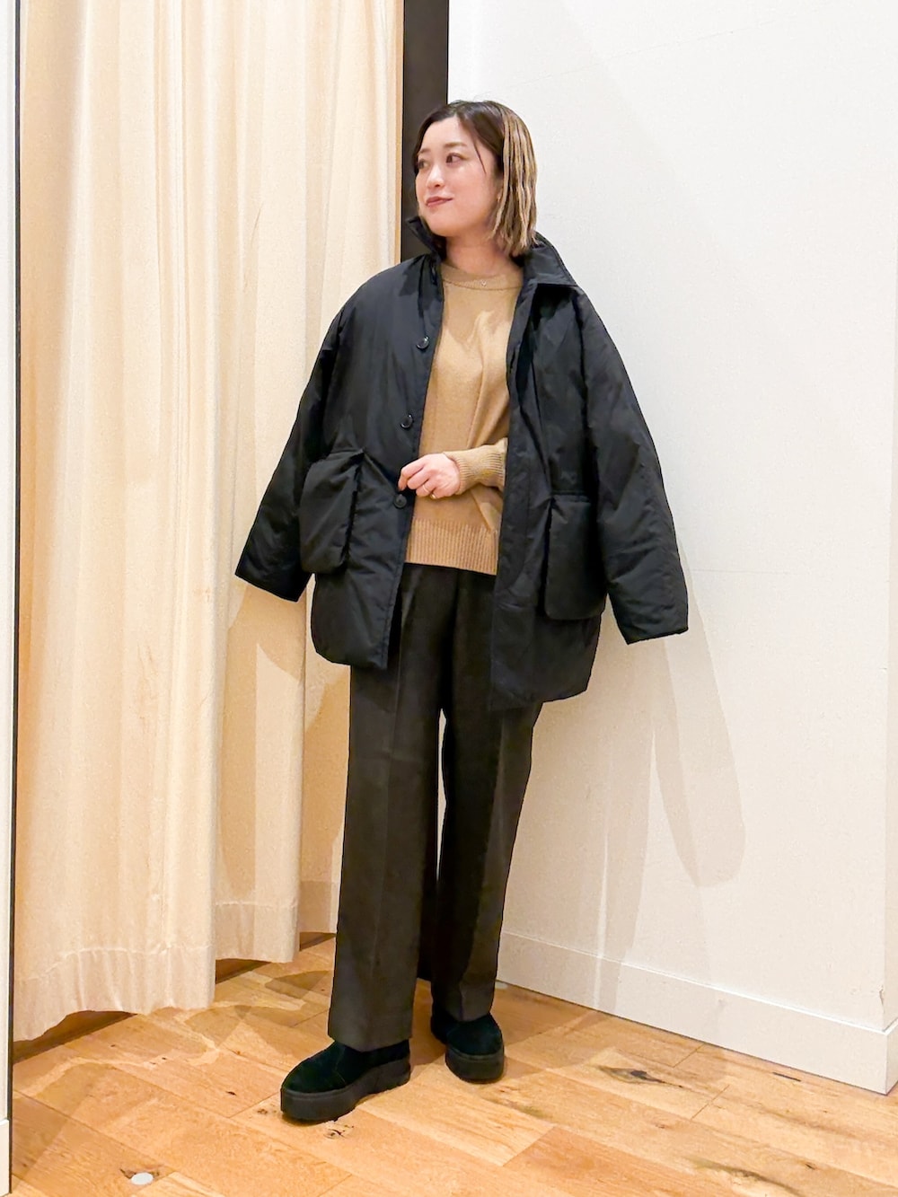トップスはラグランスリーブの柔らかいニットで全体的にゆったりしていますが袖口はリブでスッキリとしています。