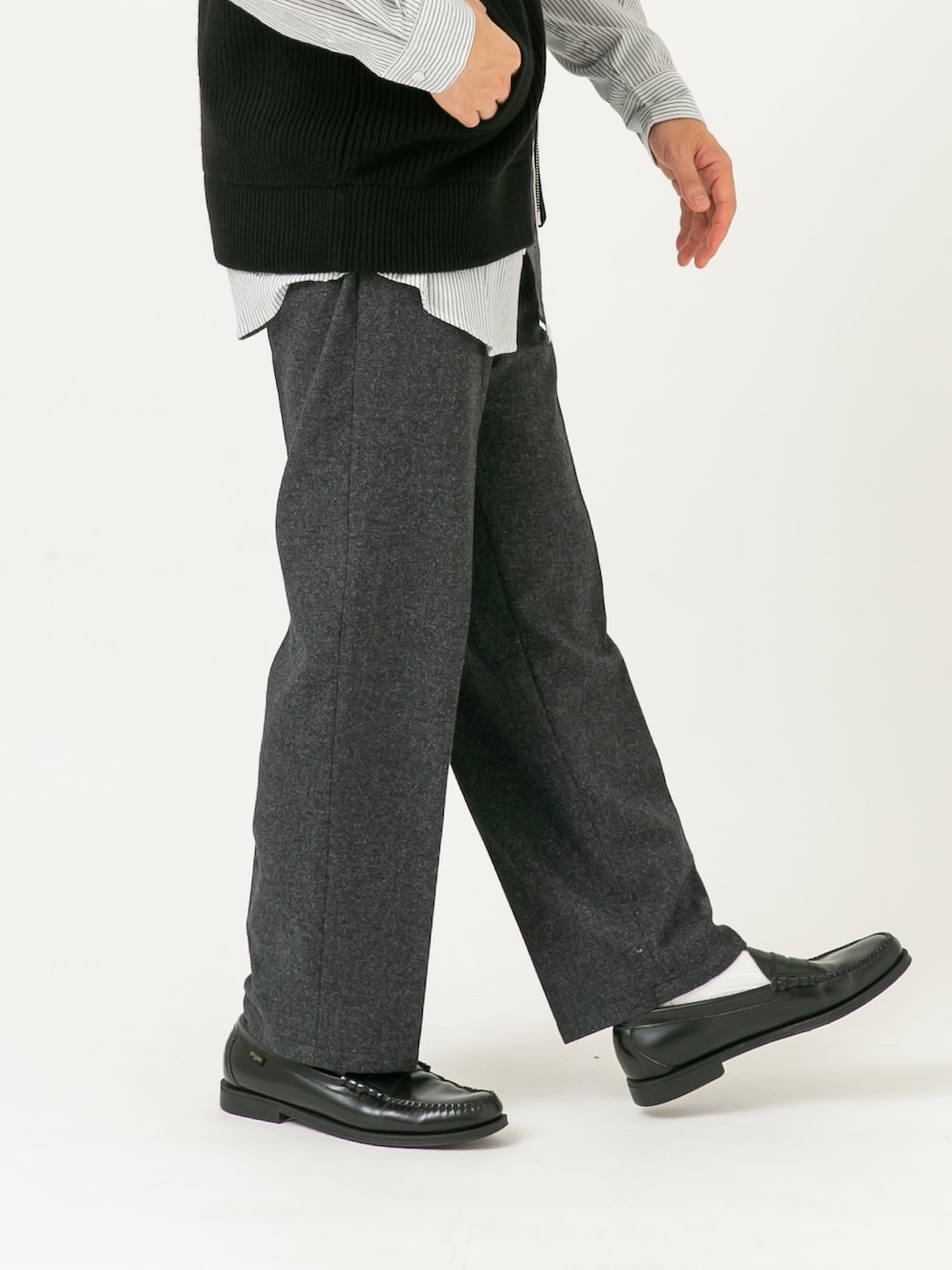 パンツは細身のツイードスラックスでキレイめな印象で。