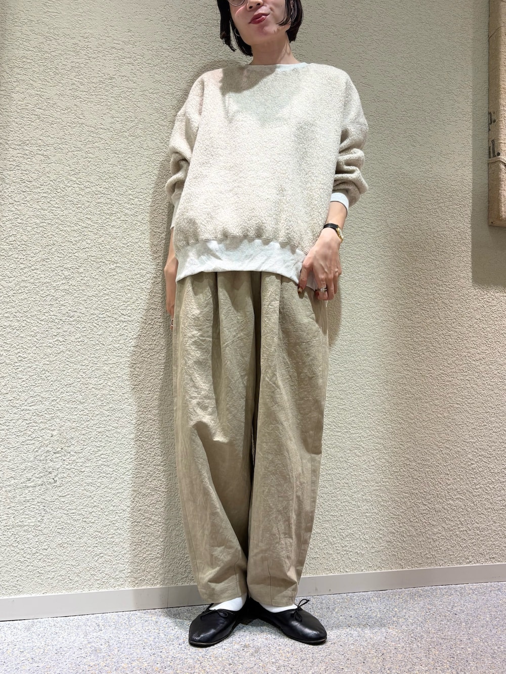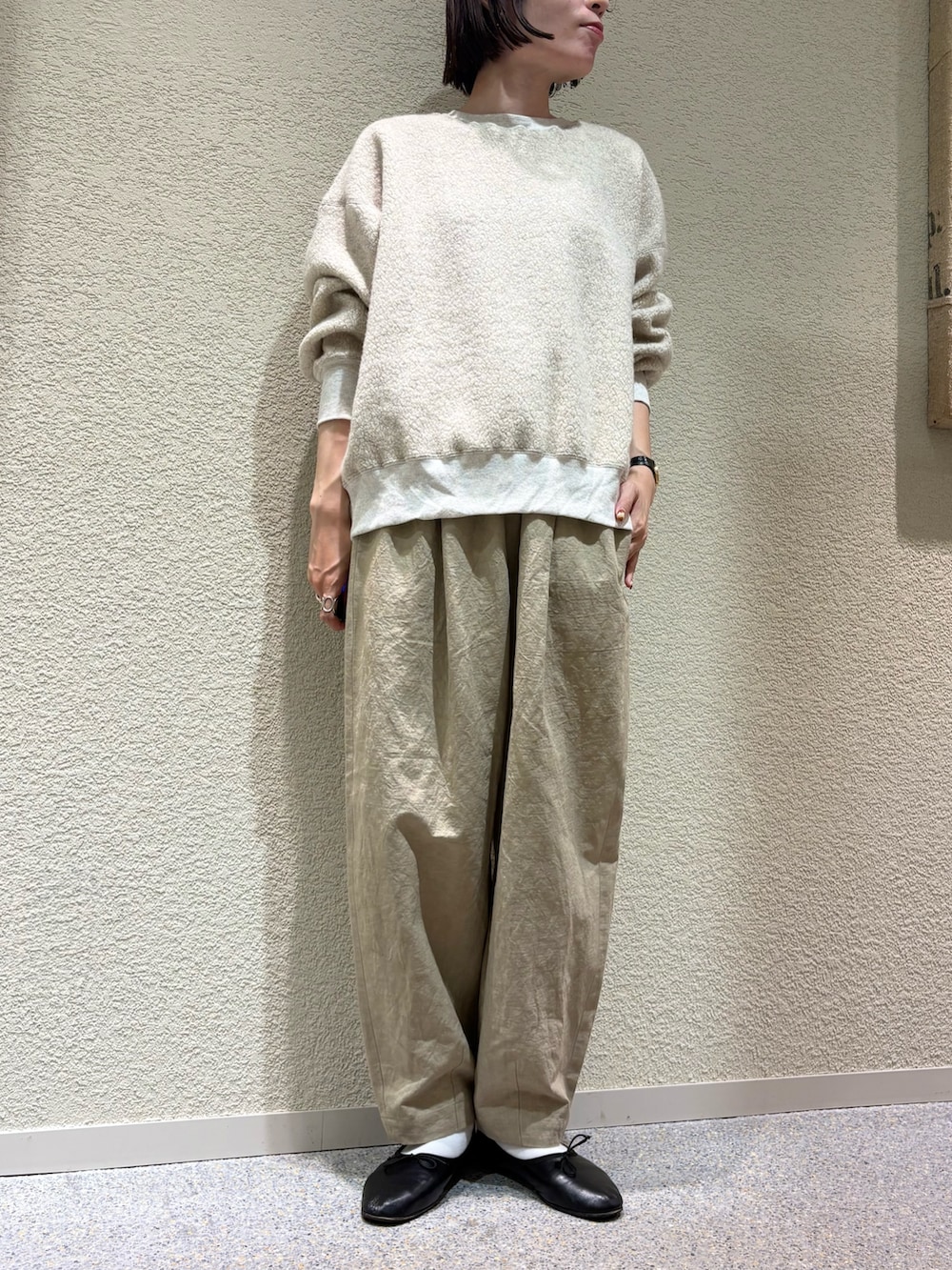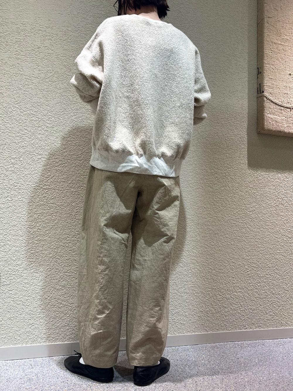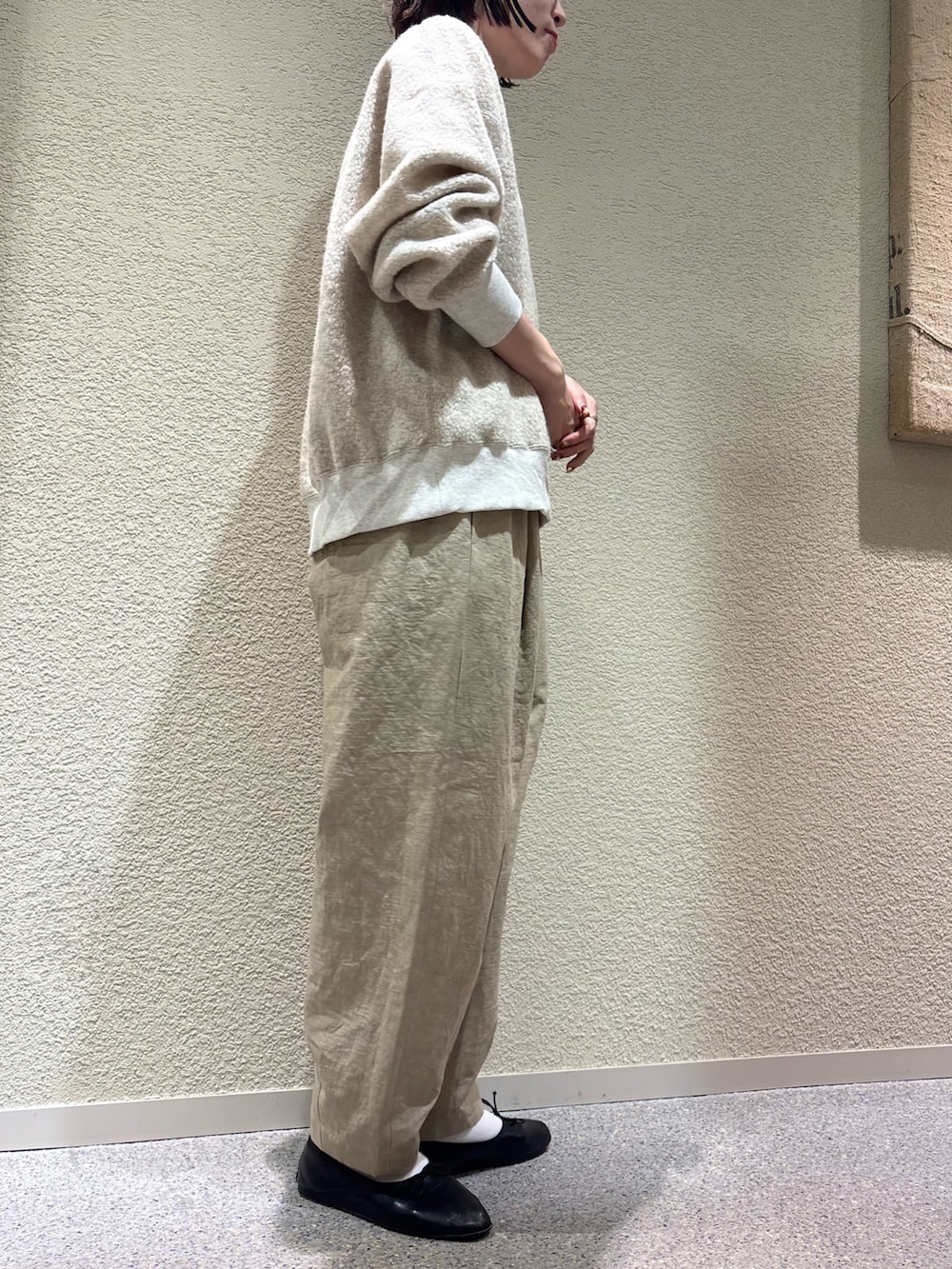 程よい丸みのあるシルエットで、お尻周りはゆったりしていますが裾にかけて少ししぼみ、ボリュームが強すぎずスッキリとした印象で着用頂けるパンツです。