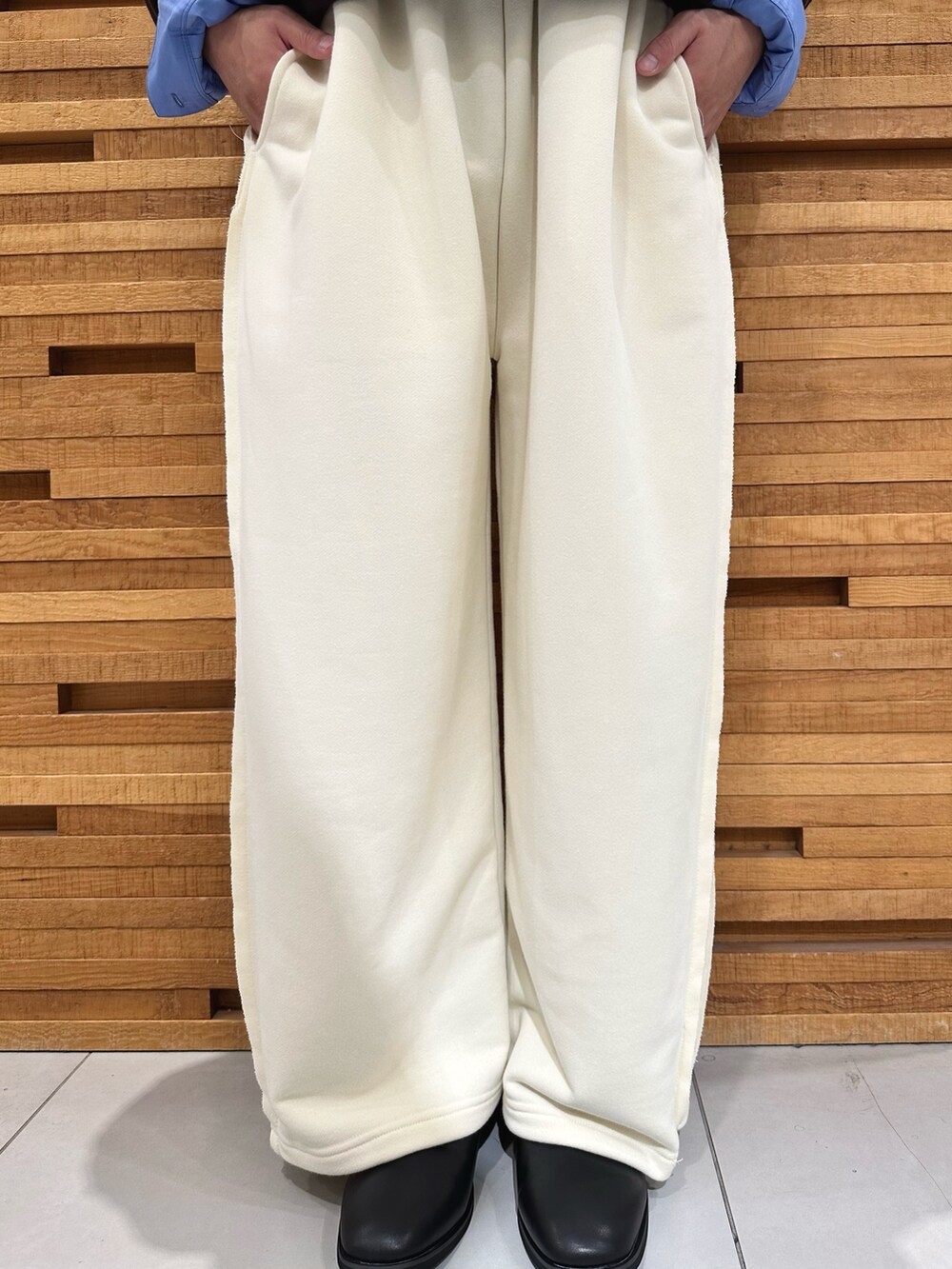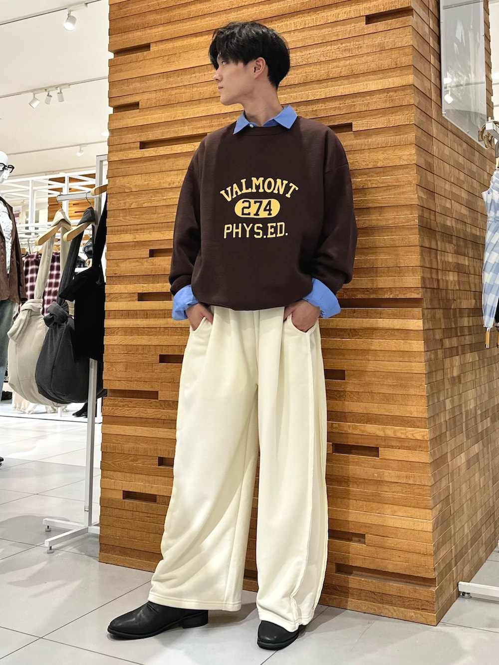 上のレイヤードをアピールしたかったので少し控えめな色のパンツを着用しました!ニットの雰囲気と合うようにスウェットパンツを採用しています!