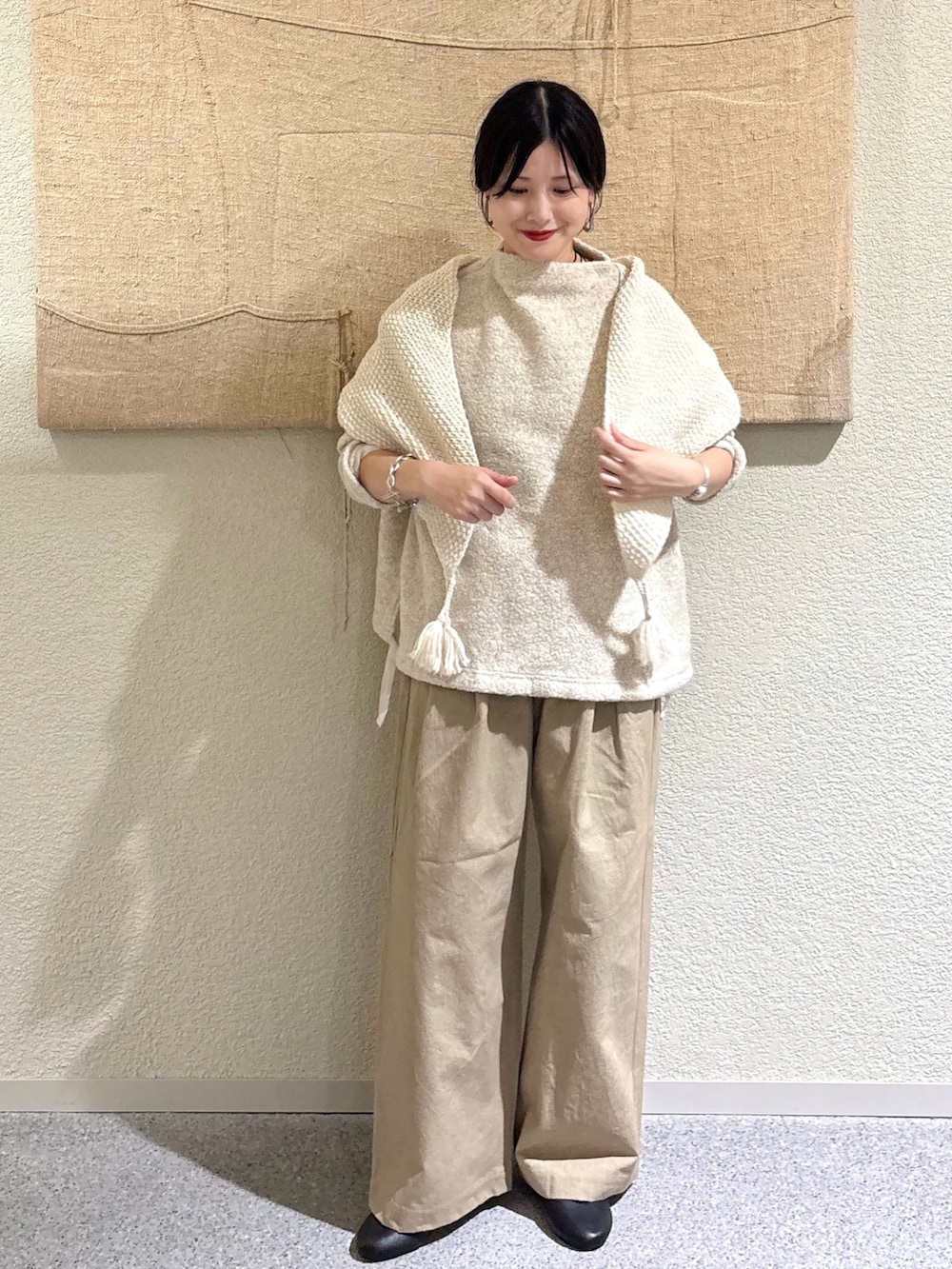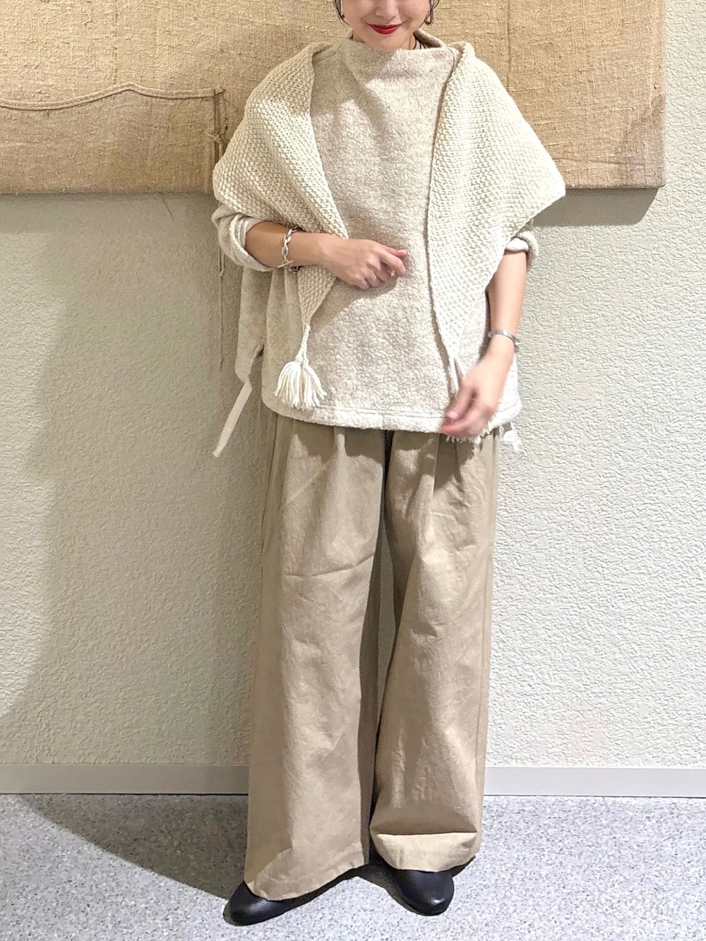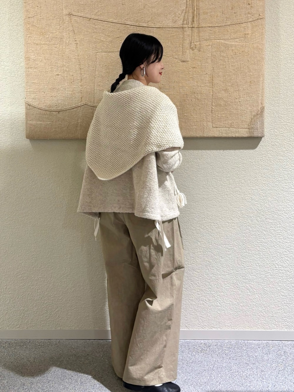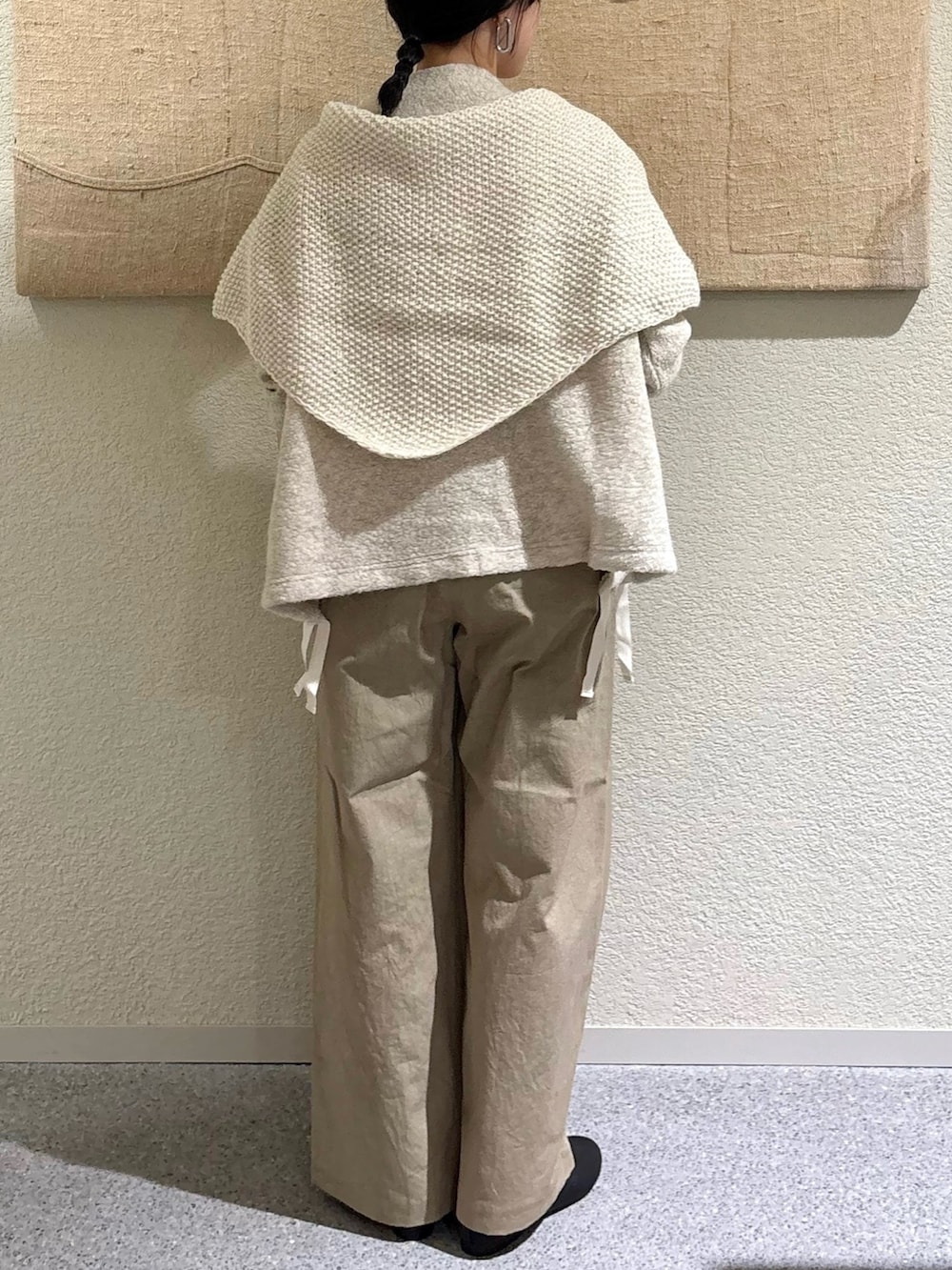 ・ストールをラフに巻いて、顔まわりに温かみをプラス。