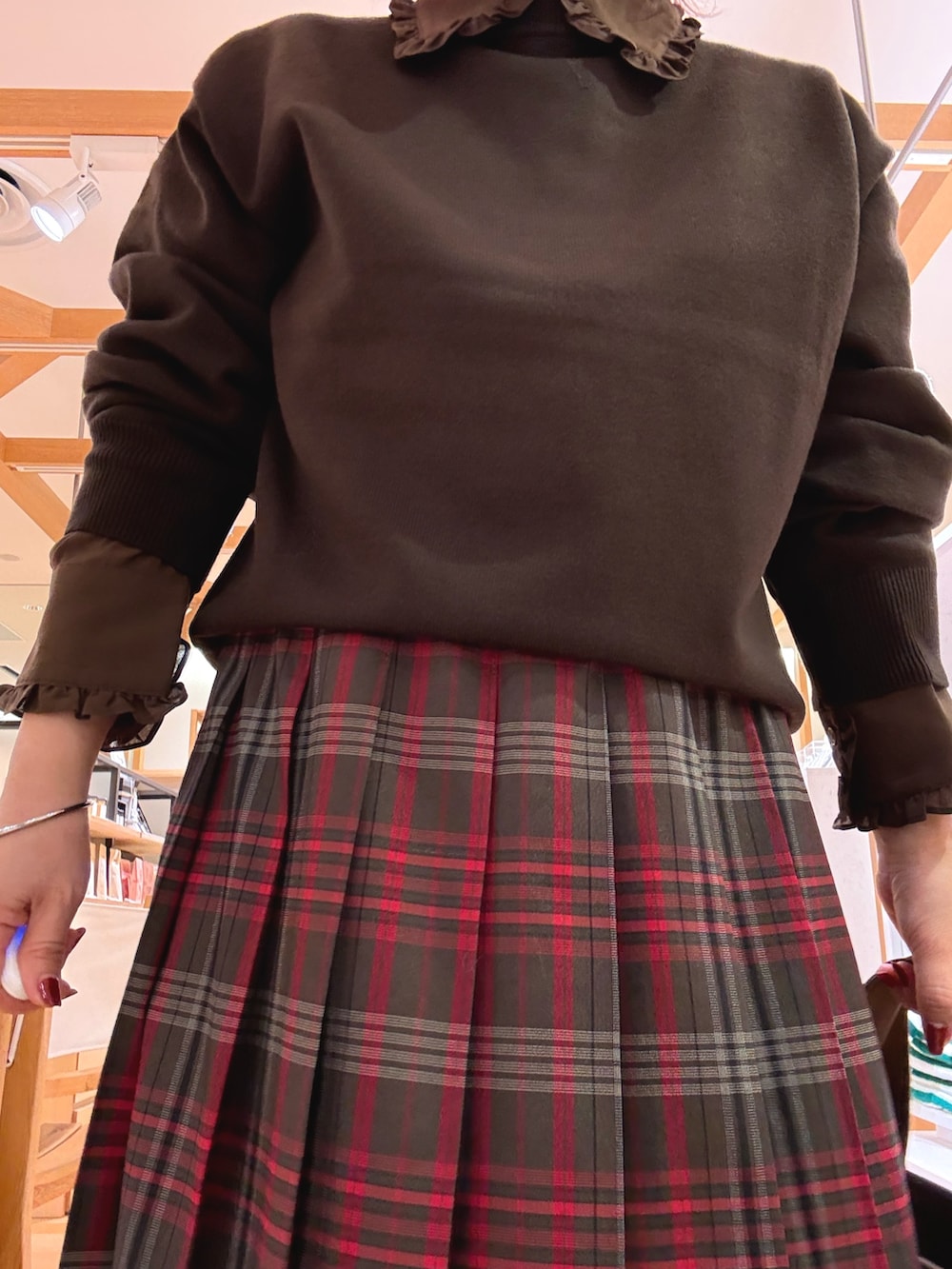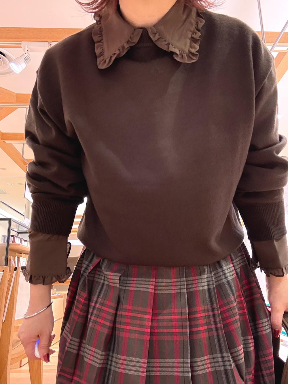 ブラウンのニットにブラウンのブラウスを合わせました。ブラウスは柔らかい素材感なのでニットの下に合わせても窮屈なかんじせず着られます。