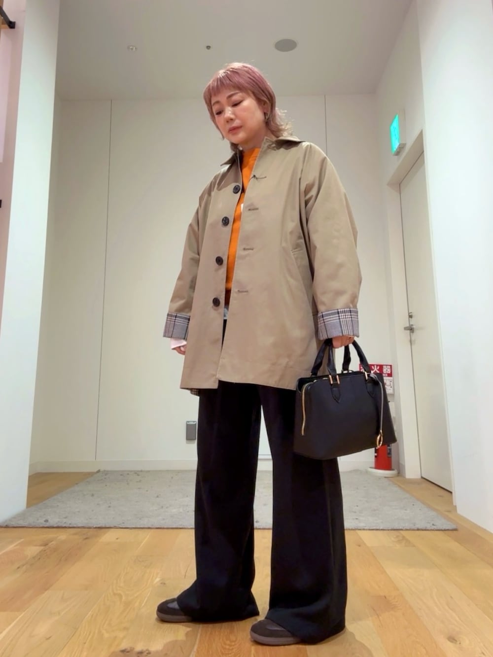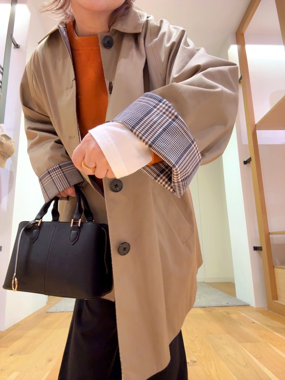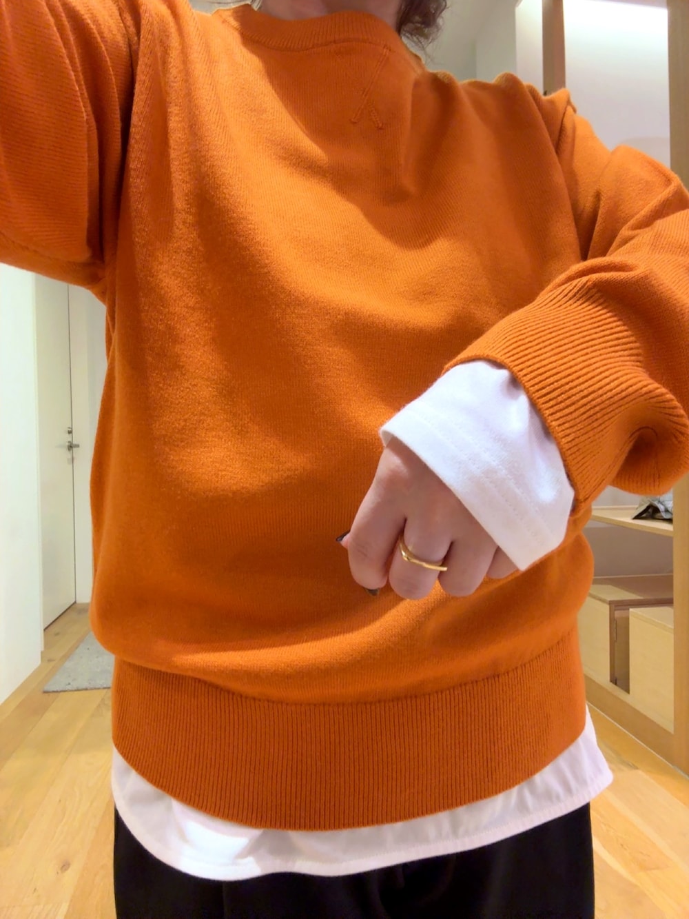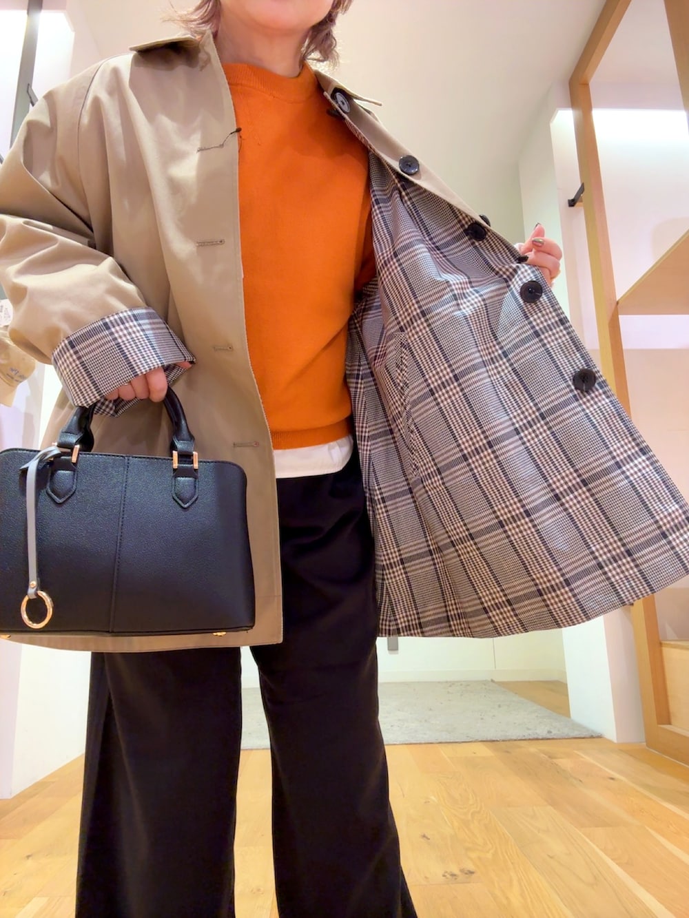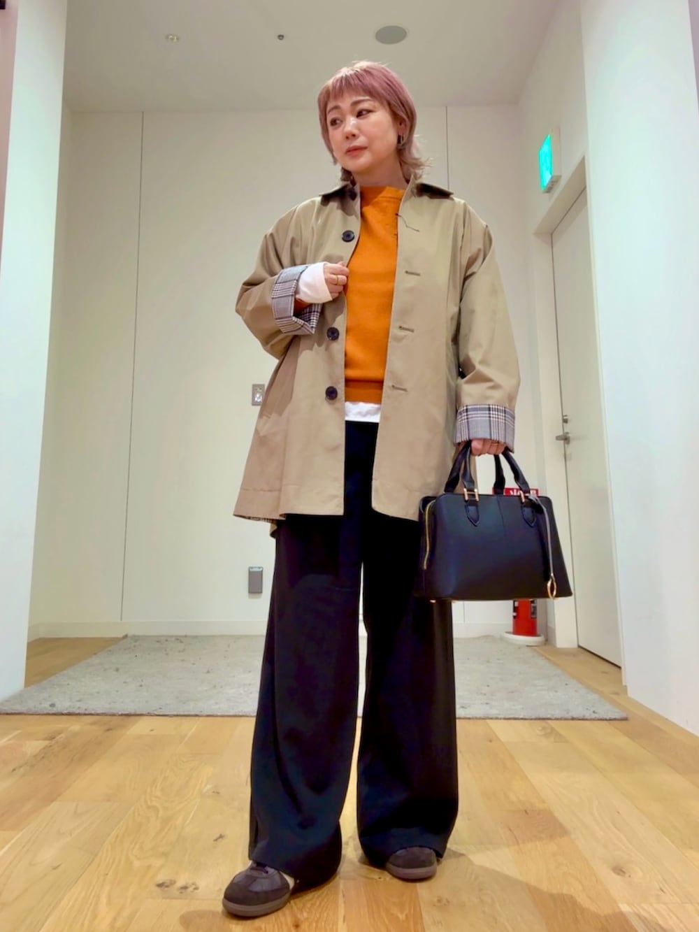 キレイなオレンジのニットは着心地がとてもよくほどよいサイズ感で着られます。オレンジが映えるようにインナーに白のカットソーを入れて着用しました。パンツはウエストゴム、3サイズ展開なので自分に合ったサイズがみつかる、嬉しいパンツです。楽ちんですが、ラインを拾い過ぎないのにキレイに履けるパンツです。アウターは、どんな服にも合わせやすく、裏地のチェックが可愛いコートなのでおすすめです!是非お試しください。