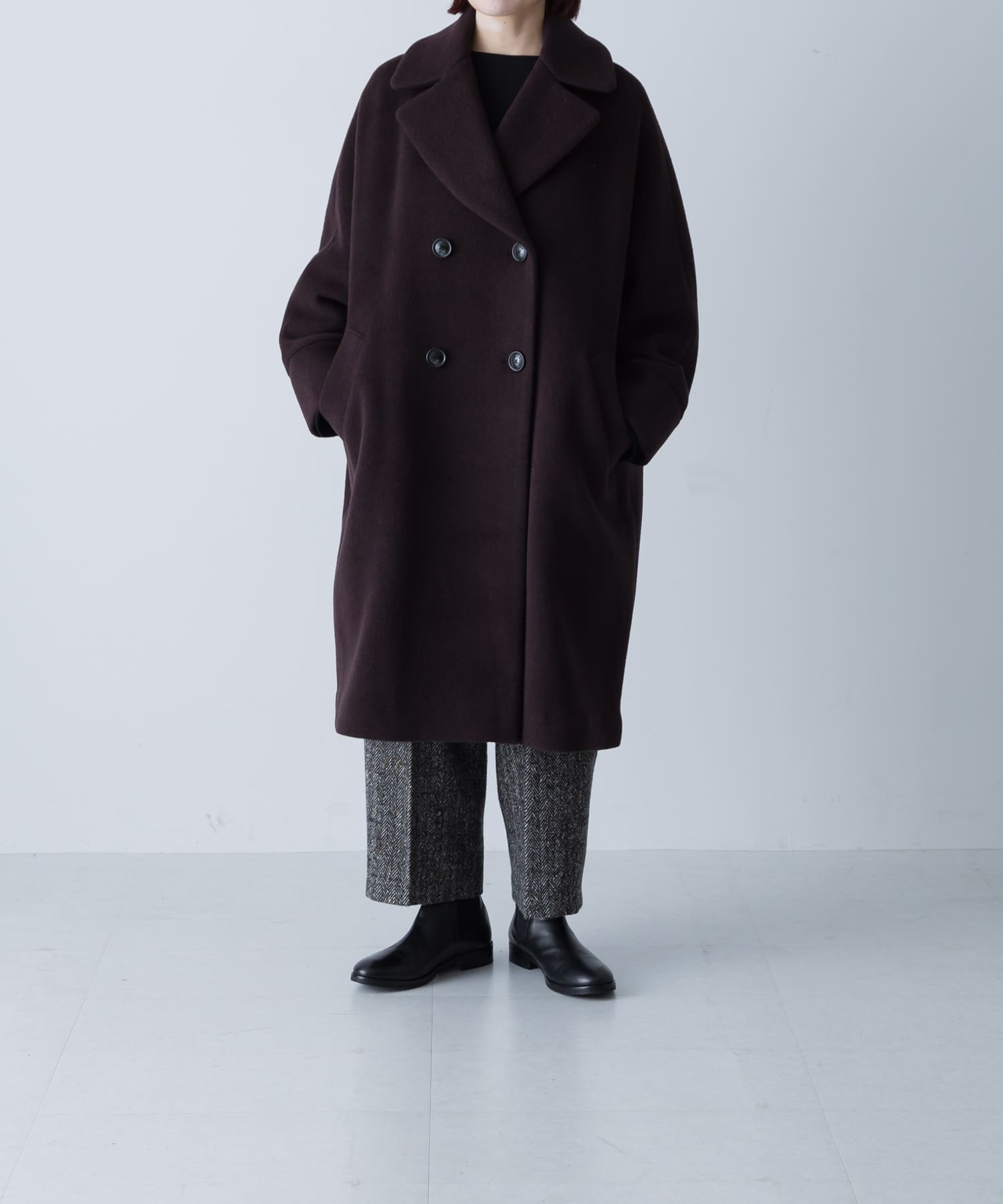 TICCA定番のテントコートは大振りな襟元が華やかな印象です。肩の切り替えが無いためどんな肩幅の方でも綺麗に着ていただけます。見た目以上に軽い着心地な点も◎