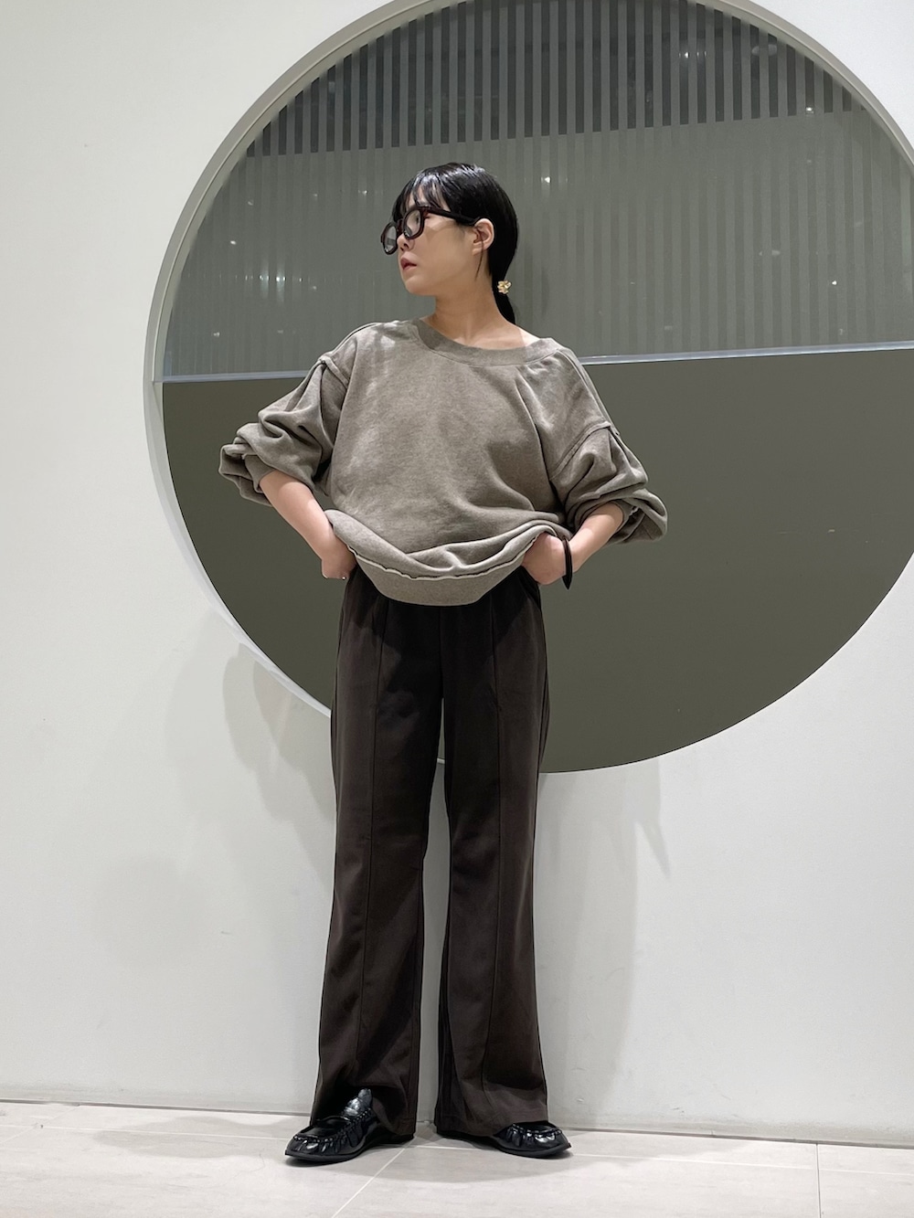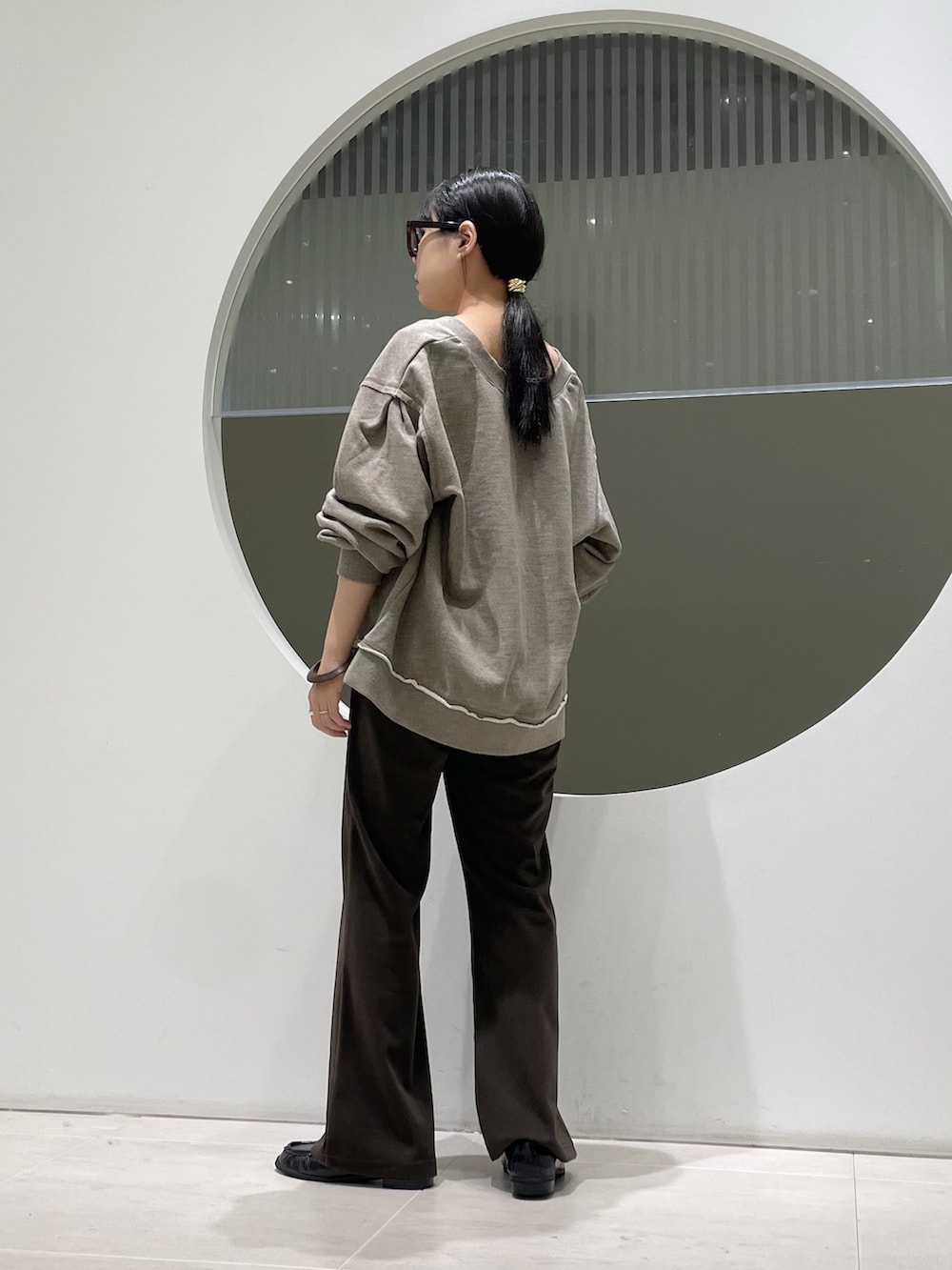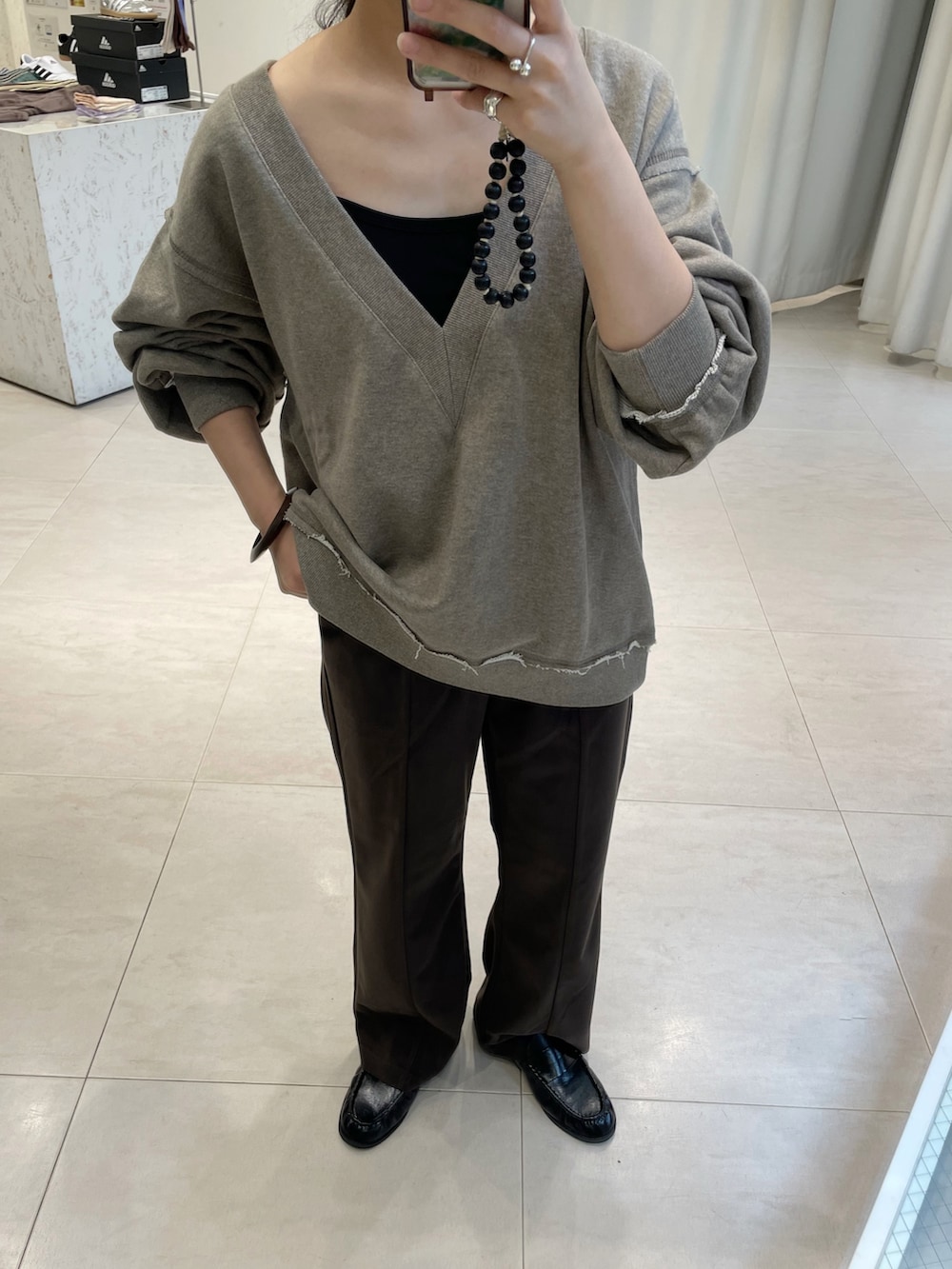ニットは前後2WAYです!スウェットでカジュアルな印象ですがキャミ合わせだと女性らしく着れます。フレアパンツは着丈が長めのものと合わせるのが◎微起毛で着心地も良いです!