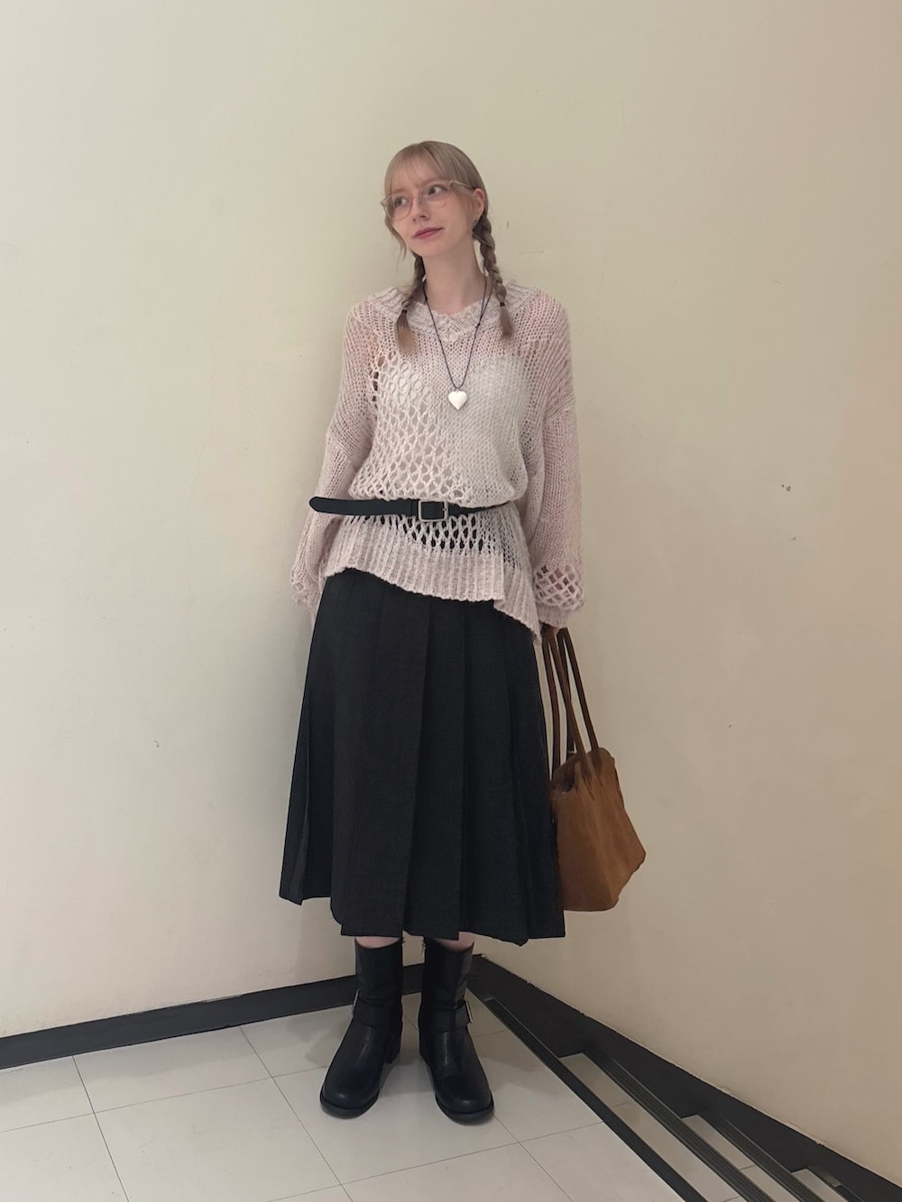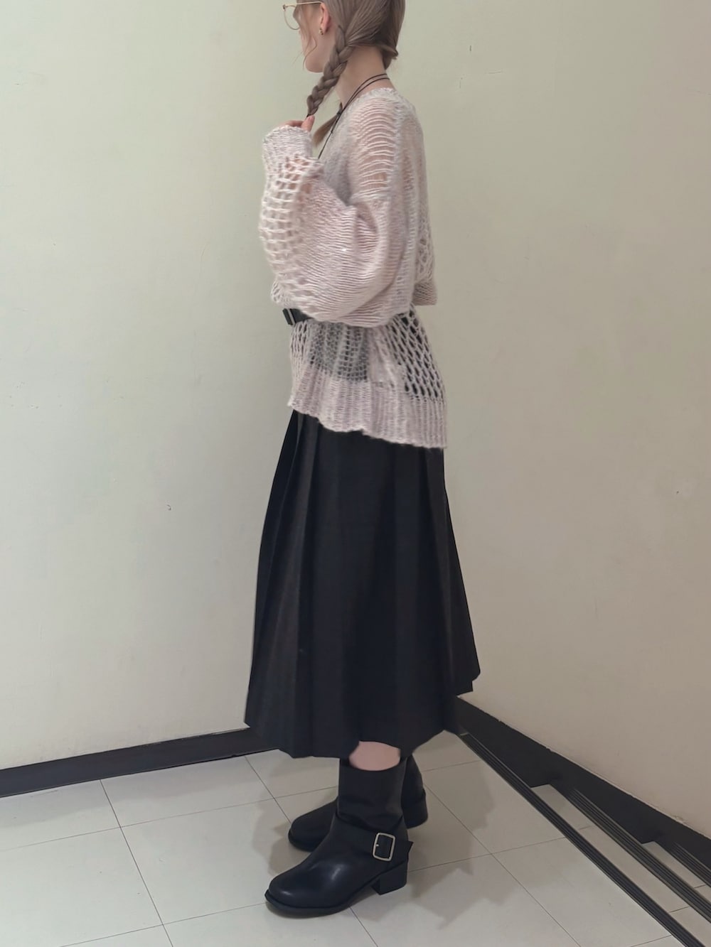 ピンクのスパンコールがきらきらしていて可愛いアイテムですが、プリーツスカートとブーツ合わせで甘さ控えめにしました!