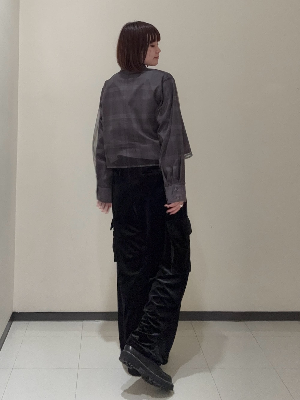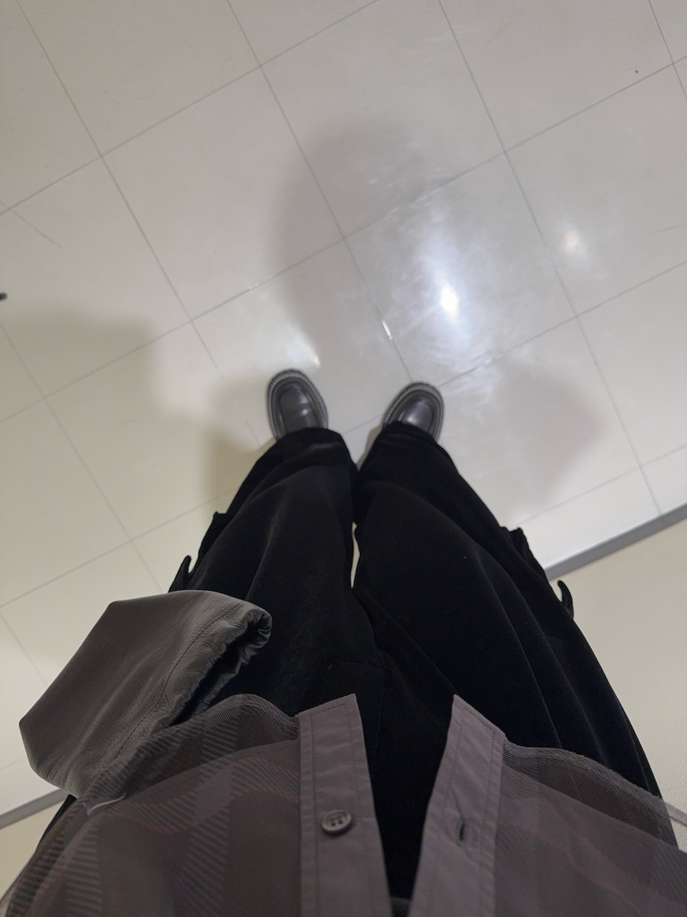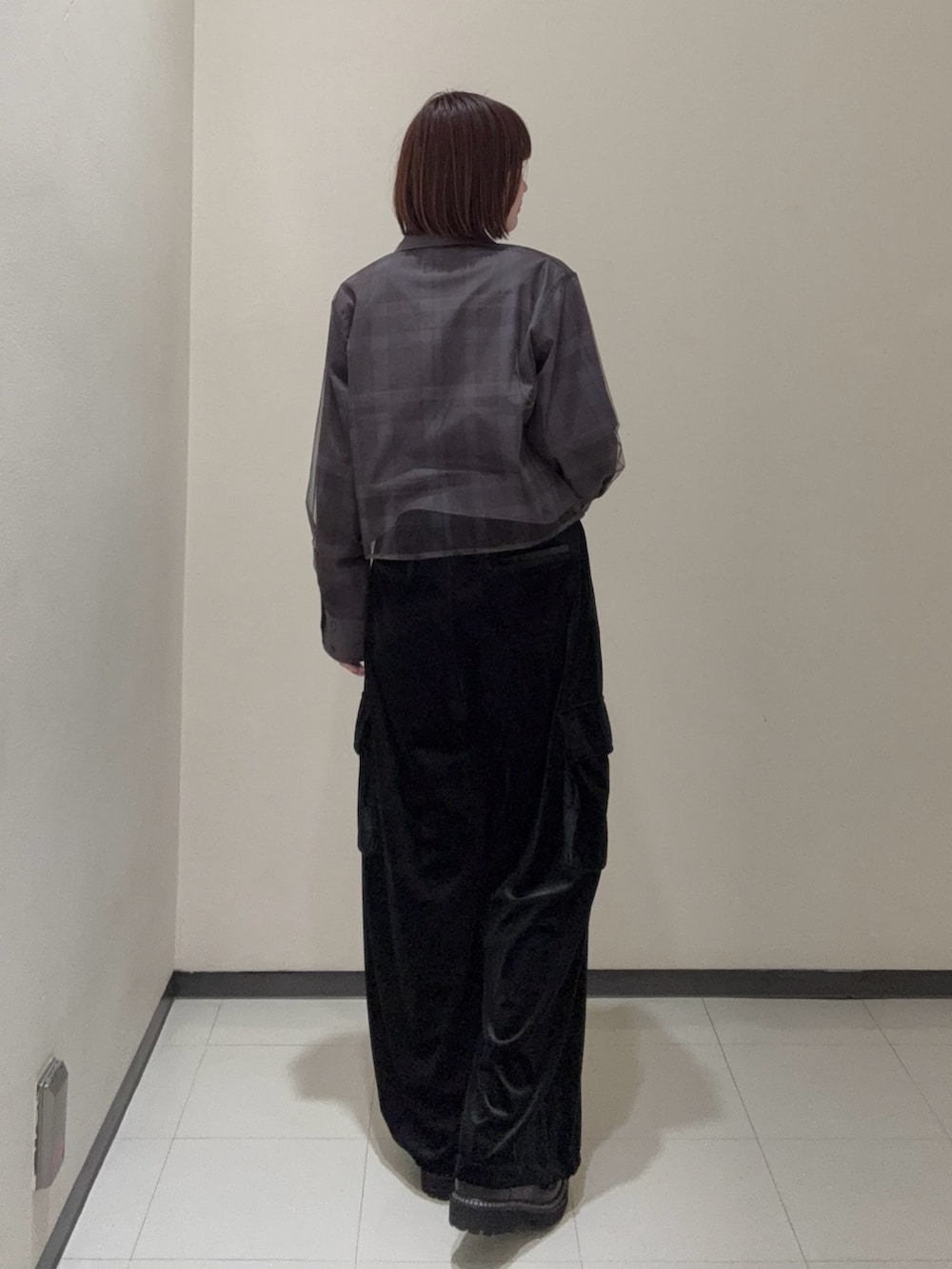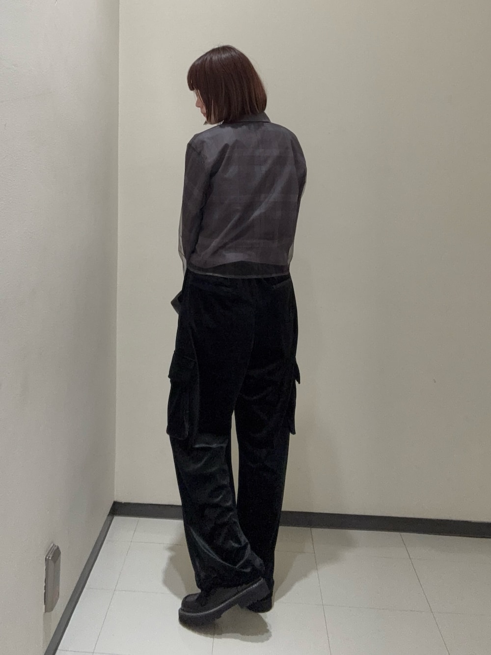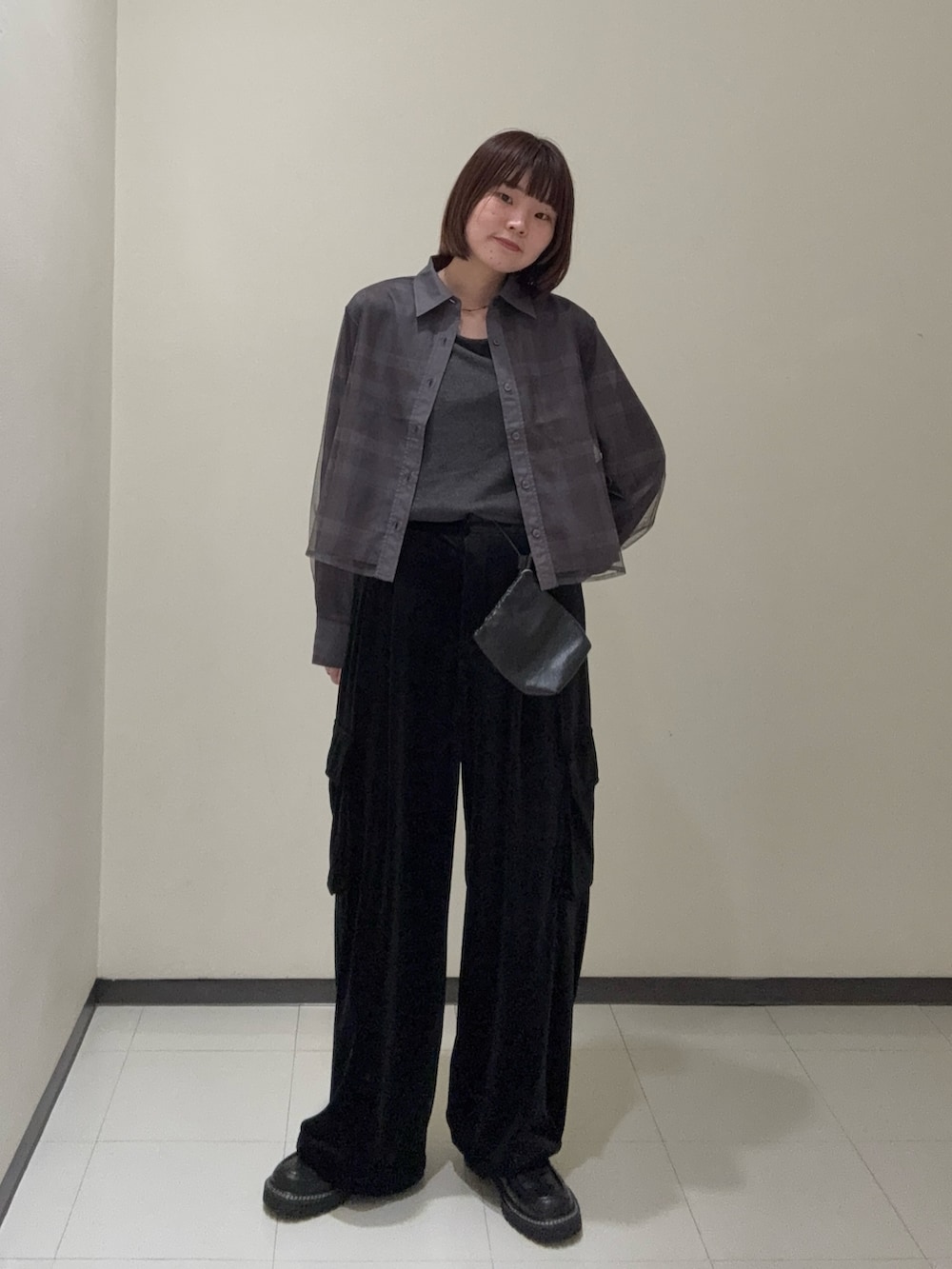 ベロアのパンツ、ローファーとバッグの素材感を変えながらも、黒で統一感のあるコーデにしてみました!