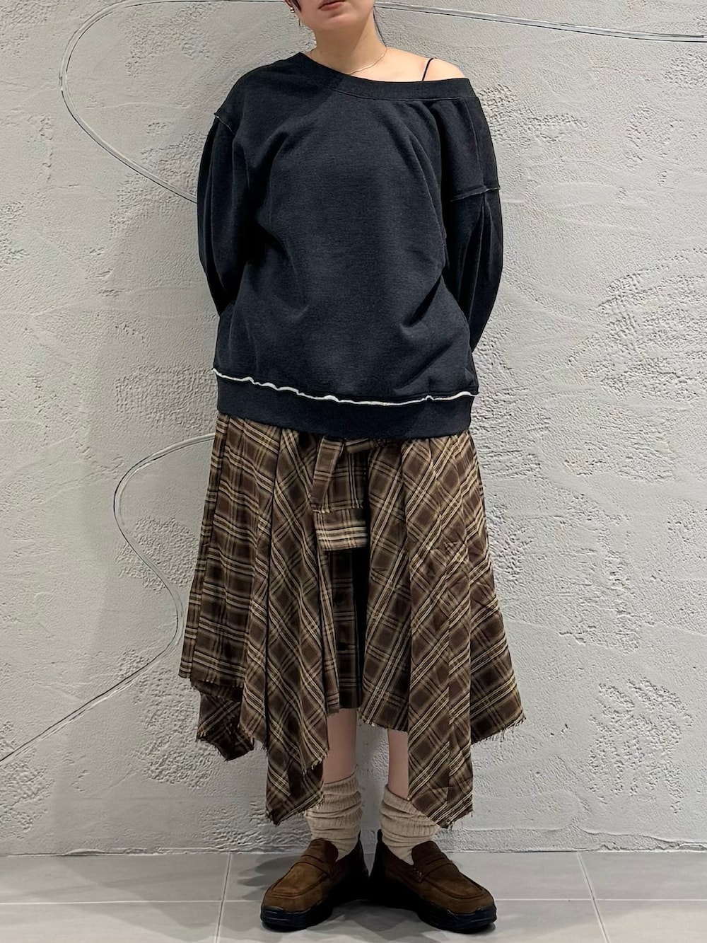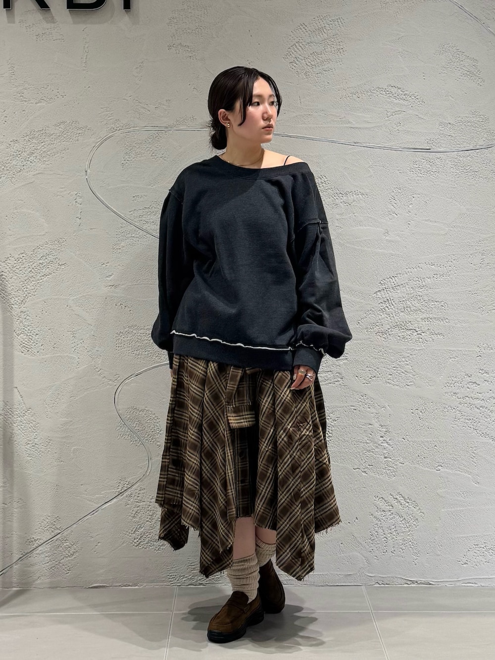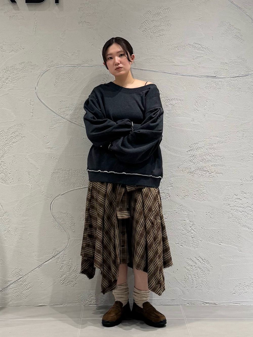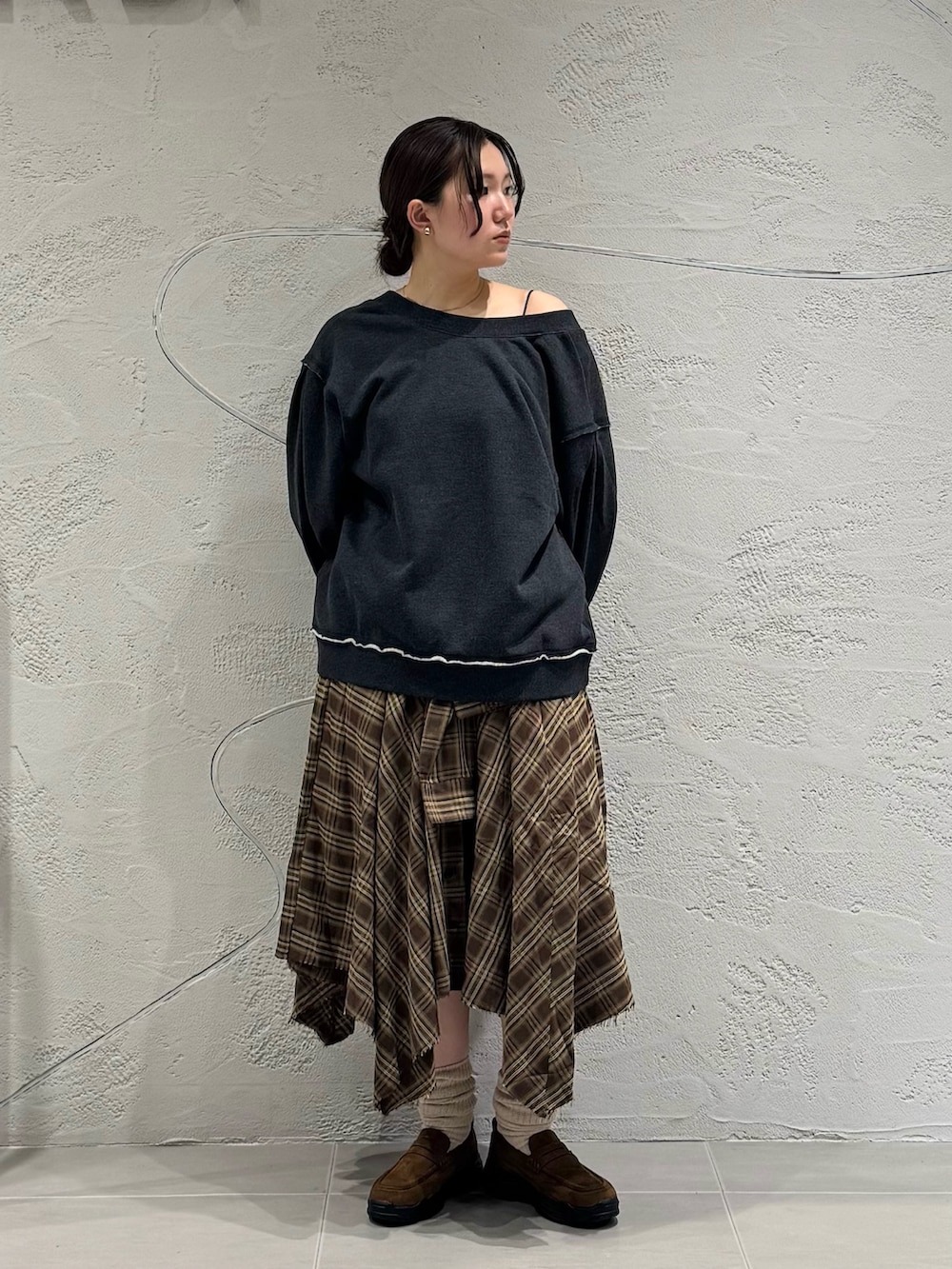 ボトムスはシャツを腰巻きしたようなデザインが特徴的な変化球スカートに、足元はスニーカソールのローファーを合わせてカジュアルに