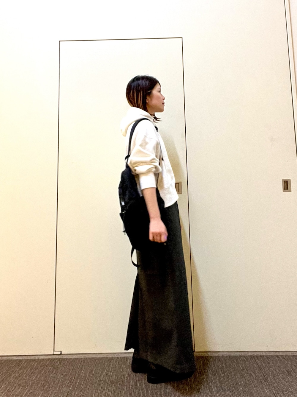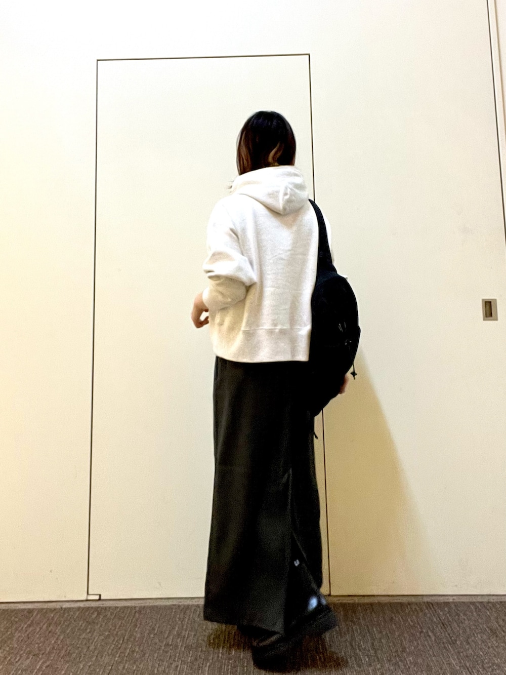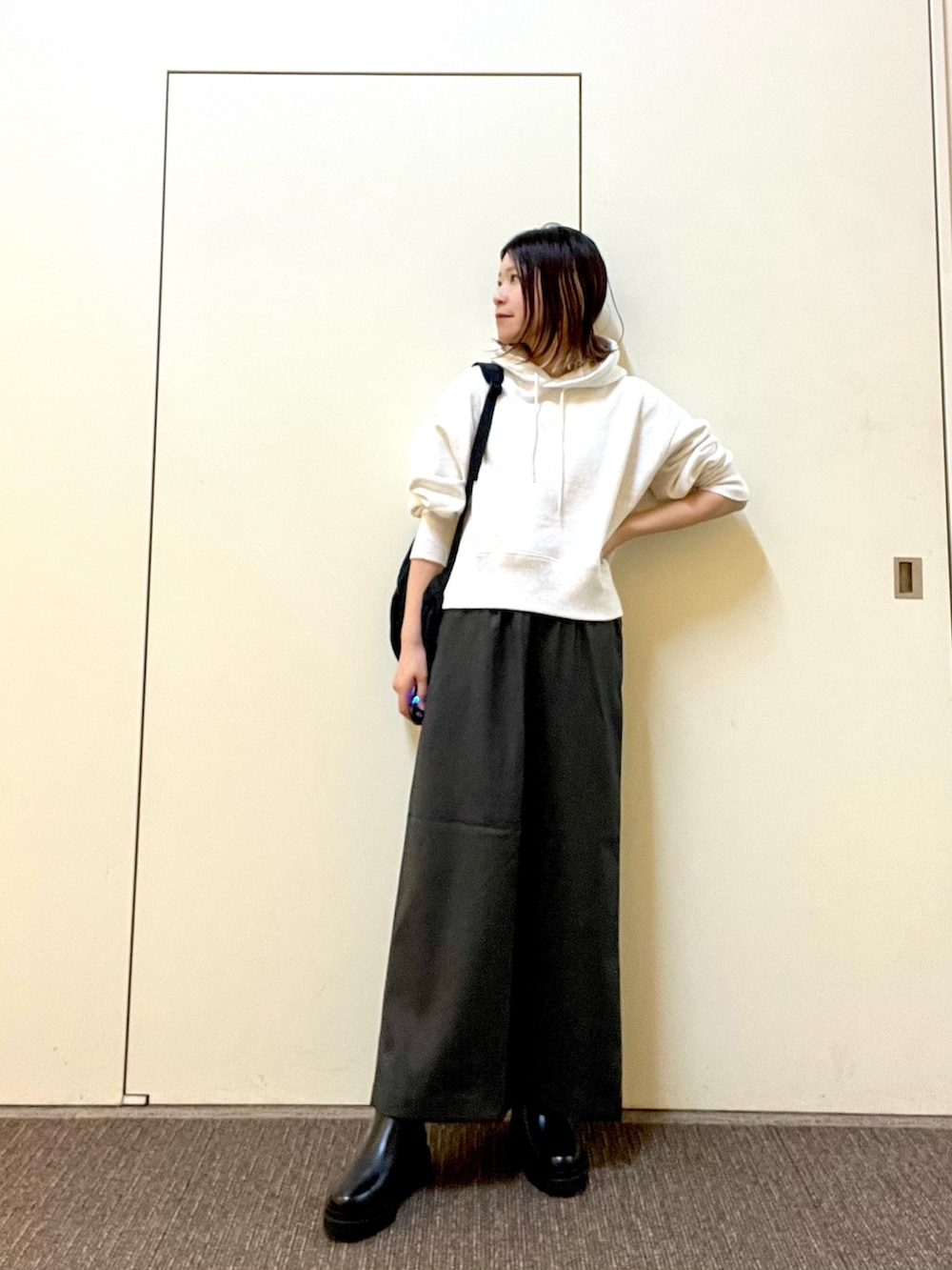 コンパクトな着丈のフーディーは裏起毛なので真冬まで出番のあるアイテムです🧣ボリュームのあるボトムスとの相性が良いです◎