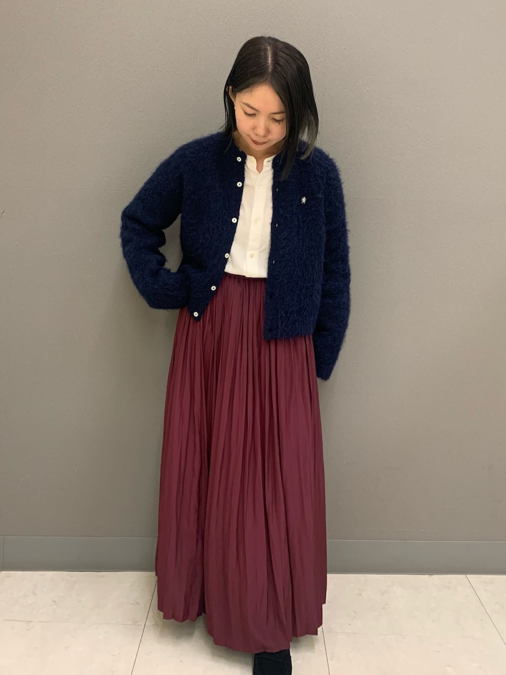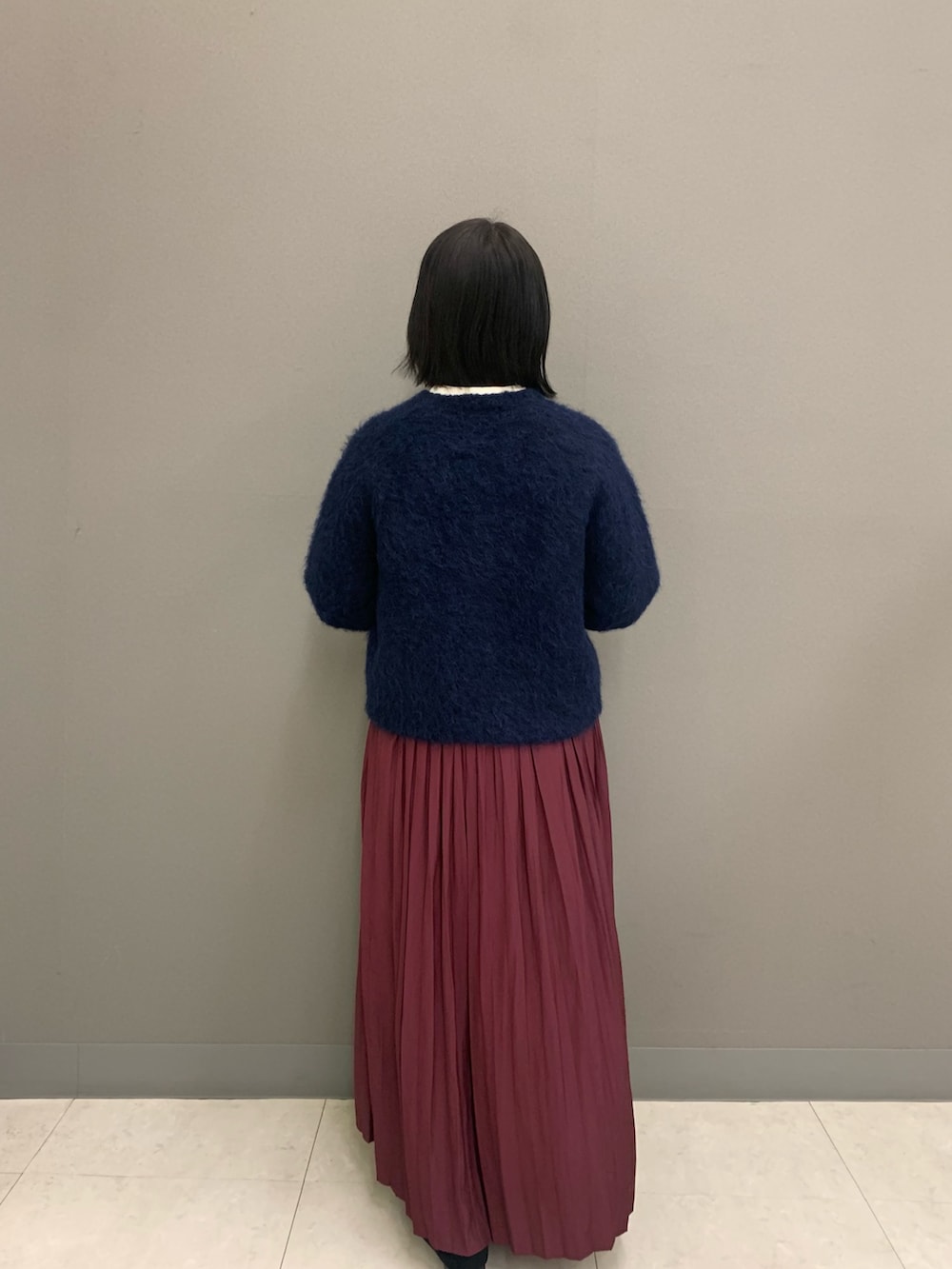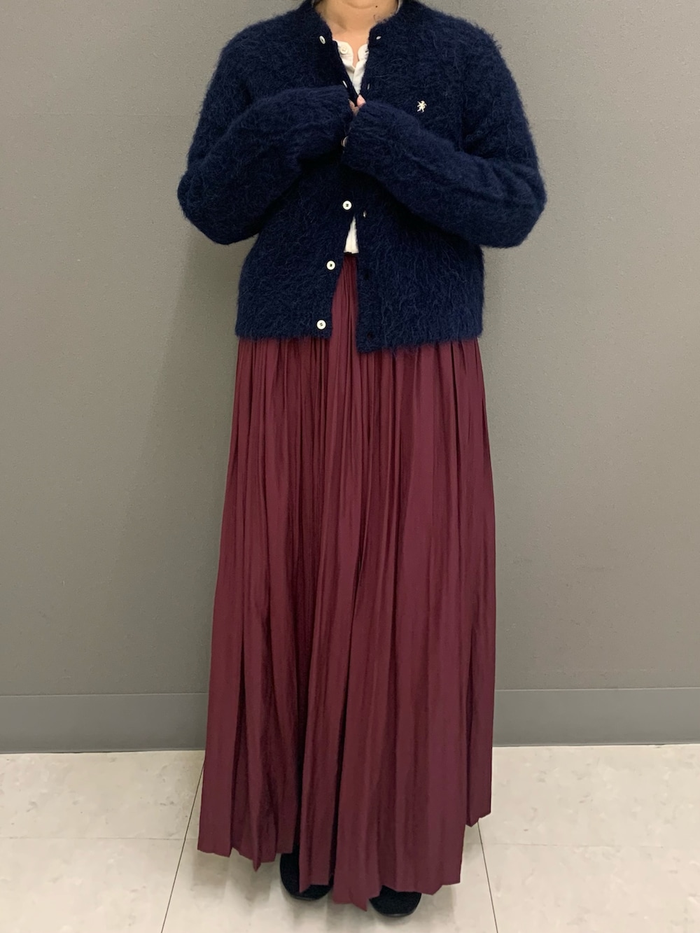 ランダムプリーツのスカートは程よく光沢があり、シワを気にせず柔らかいシルエットで履いていただけます。