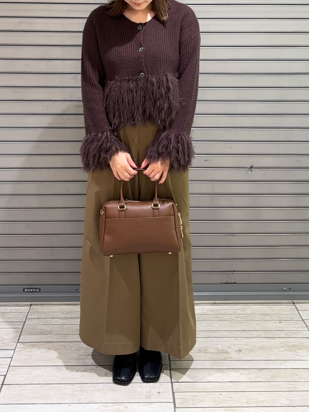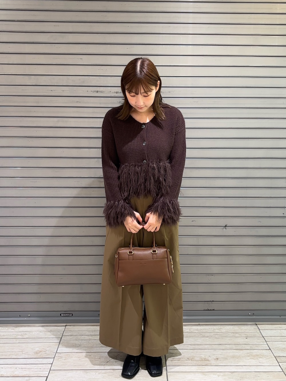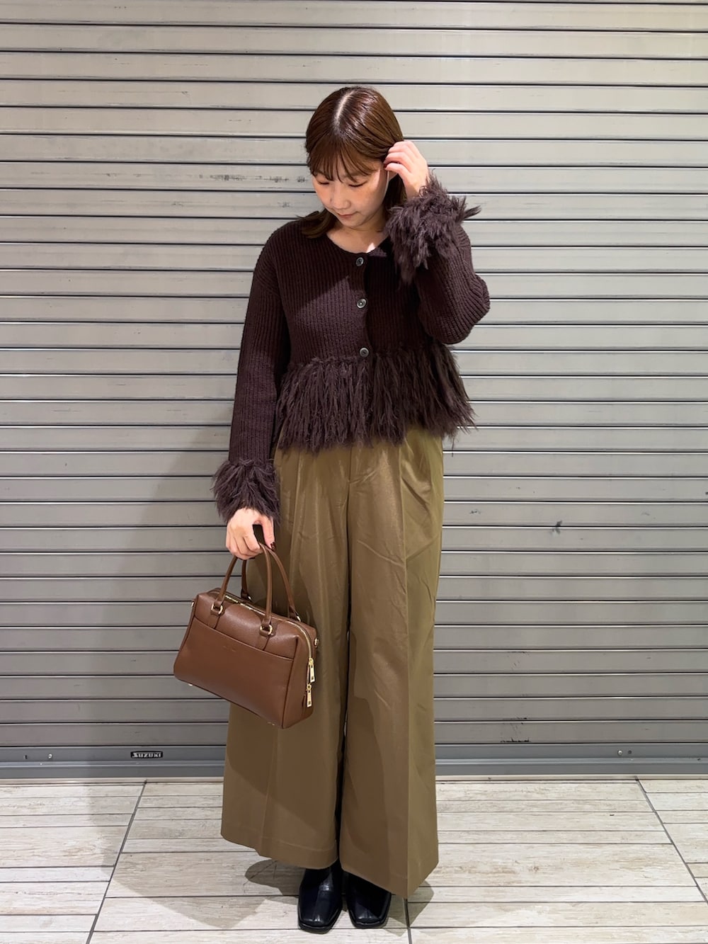 フリンジのついたニットにバギーパンツを合わせて綺麗めコーデに。
