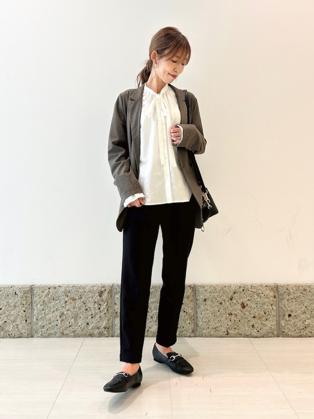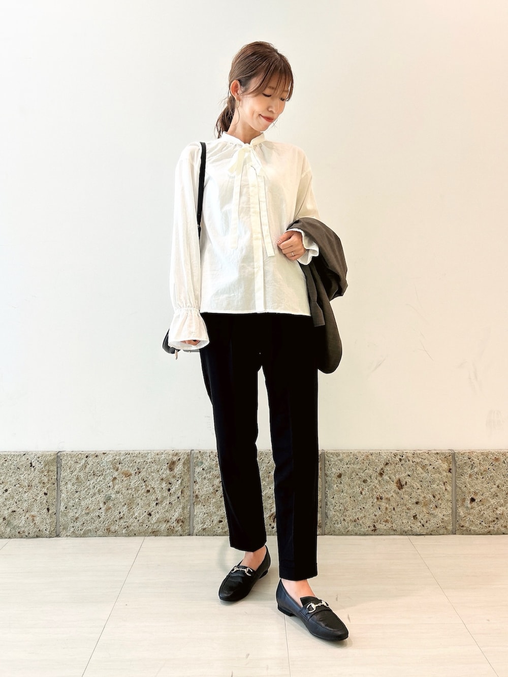 ブラウスは袖のフリルと、首元のリボンデザインが可愛い一着。