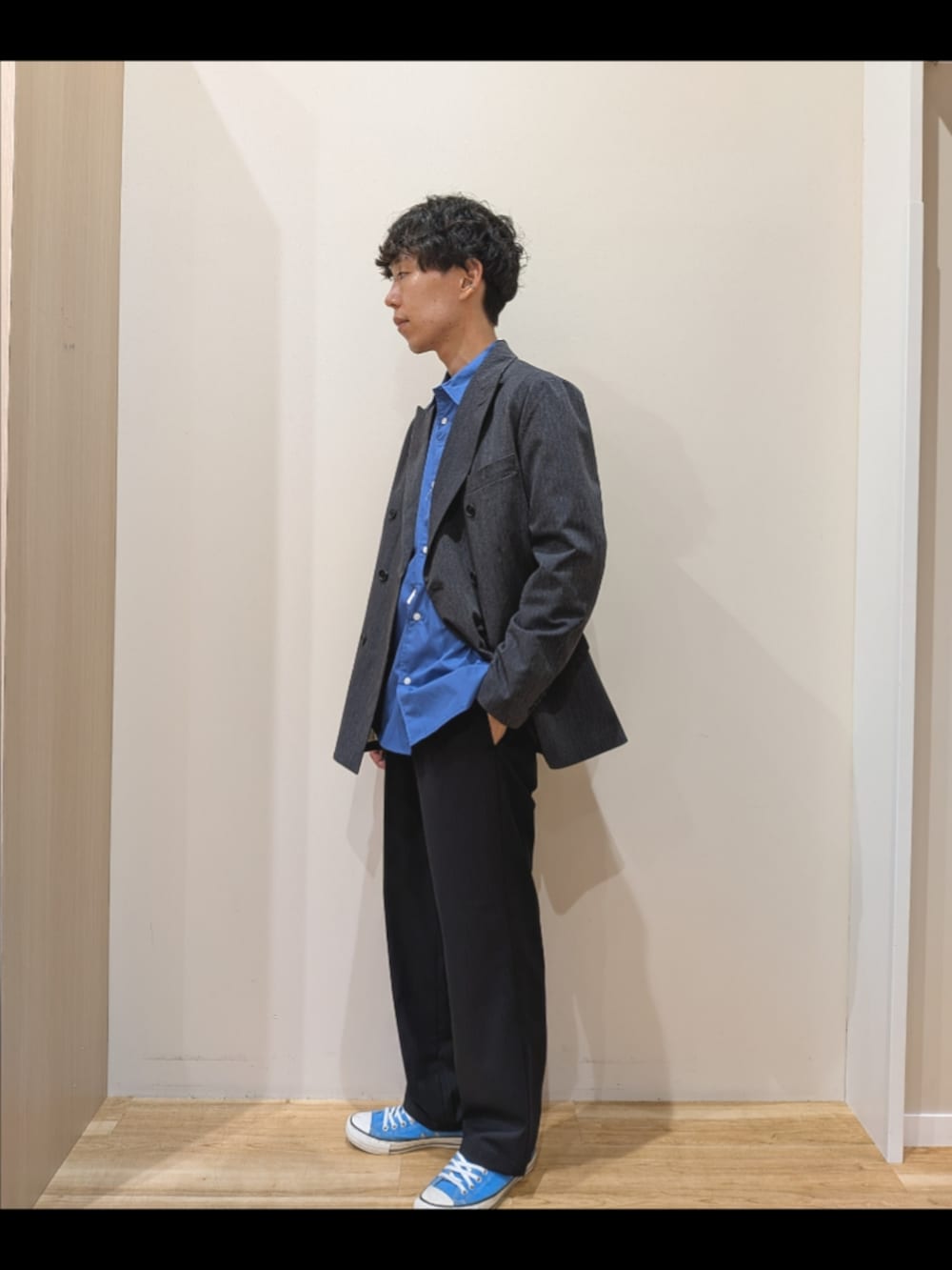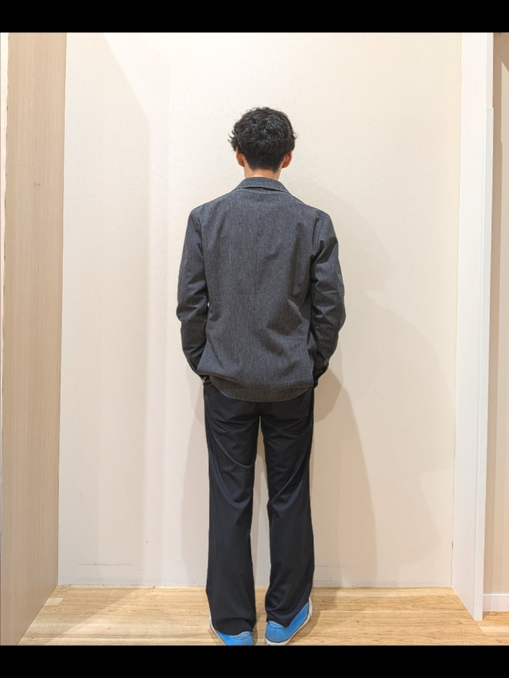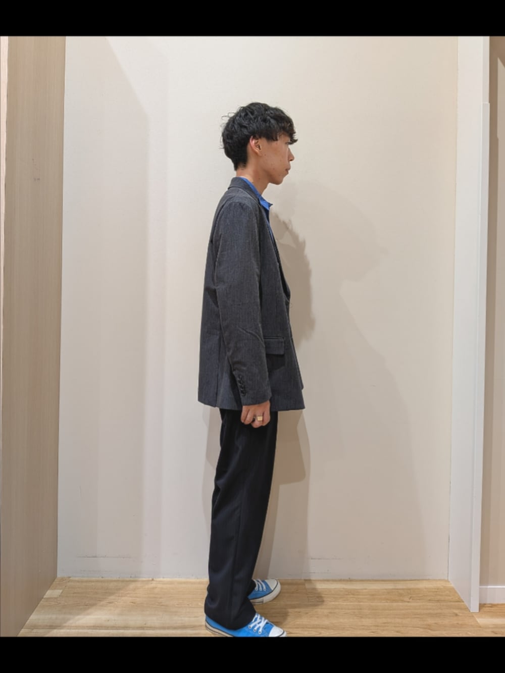 ジャケット×スラックスの綺麗目コーデになります。