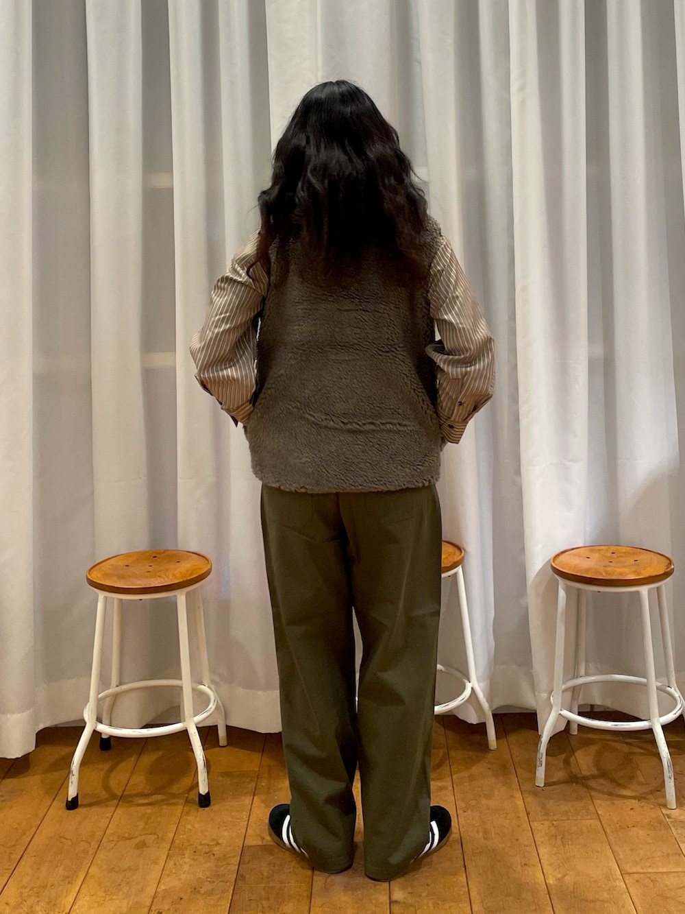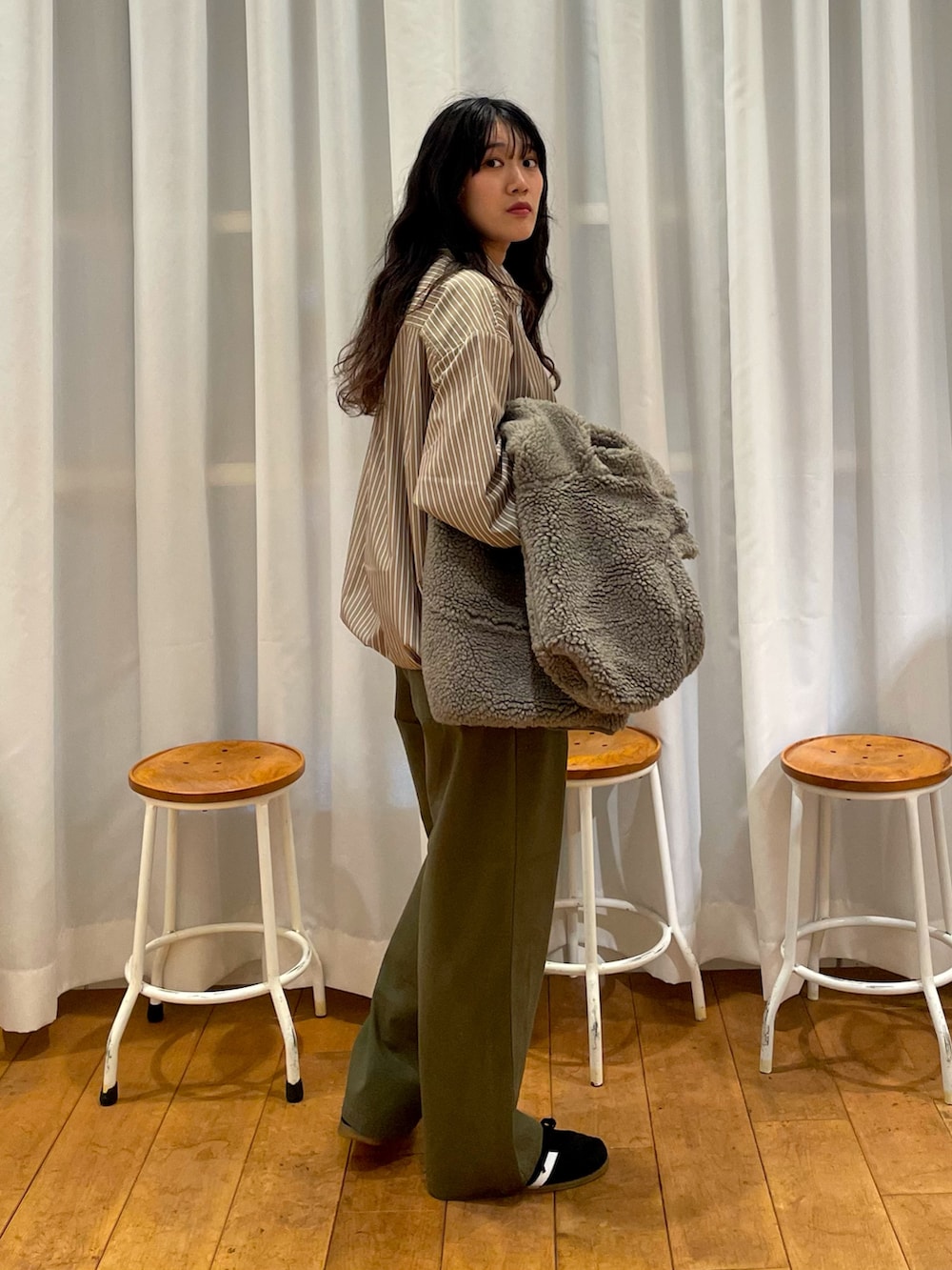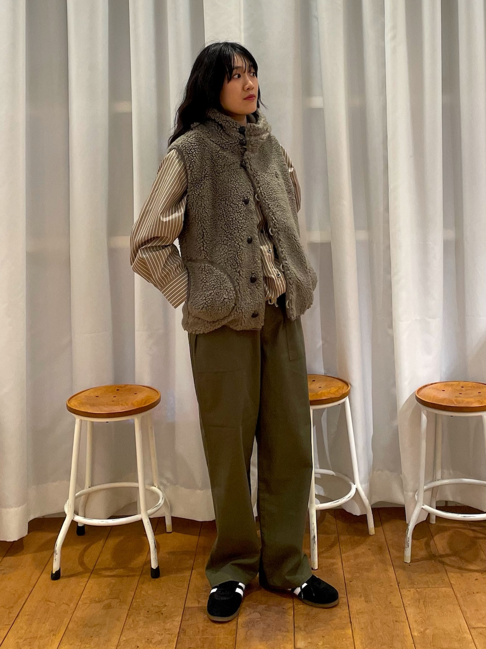 adidasのgazelleのスニーカーも秋冬らしい素材感で、