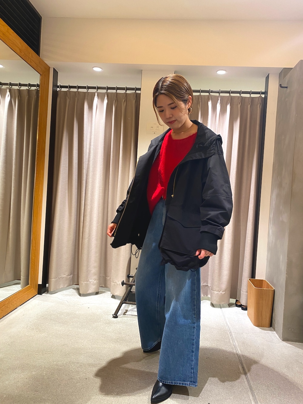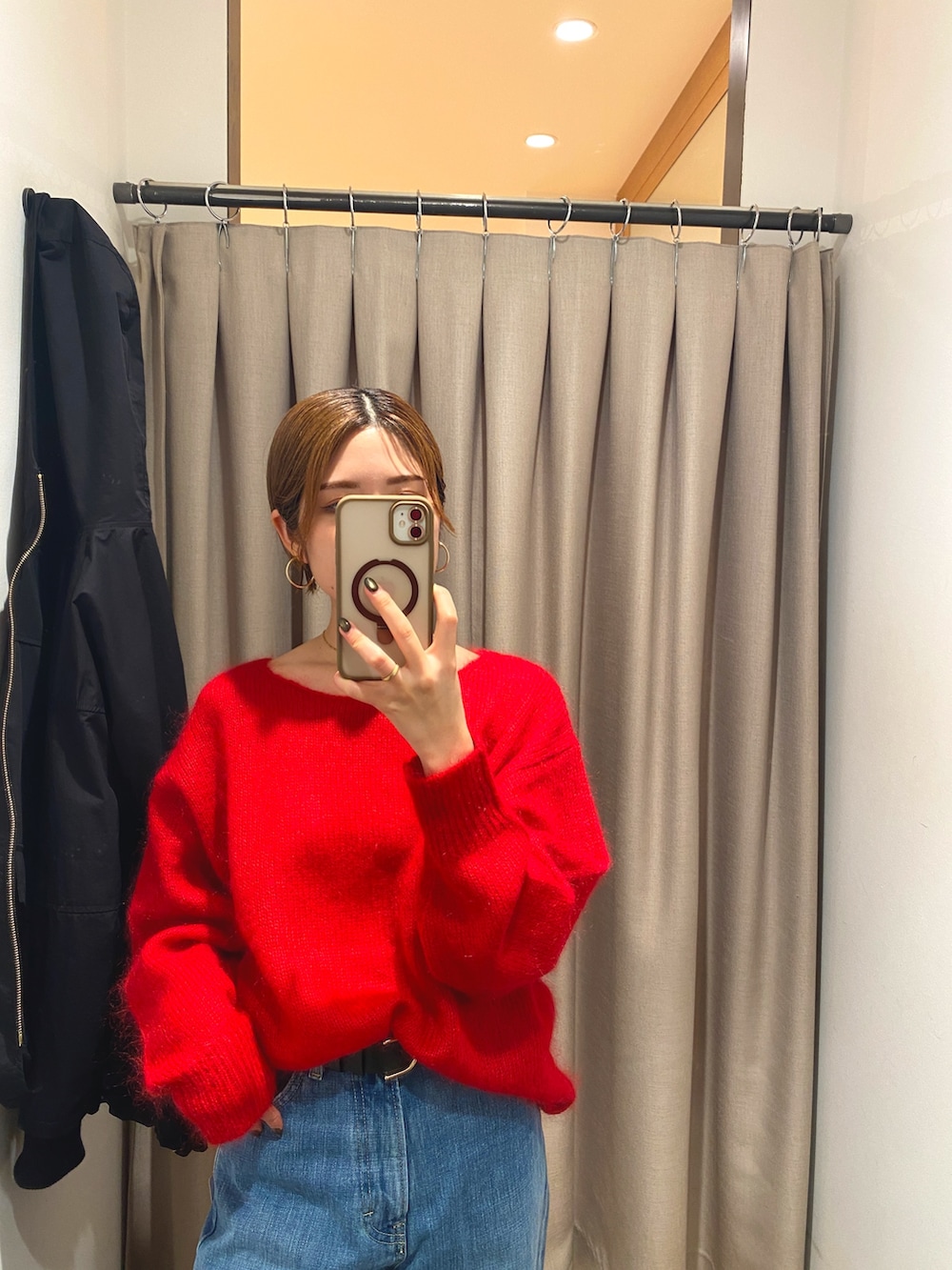ふんわりと柔らかな質感で、ほんのり透け感も女性らしいニットです🧶赤は冬のコーディネートの差し色としても大活躍です。