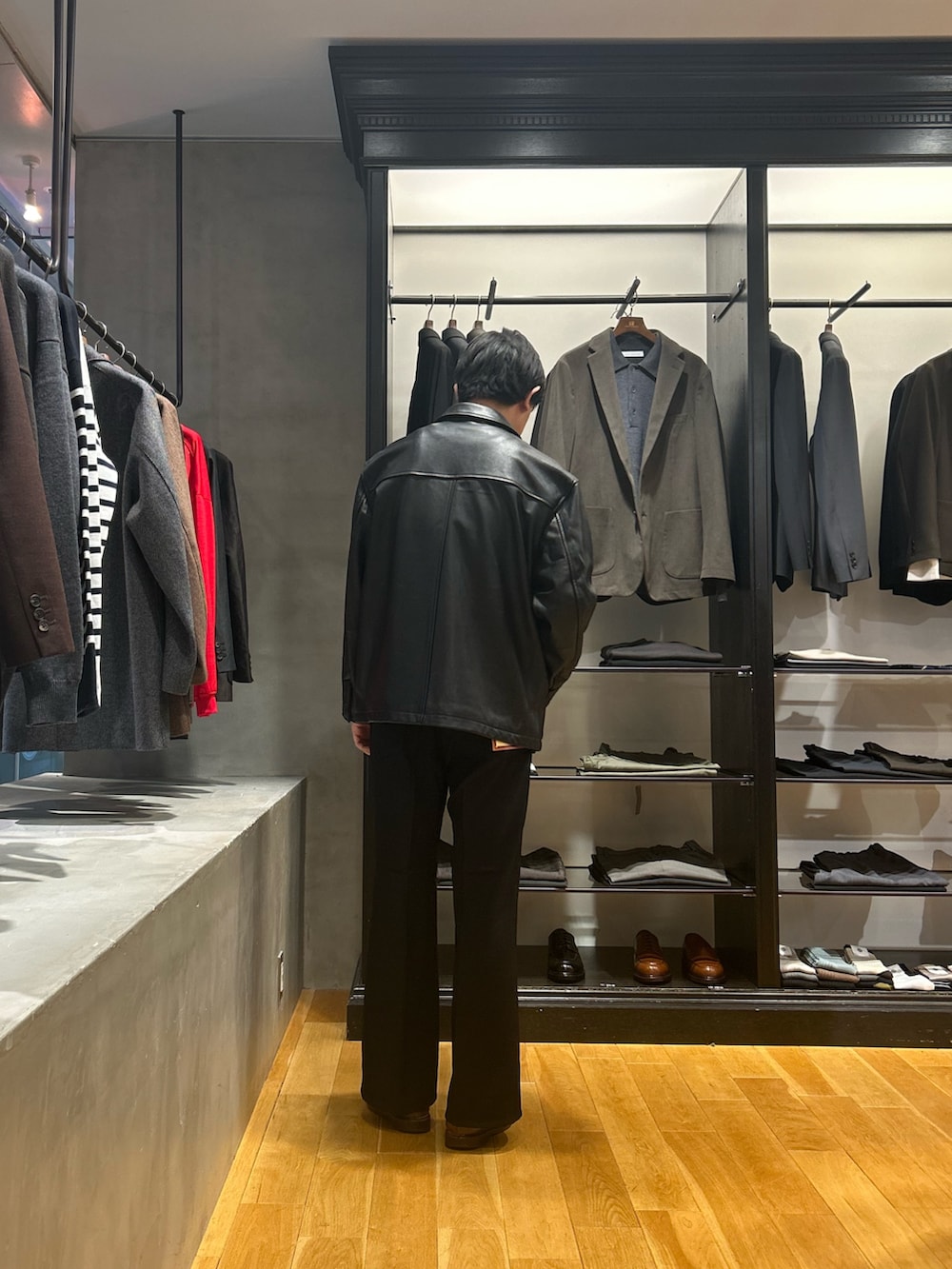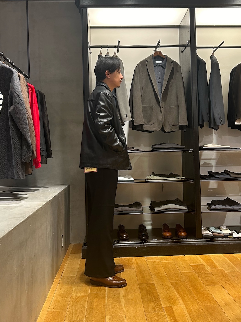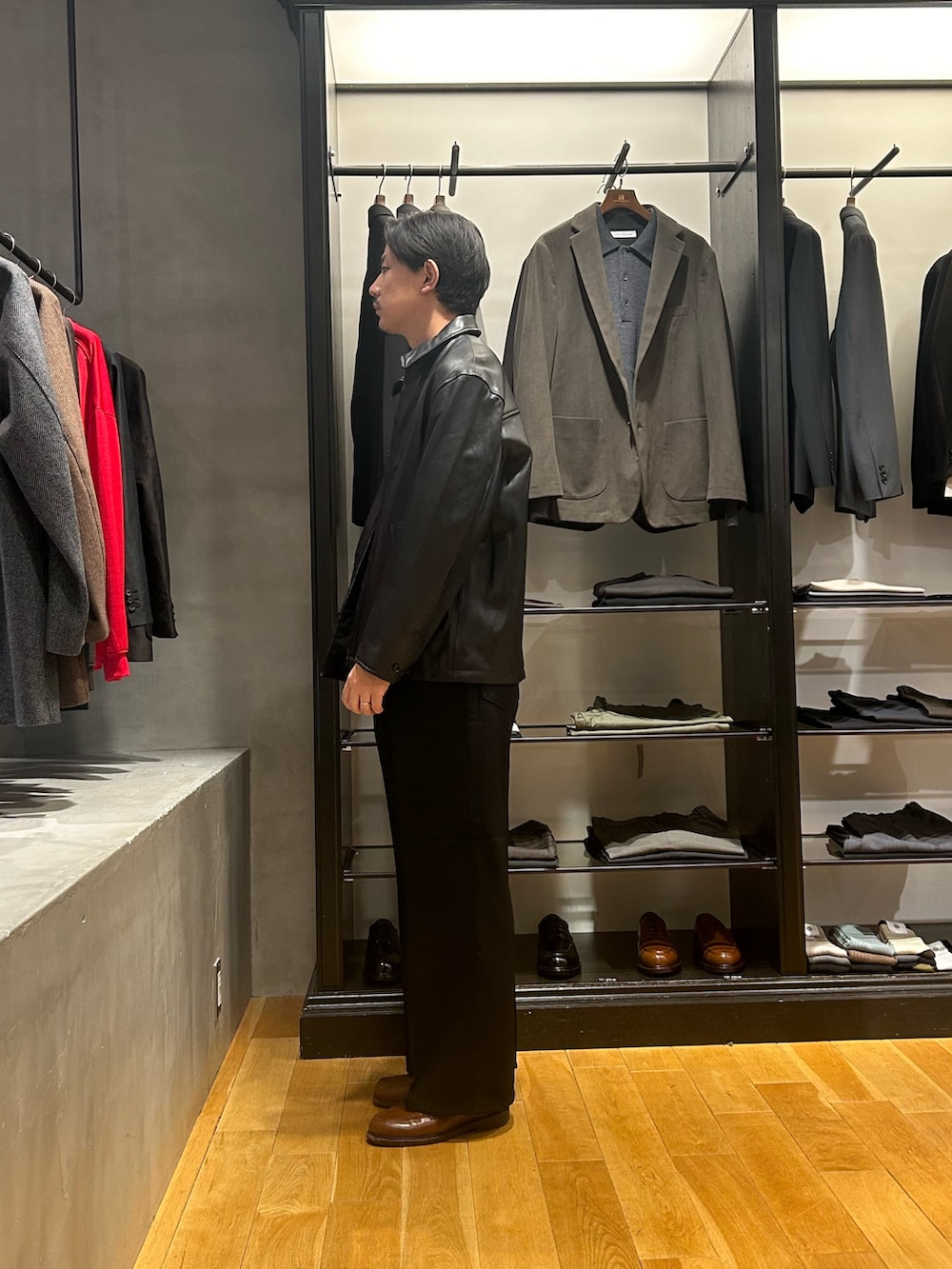 抜群にシルエットが良いパンツにはシンプルながら最高にかっこいいレザージャケットを。