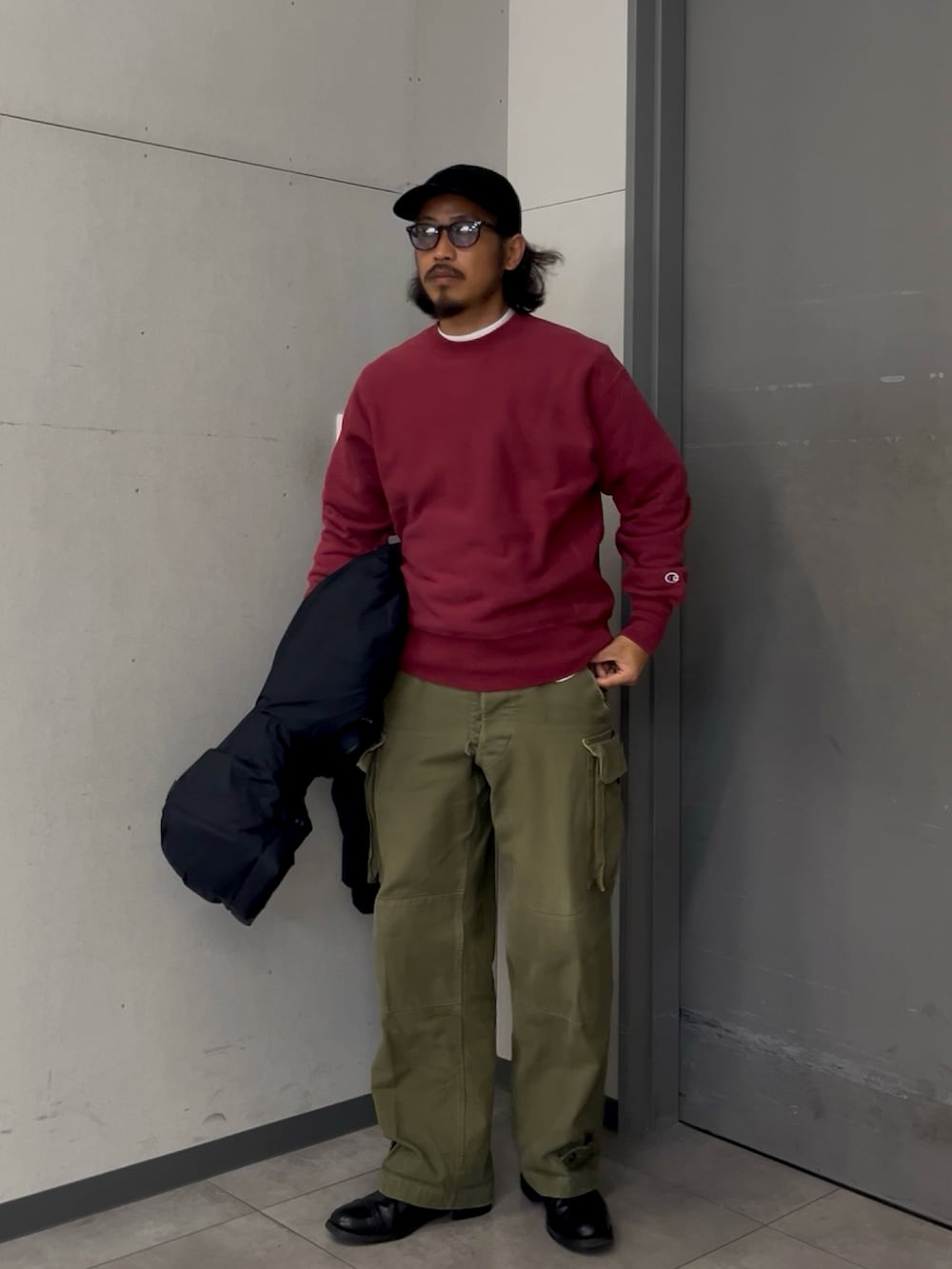 差しのスウェットはカラーが目を引くchampion別注でジャストサイズで着るのがミソ