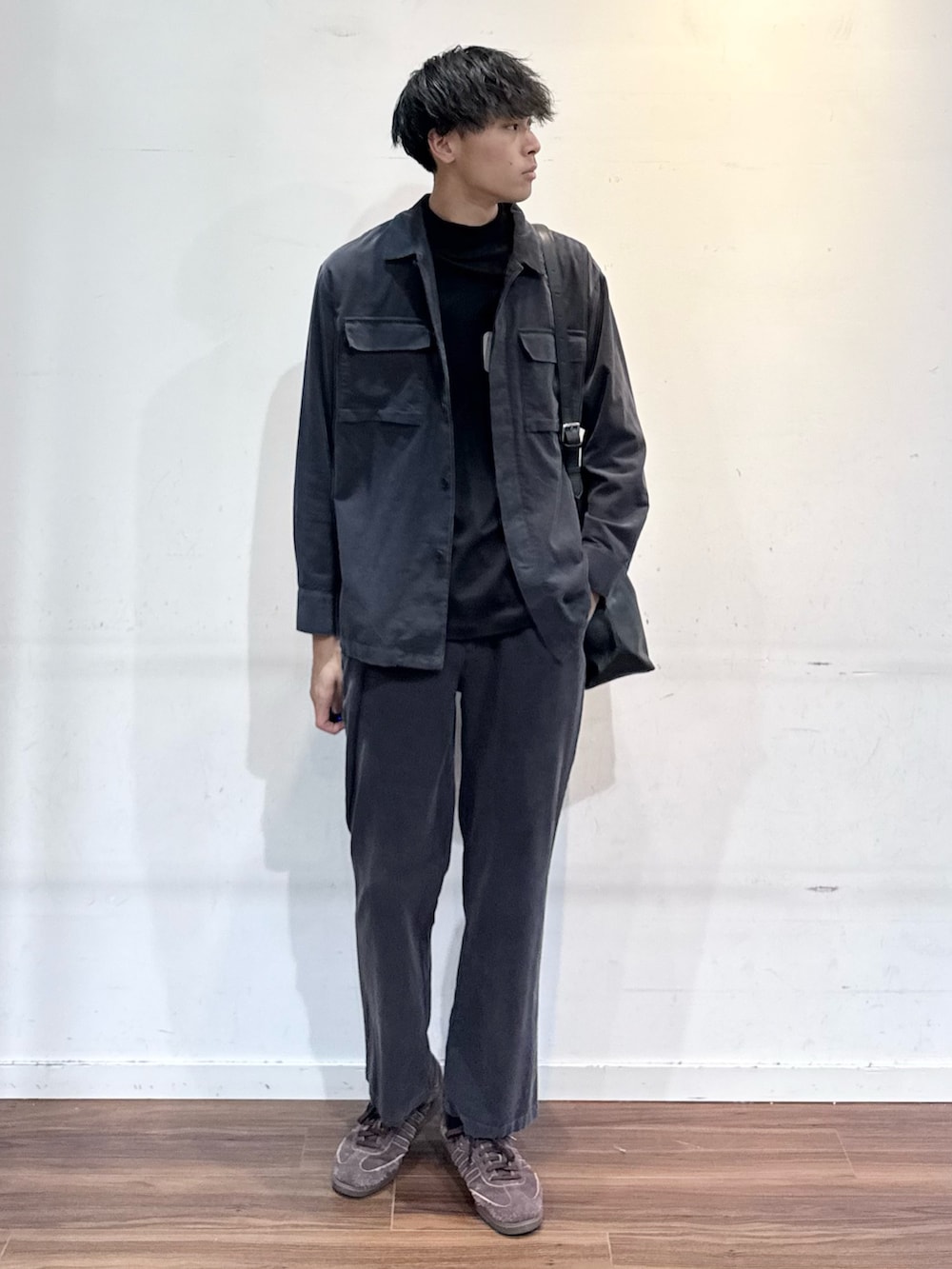 アウターはオーバーサイズ過ぎないシャツジャケット。パンツも太過ぎないストレートシルエットなので、ダボっと感がないのが良いところ。