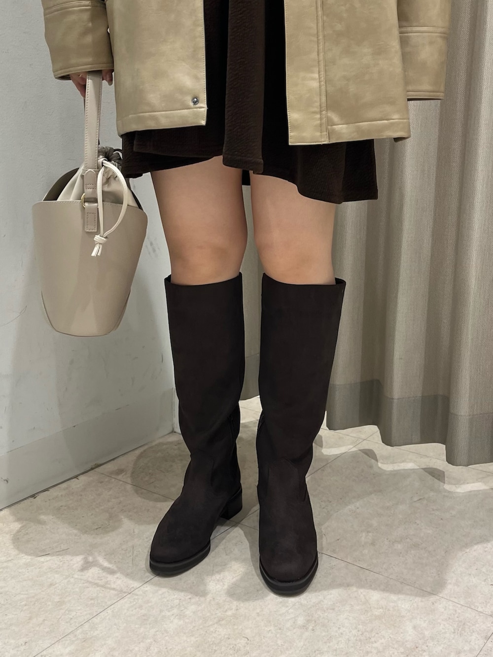 ミニ丈のアイテムはロングブーツと合わせると、肌が出る面積がかなり減るので脚出すとそわそわしてしまう…!という方にはおすすめ。