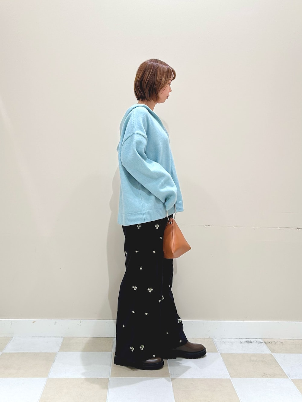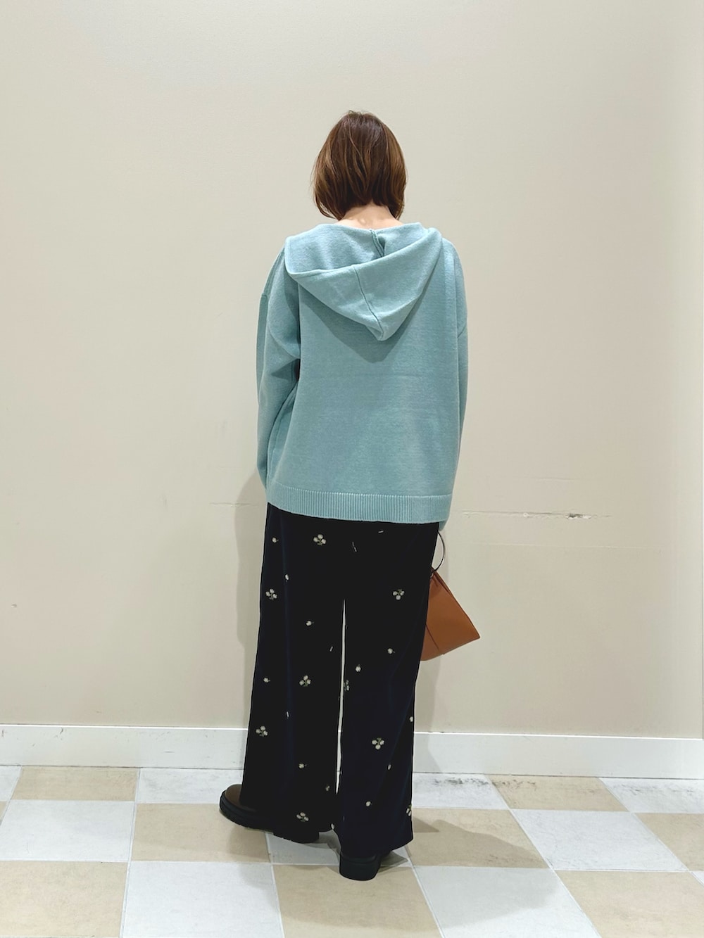 鮮やかなブルーがポイントのニットパーカーと刺繍ベロアパンツのカジュアルコーデです!