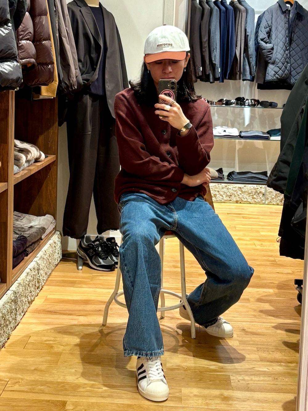ハミルトンのニットカーディガン。ラムウールの柔らかい着心地とワインレッドの上品さ。