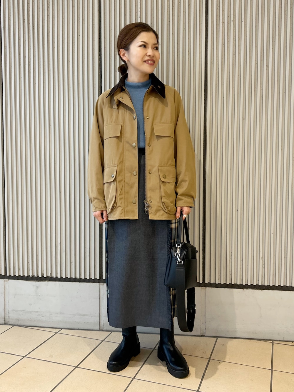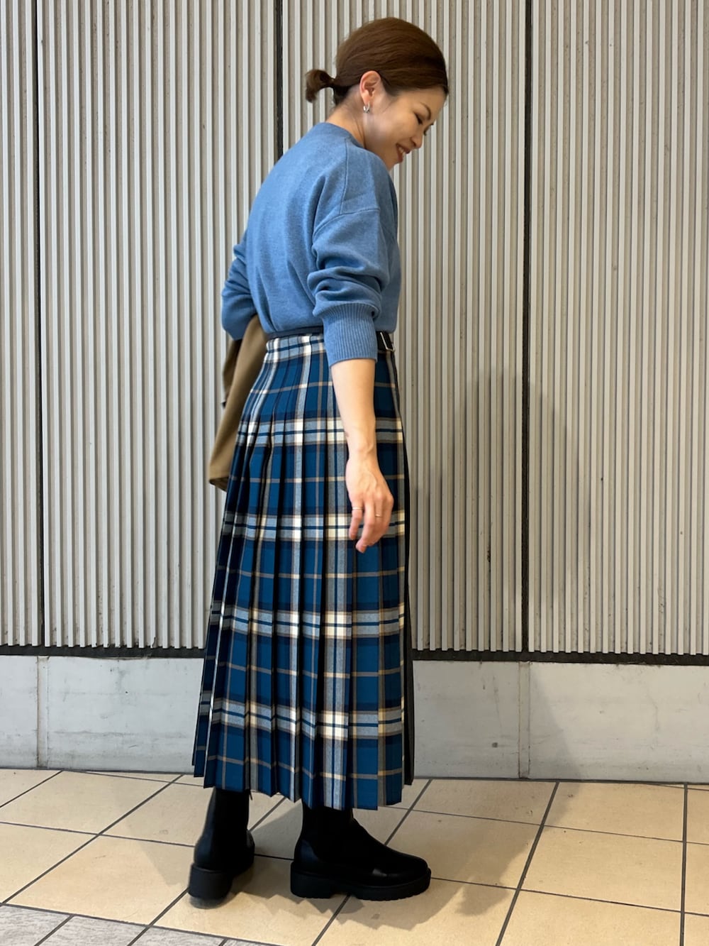 まずはトップスのボトルネックニット、着用のブルーはたまプラーザとEC限定のカラーです🫐グレーを混ぜたような色味で、肌の色の透明感をアップさせてくれる、おしゃれなカラーです🌟
