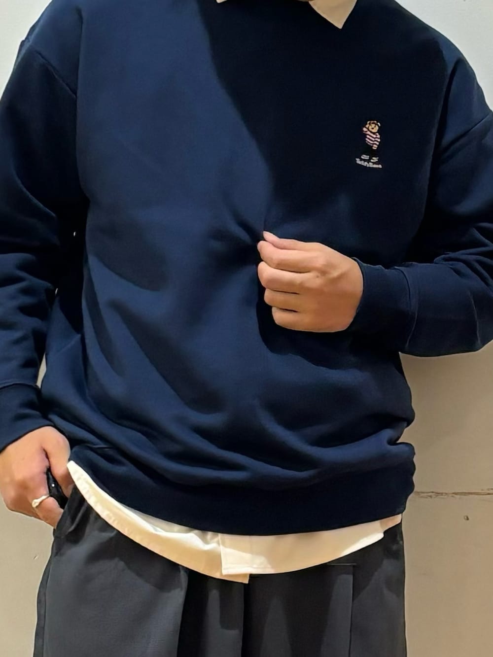 トップスはテディベアの刺繍が特徴的なスウェットです!シャツやパーカーをレイヤードするなどの工夫で寒い時期でも活躍できます!