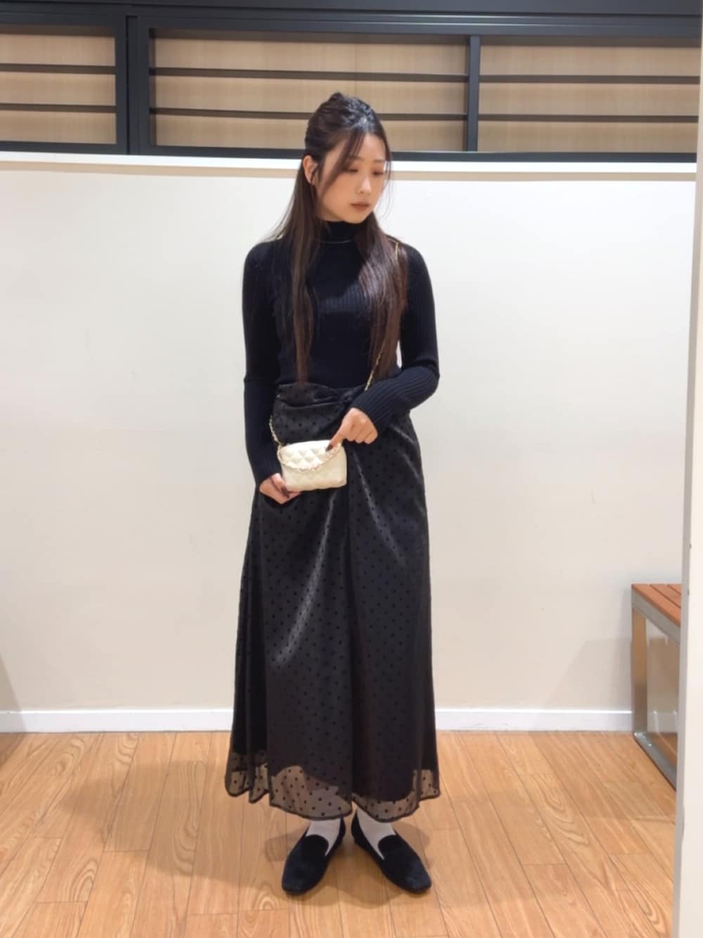 フィット感のあるタートルに、ドットのシアースカートを合わせて抜け感をプラス。