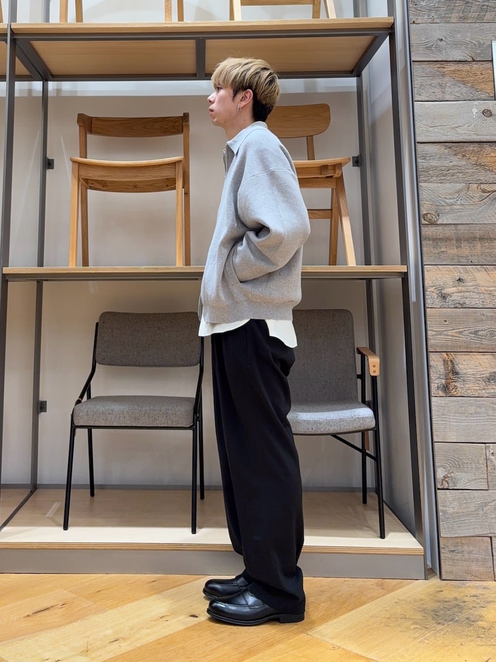 ジップがダブルジップになっているのでそれを活かしてシャツをレイヤードする形にしました。
