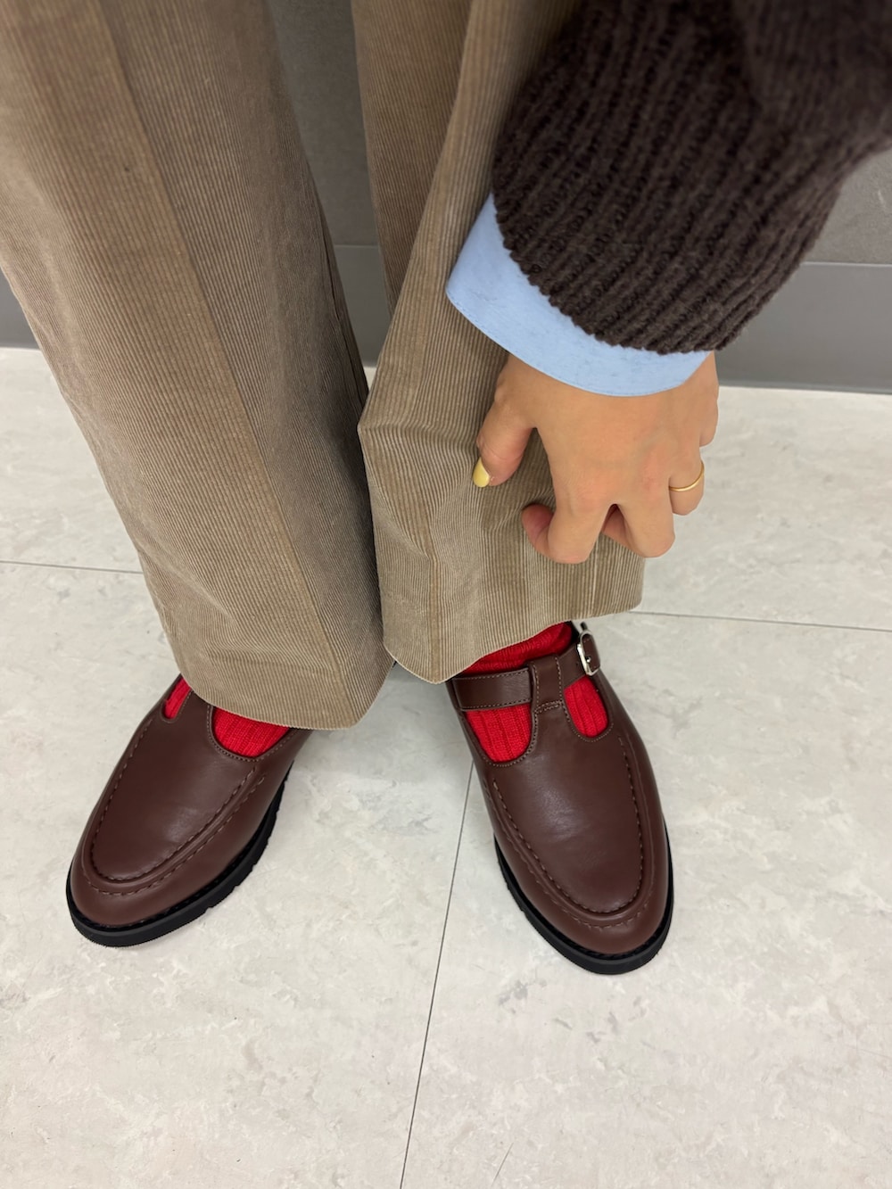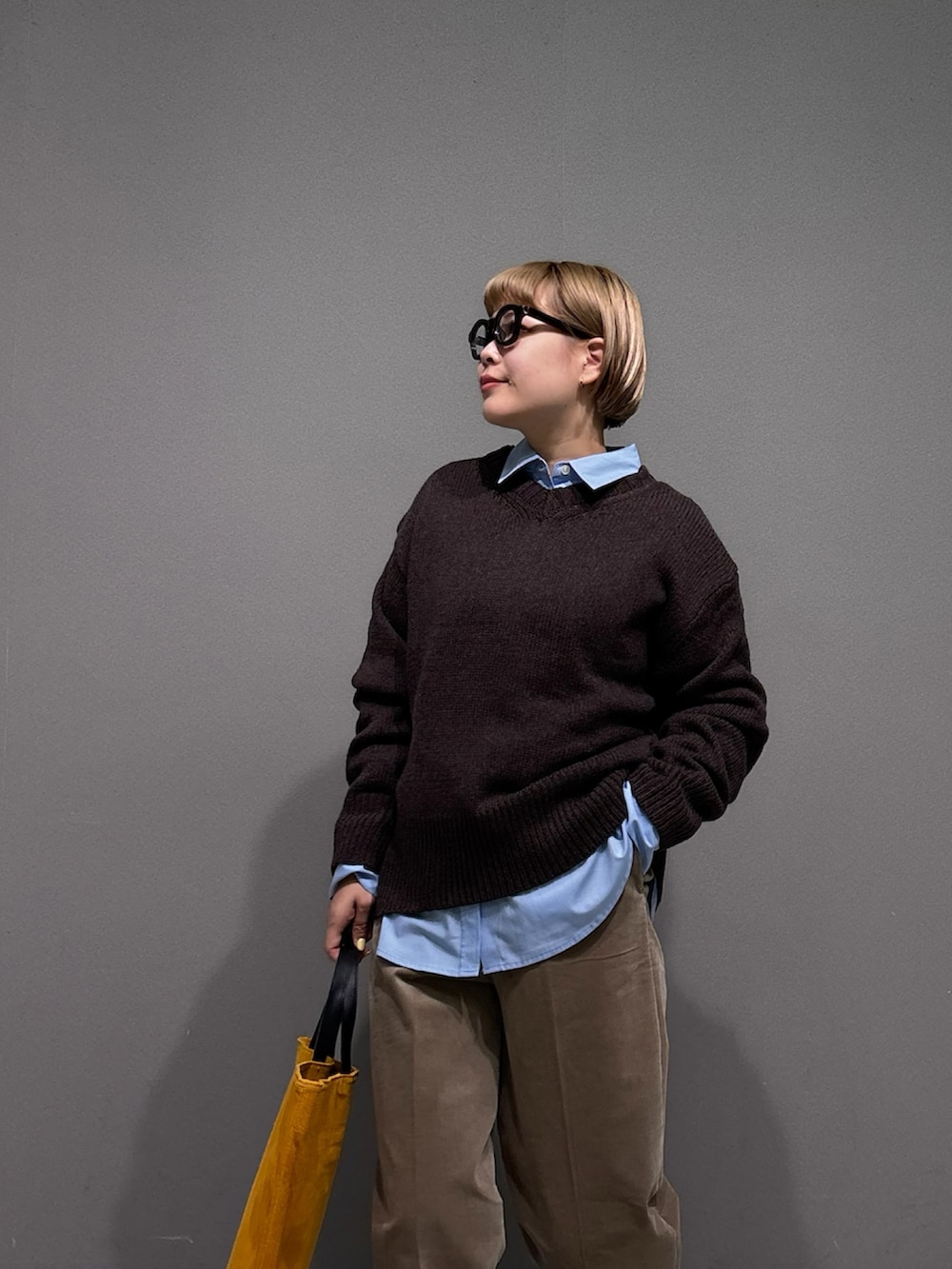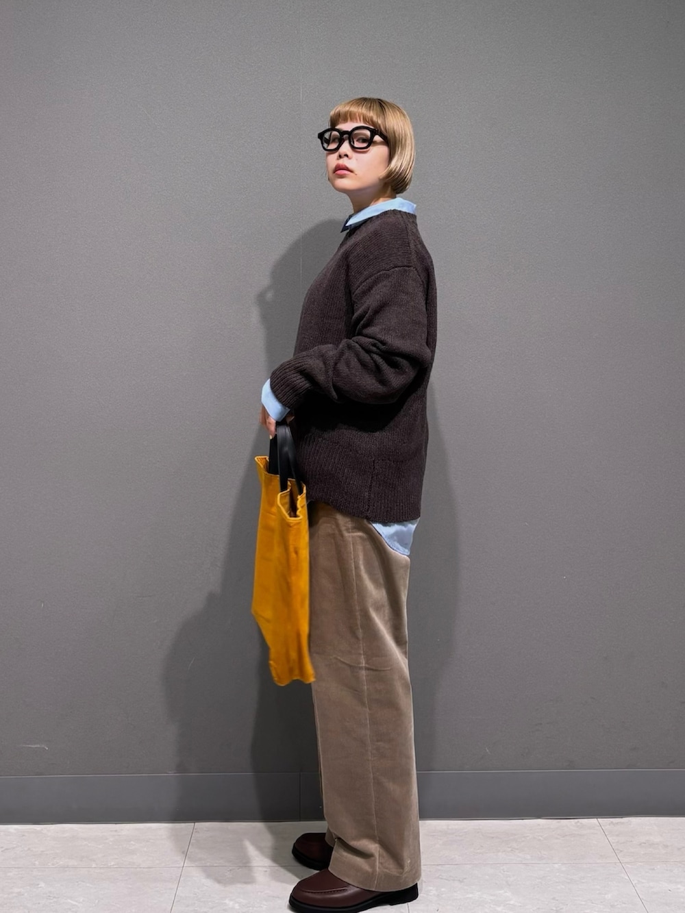 シャツをレイヤードし、足元はローファー。