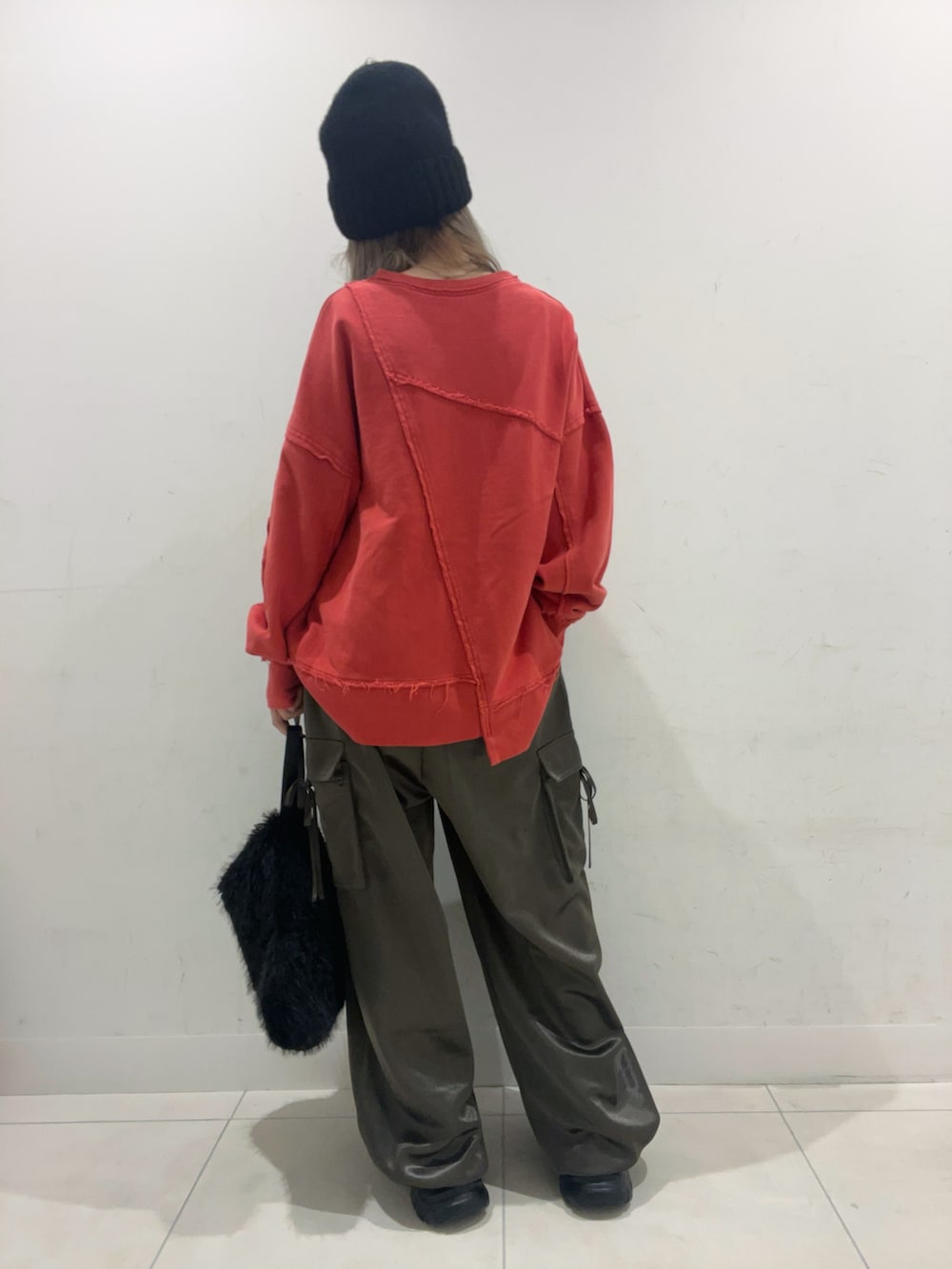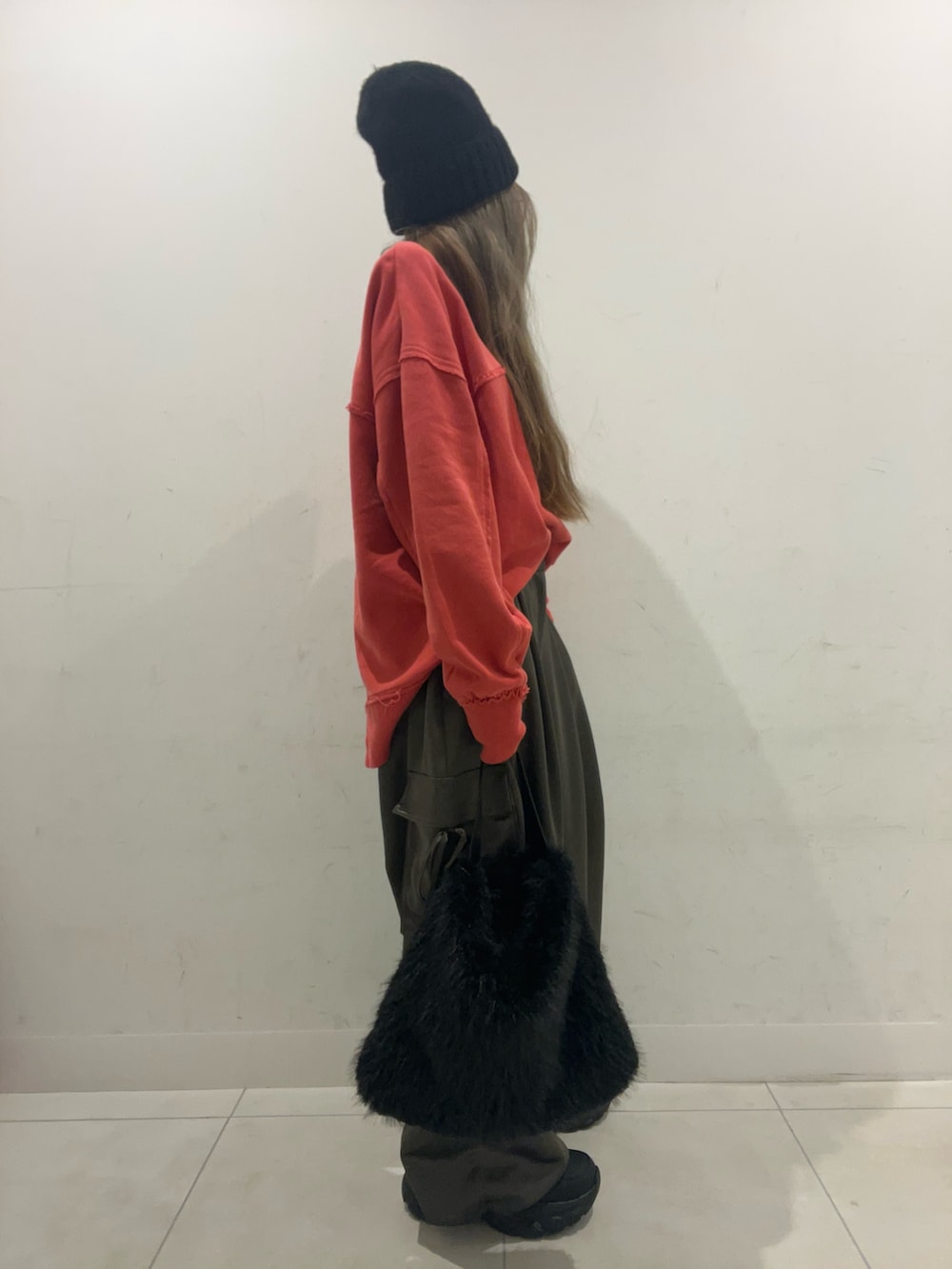深みのあるカーキパンツに、赤のトレーナーを合わせて秋らしい暖色×アースカラーのバランスを演出しました♪ブーツとファーバッグで季節感と重厚感をプラスしてカジュアルだけど大人っぽさもあるコーデに仕上げました♡