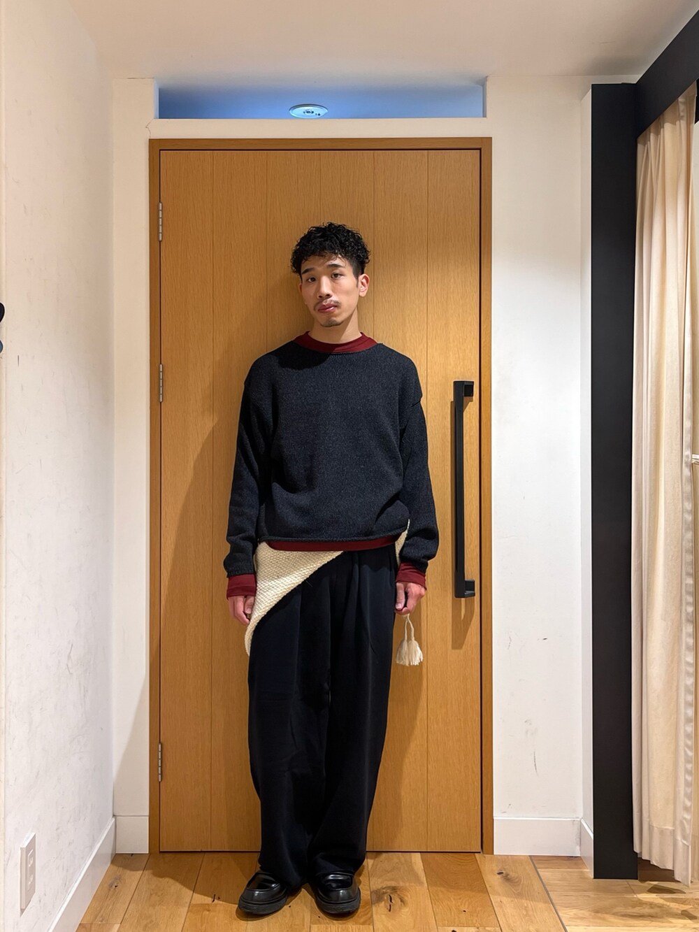 インナーに仕込んだワインのような赤がトップスの黒をさらに引き締め、テープヤーンの特徴的な杢の不安定さもインナーの赤をより艶やかに見せます。