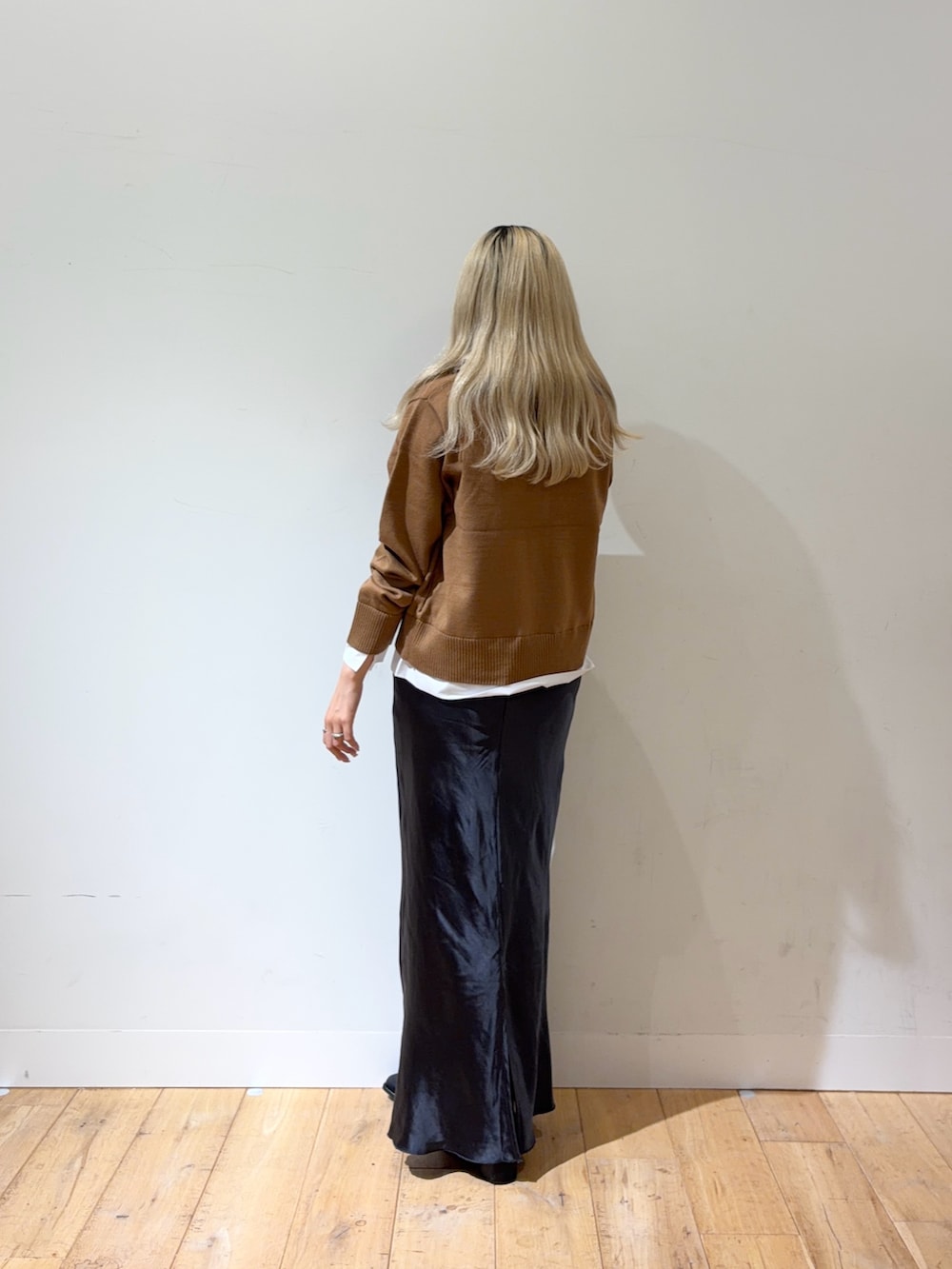キレイめにボトムはサテンスカートを合わせました。