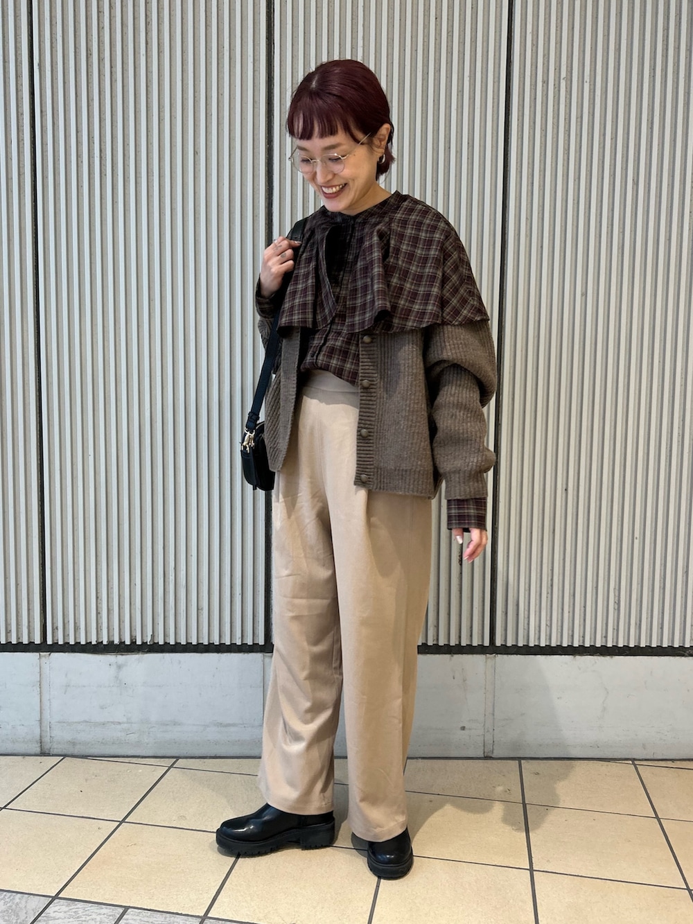 顔周りが華やかになるチェックのケープブラウスを主役に、ブラウンのワントーンコーデです。