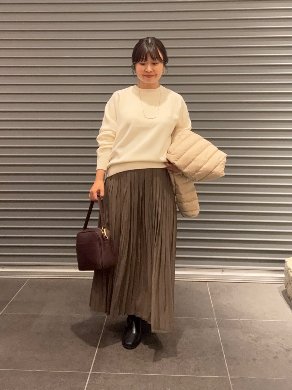 ランダムプリーツスカートはウエスト総ゴムで楽に履けてキレイ見えするので、お仕事服にも。